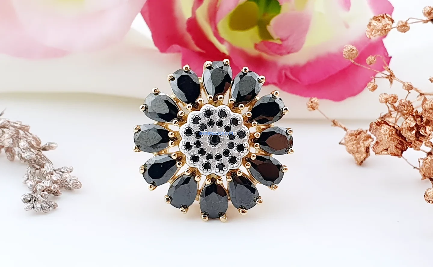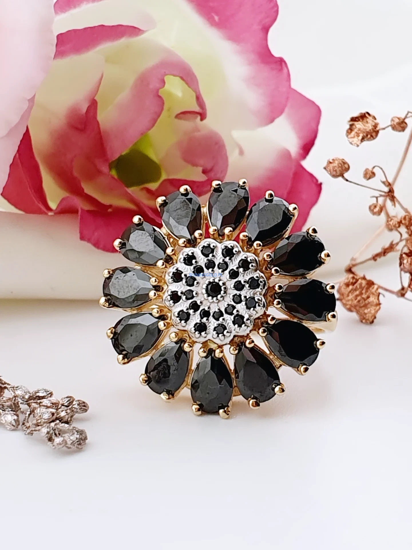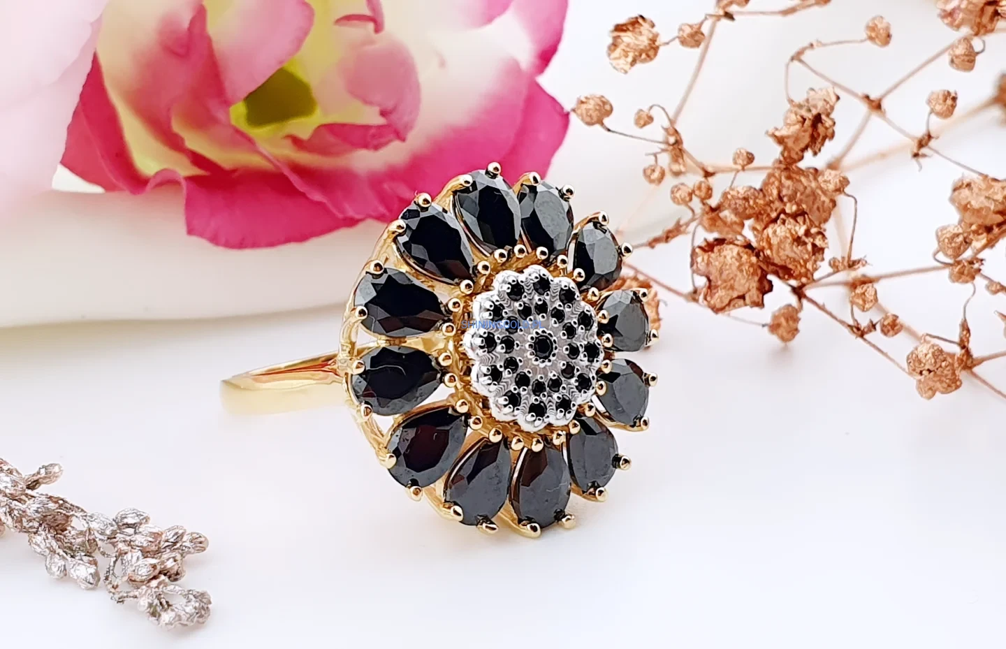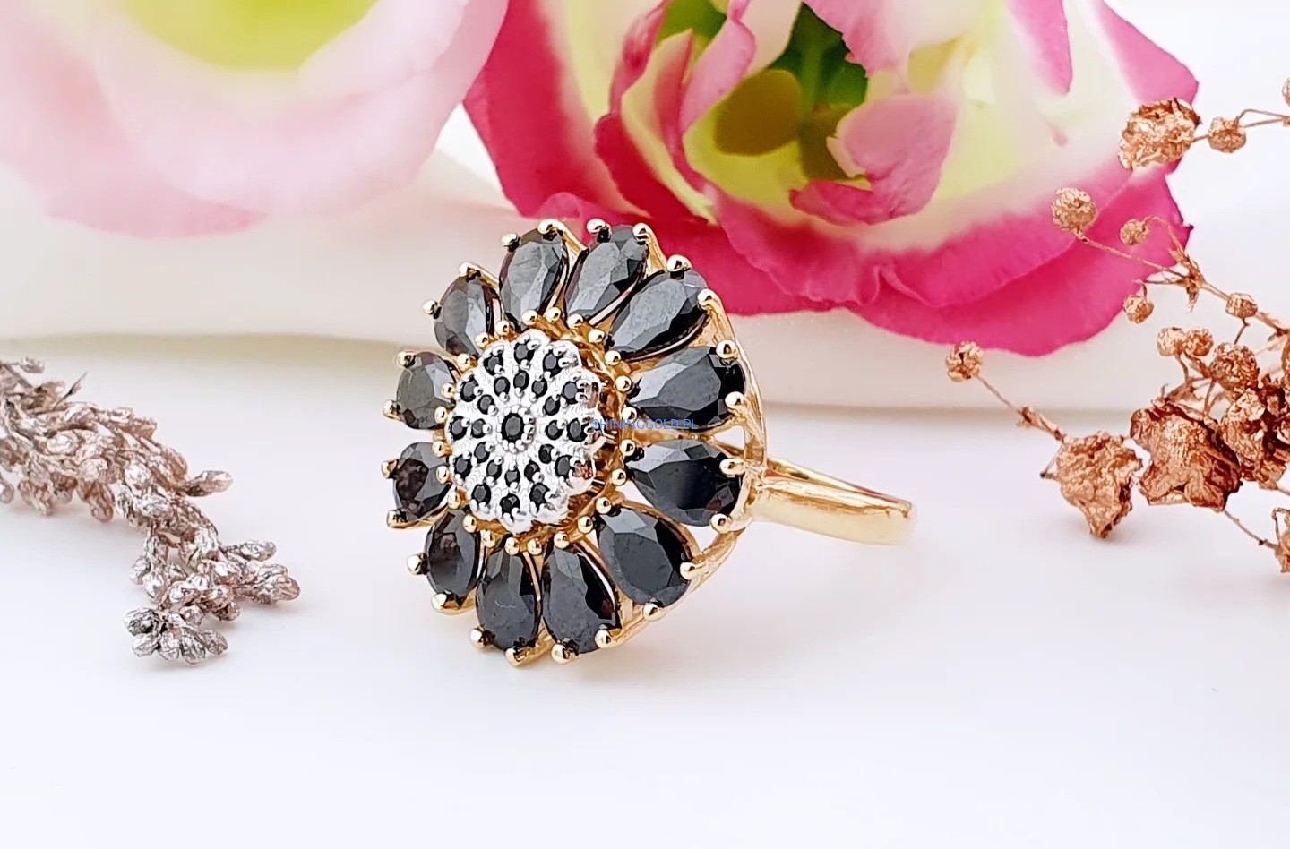 Wyrazisty pierścionek wykonany ze złota próby 585, przyciągający uwagę efektowną kompozycją czarnych onyksów. Kamienie ułożone w kształt kwiatu tworzą elegancką i bardzo kobiecą formę, a centralna część subtelnie zdobiona jasnymi akcentami dodaje całości wyjątkowego blasku. Kontrast złota i głębokiej czerni onyksów sprawia, że pierścionek prezentuje się niezwykle luksusowo.
