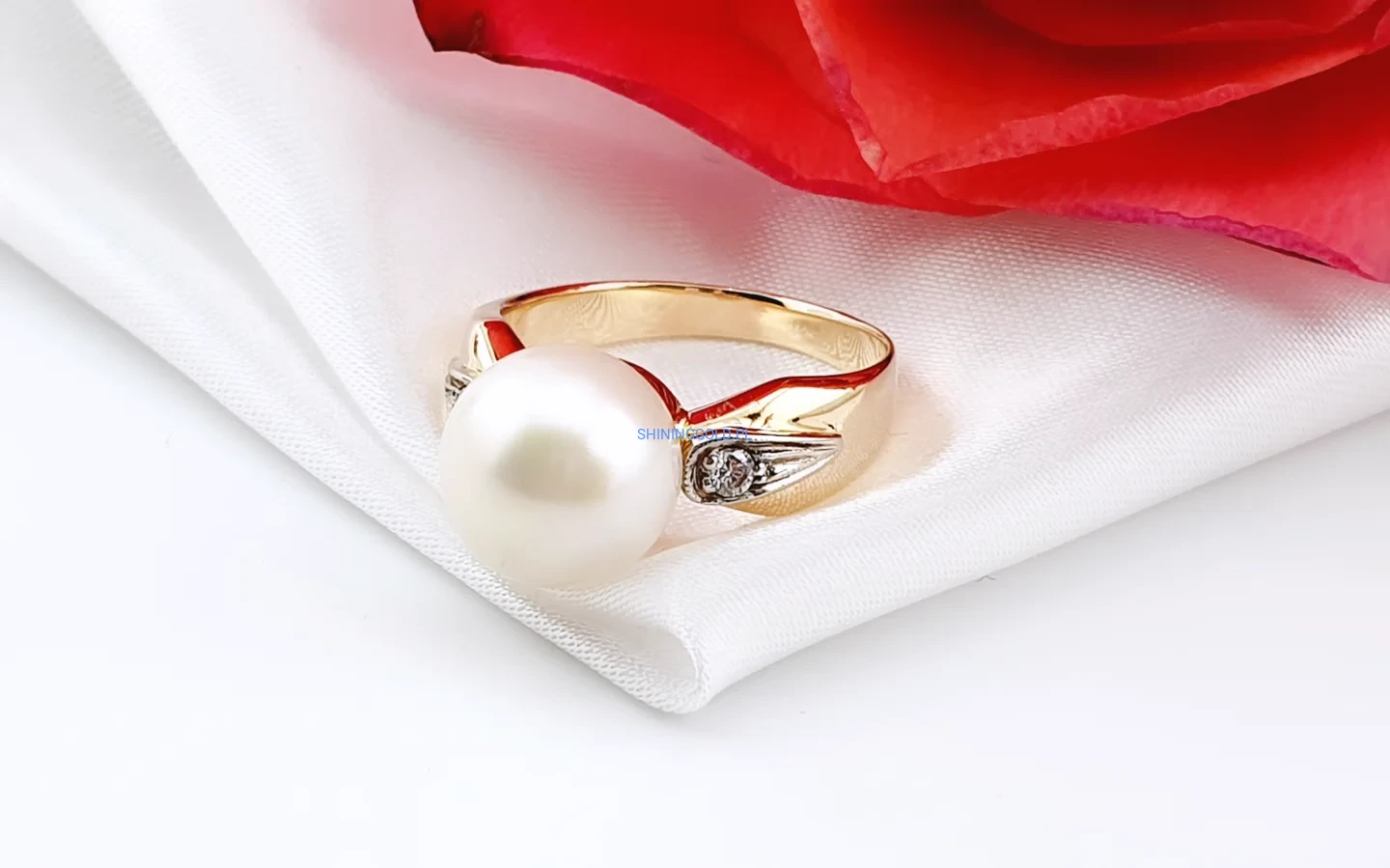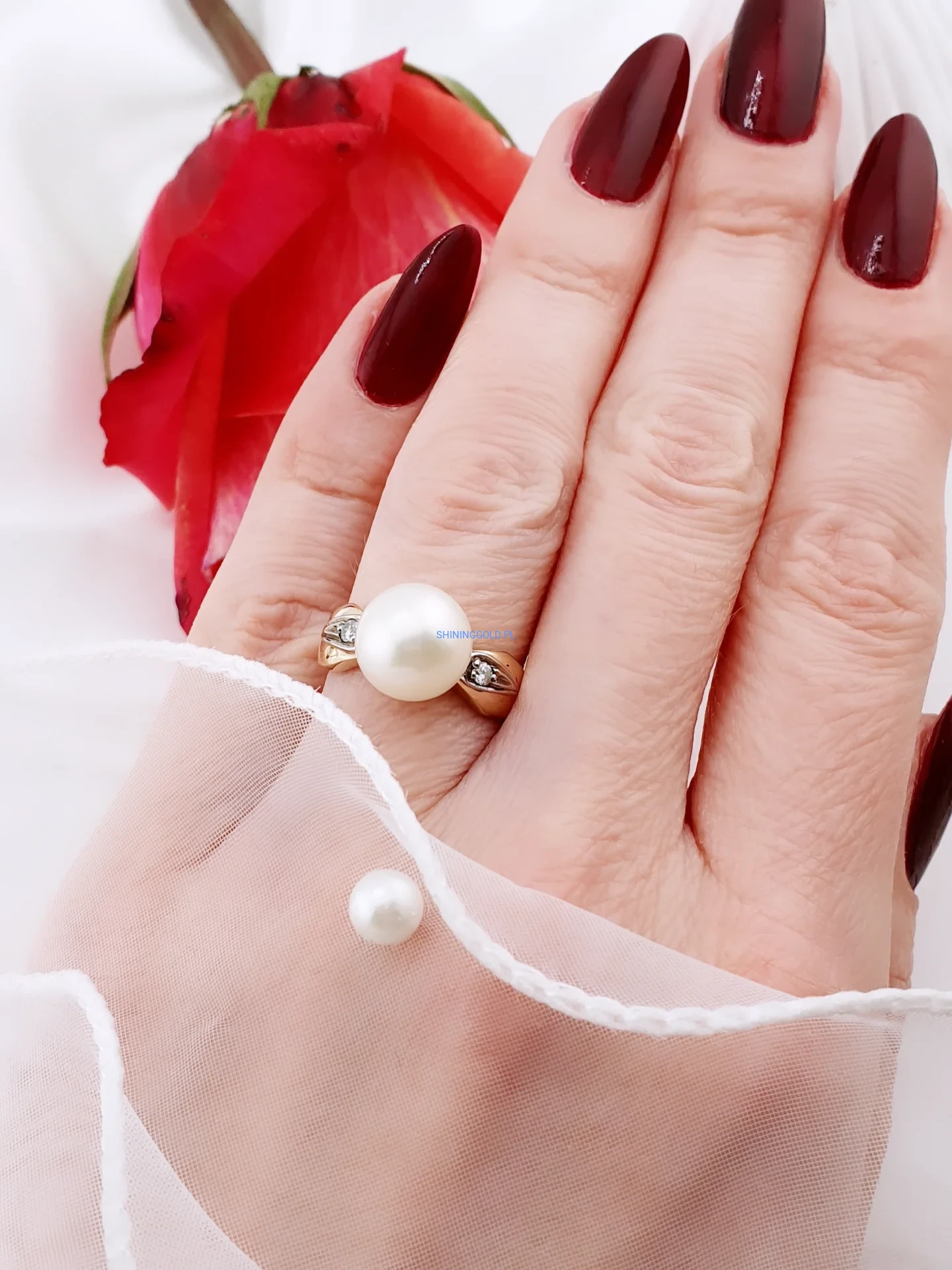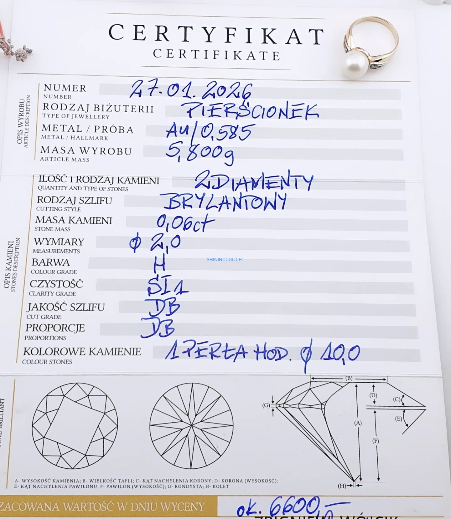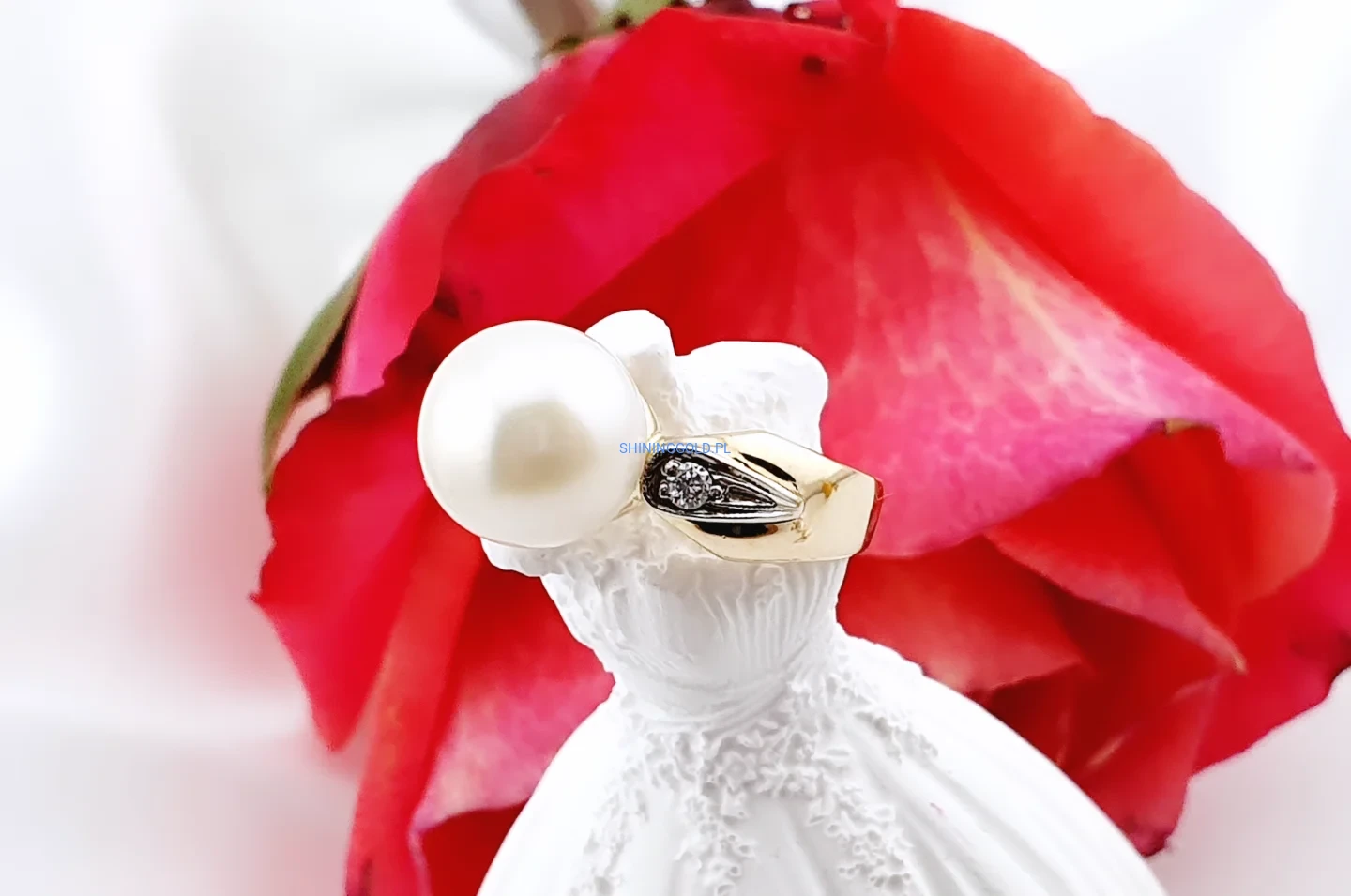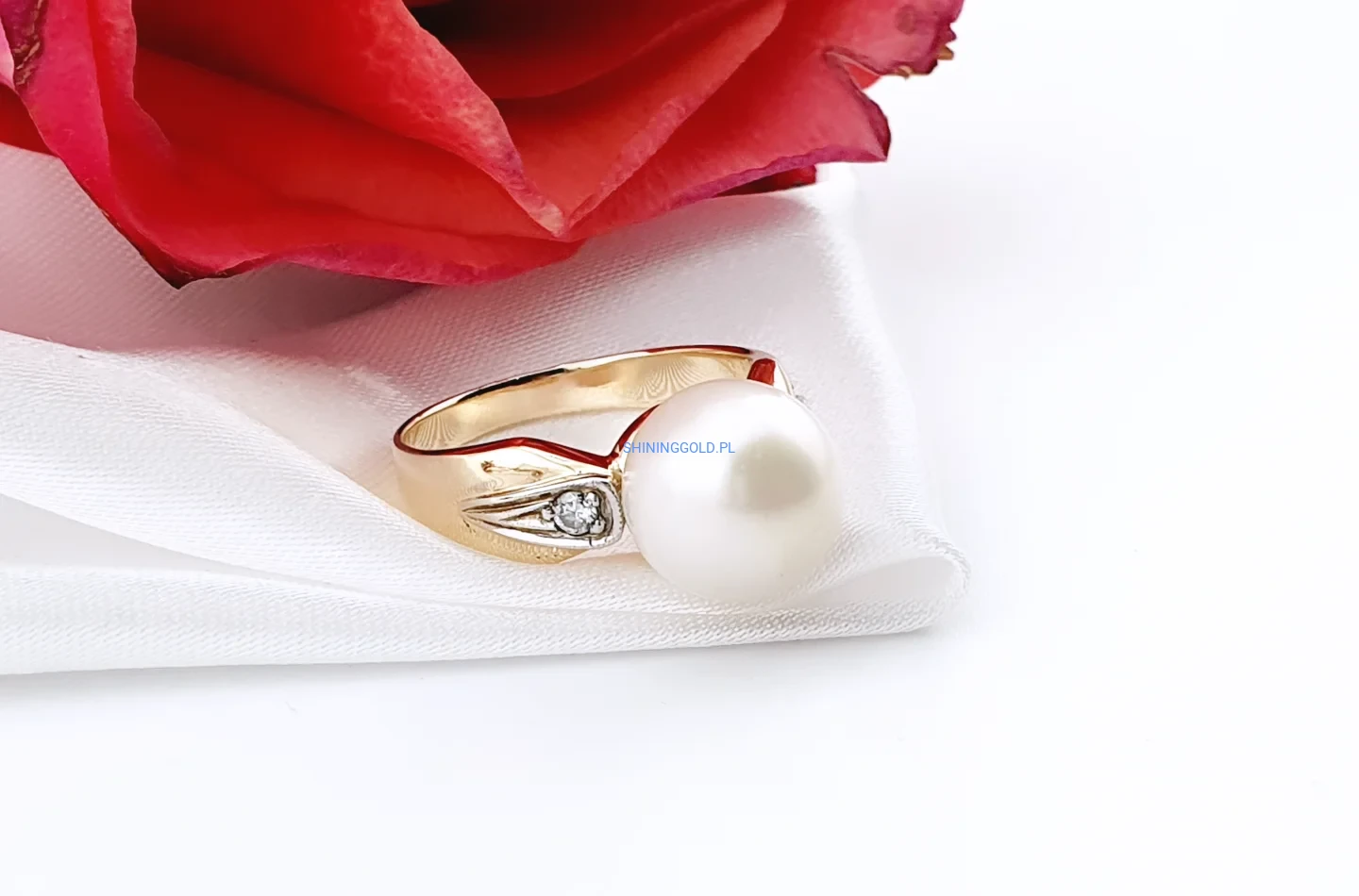 Złoty pierścionek 585 z perłą hodowlaną i diamentami – klasyka w eleganckim wydaniu