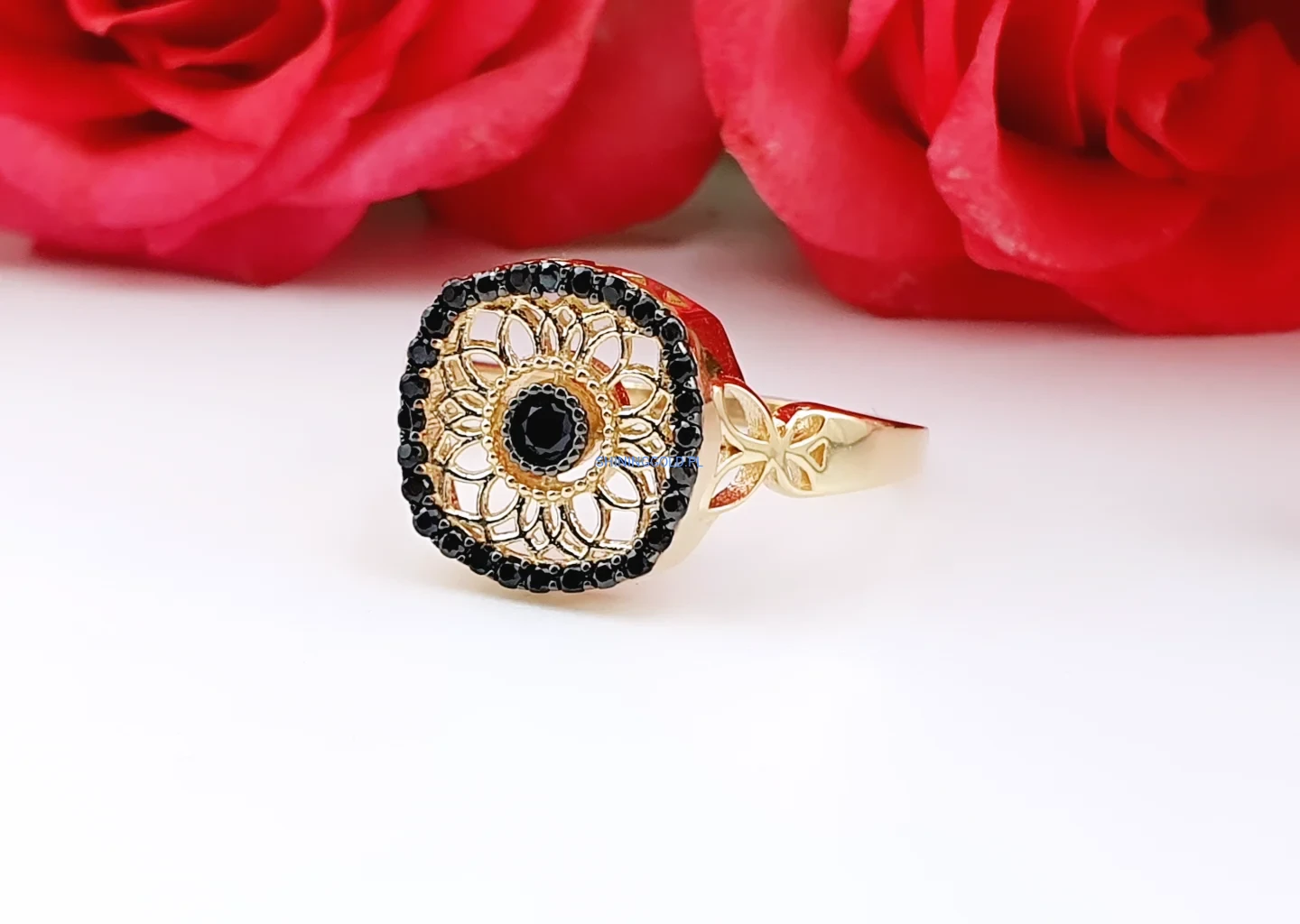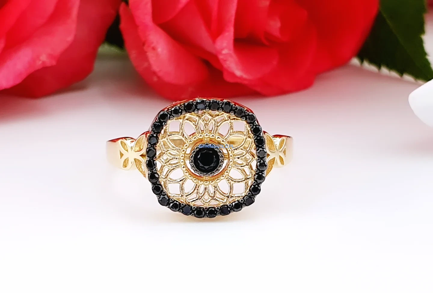 Złoty pierścionek ażurowy z czarnymi cyrkoniami (039A)