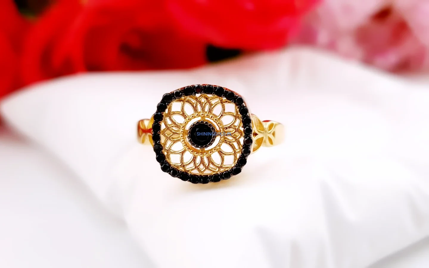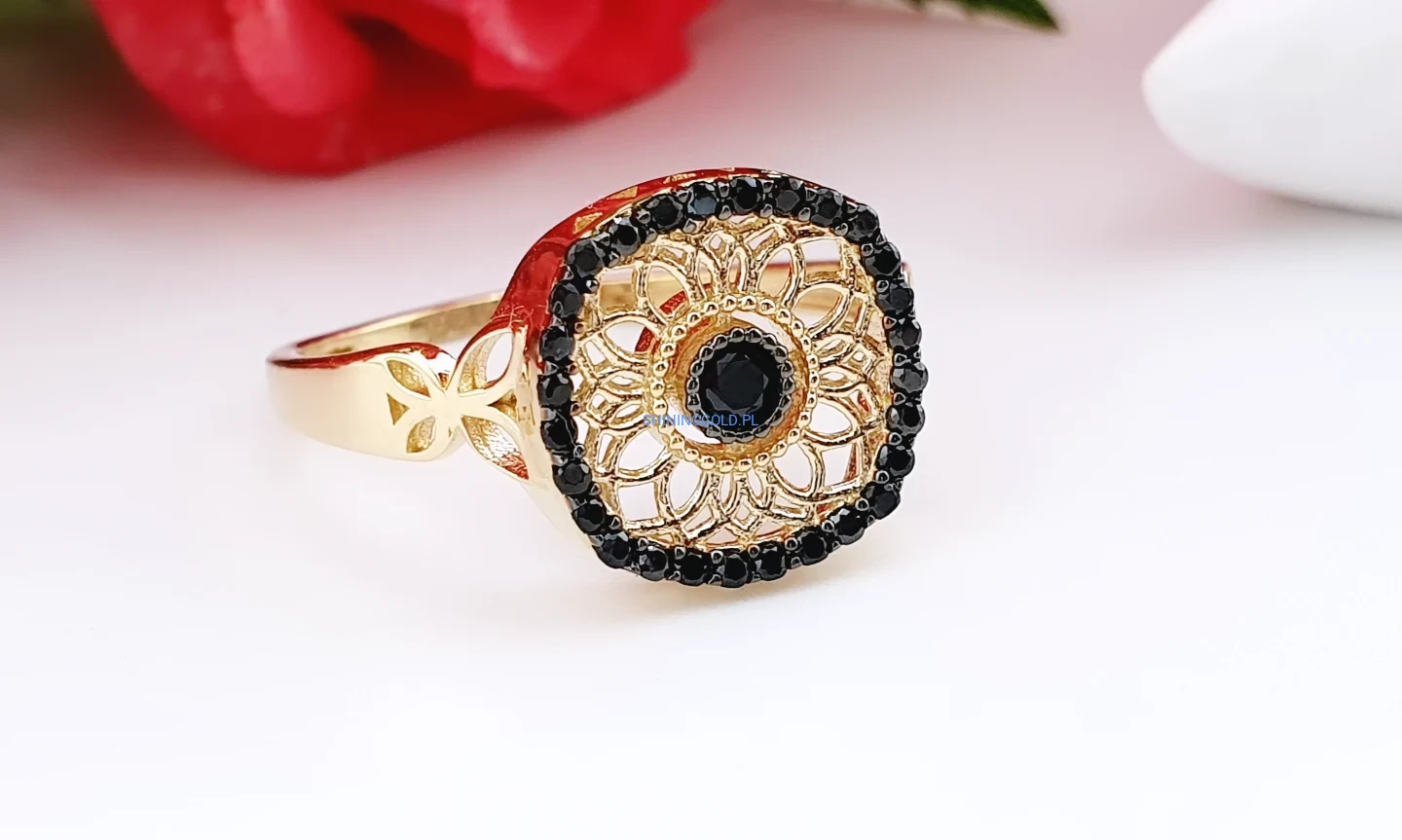 Złoty pierścionek 585 – ażurowy wzór i czarne cyrkonie