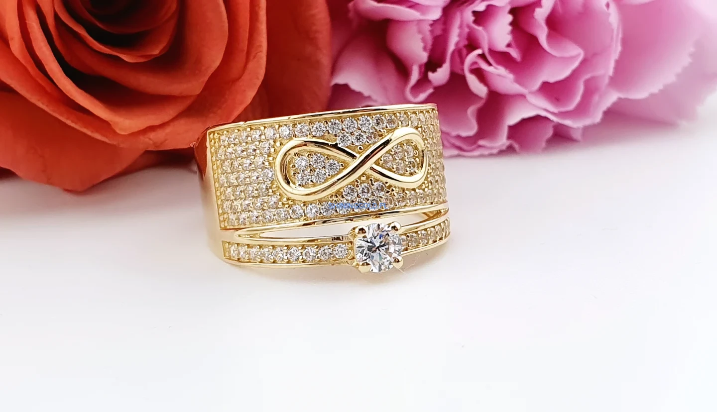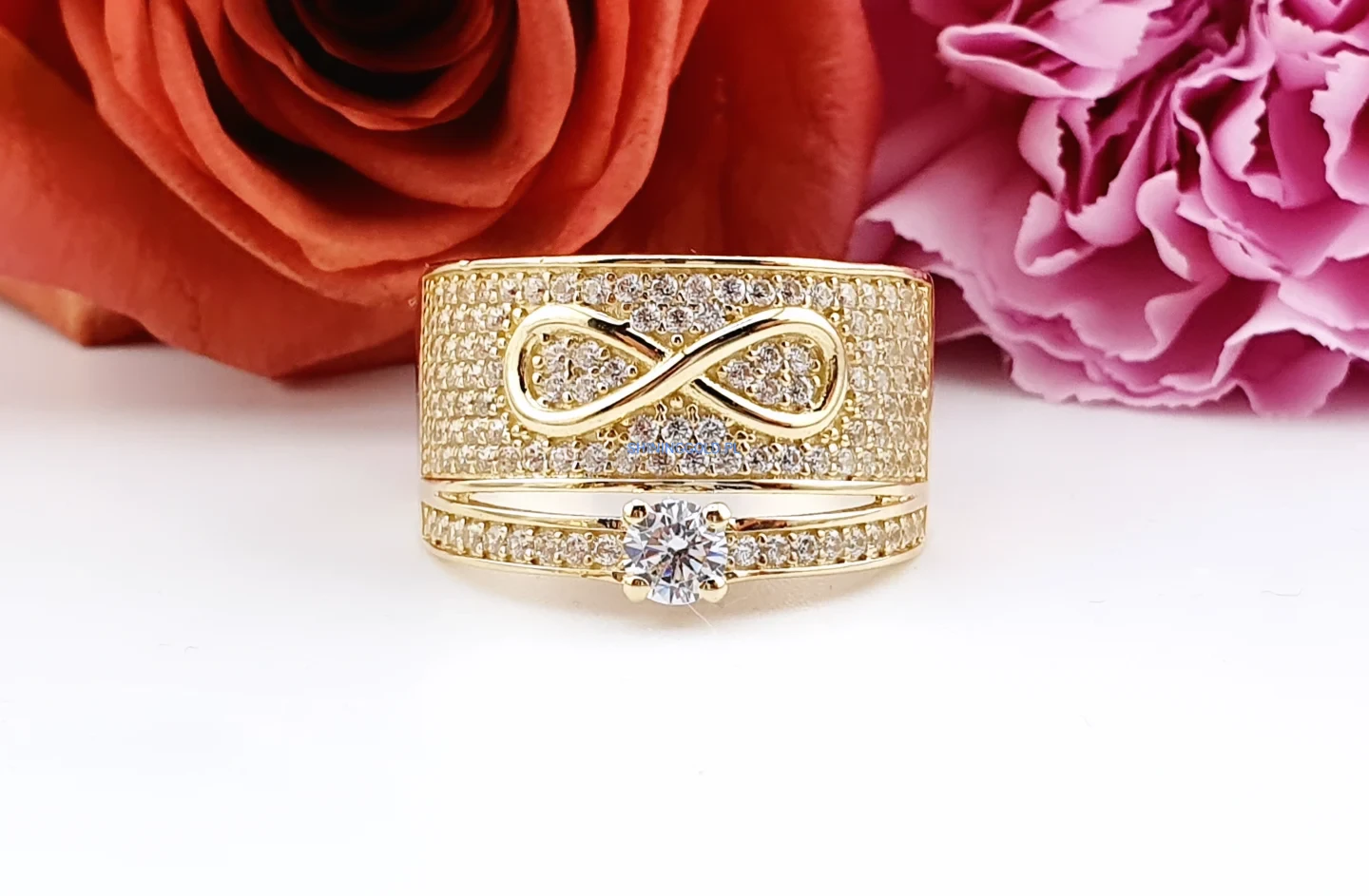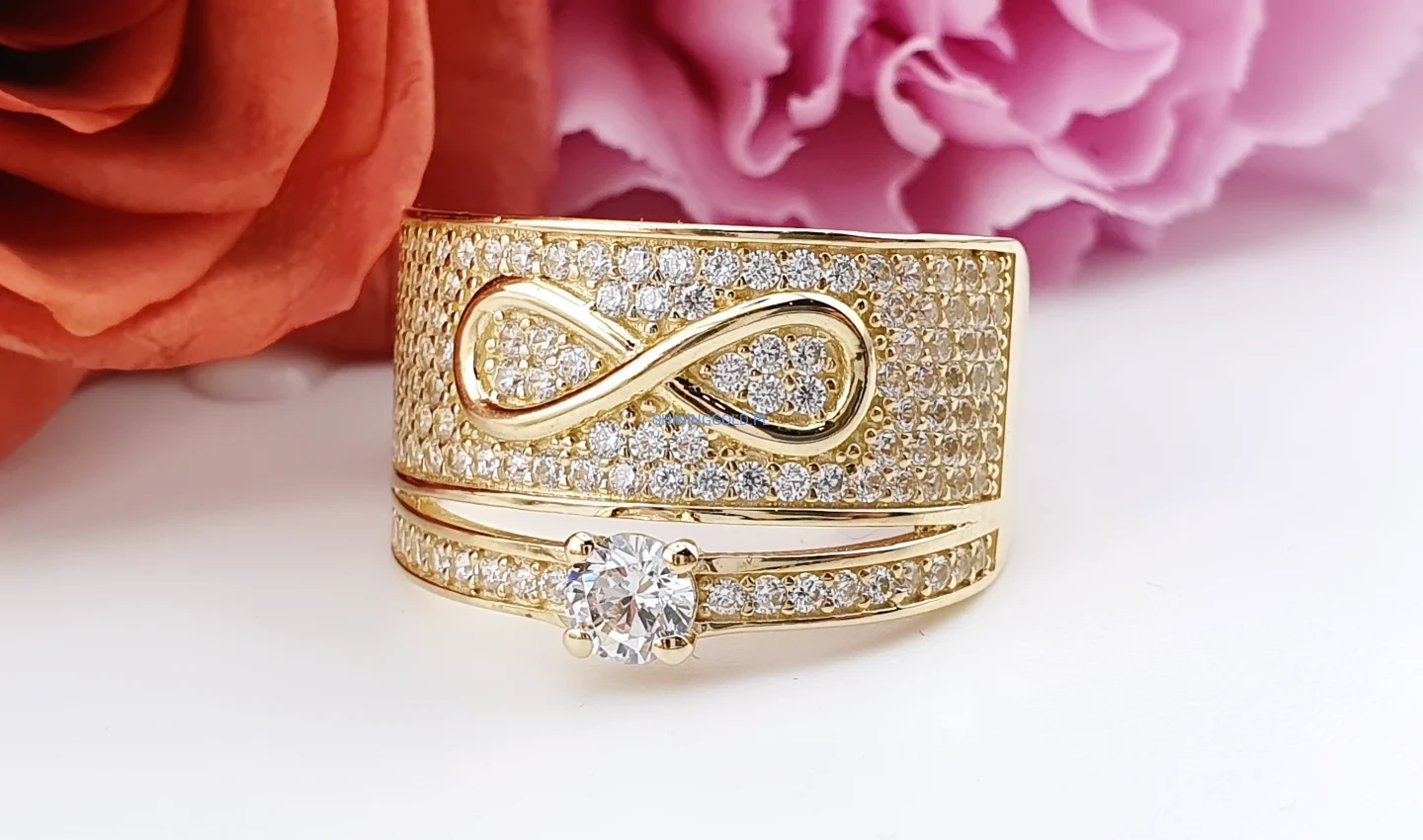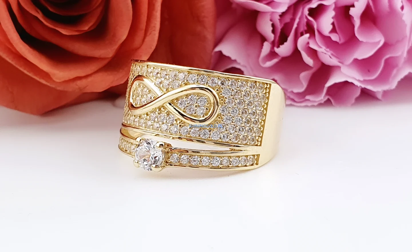 Efektowny pierścionek wykonany ze złota próby 585, ozdobiony licznymi cyrkoniami oraz motywem nieskończoności. Dodatkowy kamień centralny nadaje całości wyjątkowego blasku i podkreśla jego elegancki charakter.