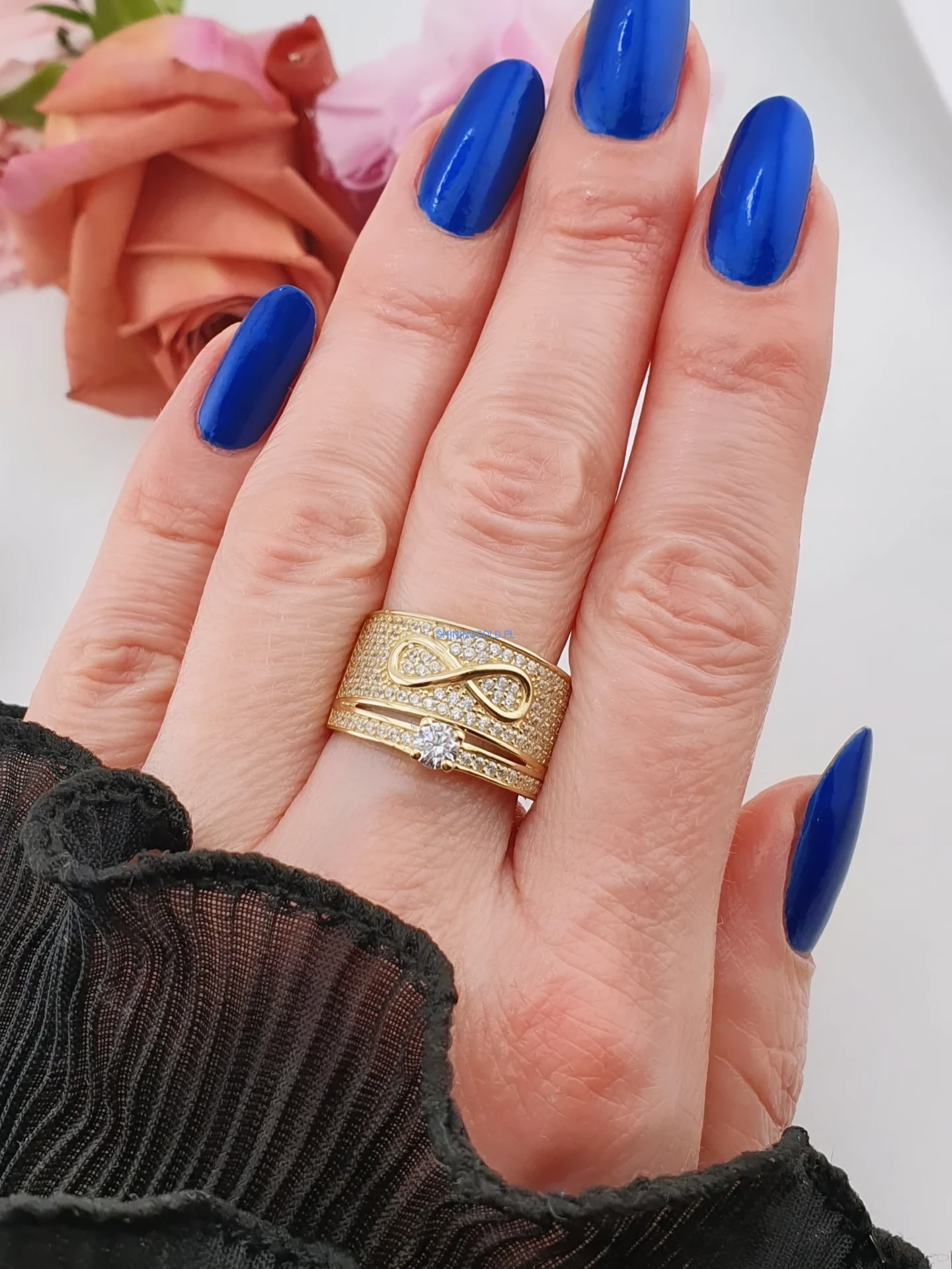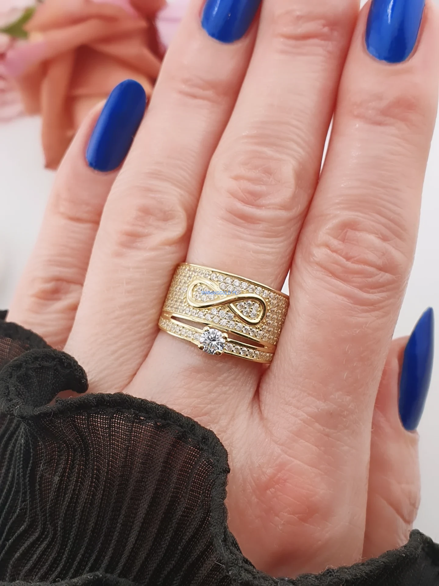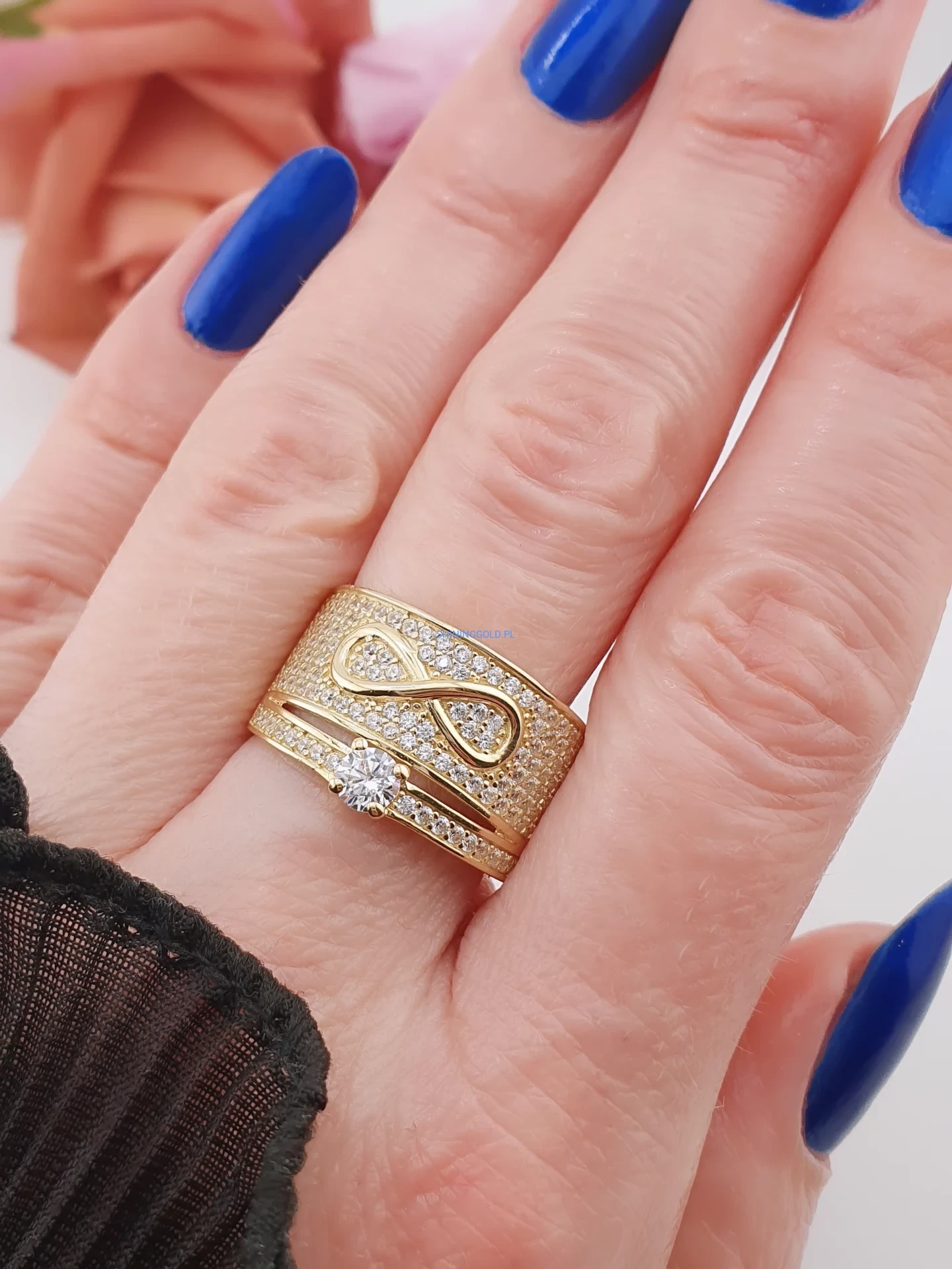Złoty pierścionek 585 nieskończoność z cyrkoniami – szeroki
