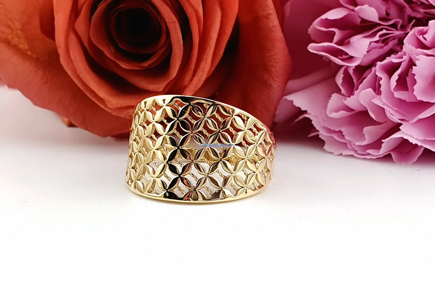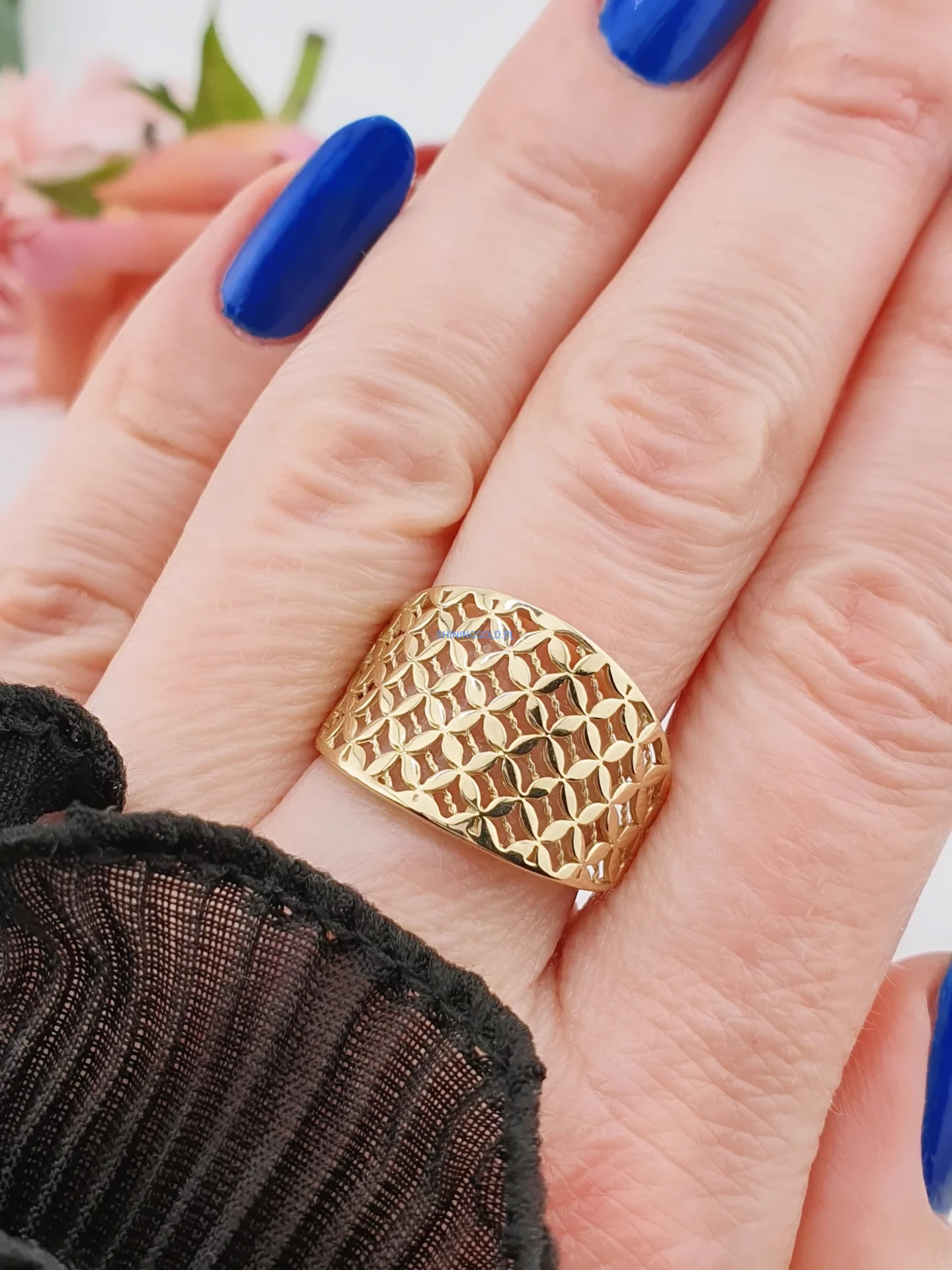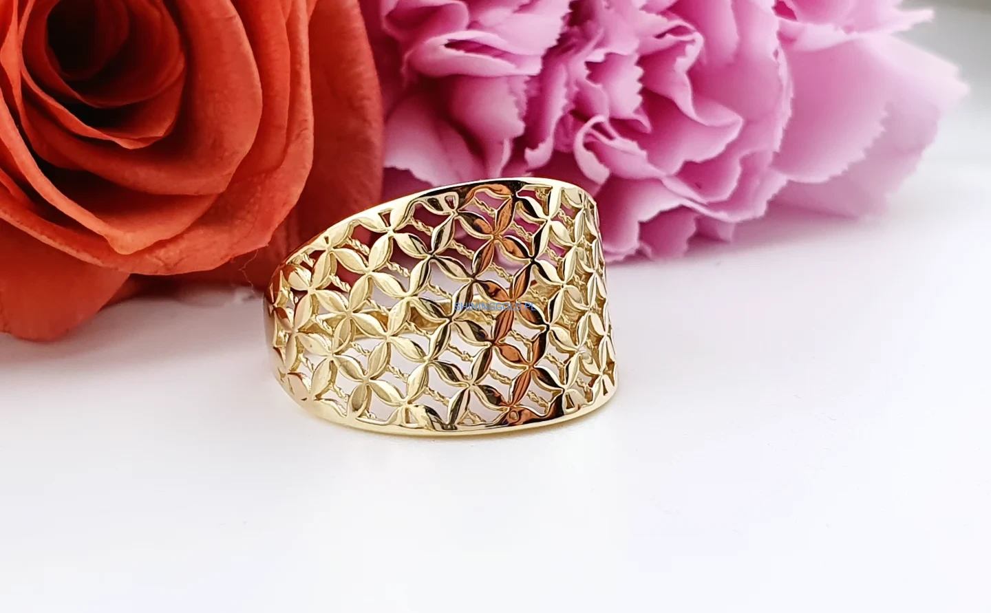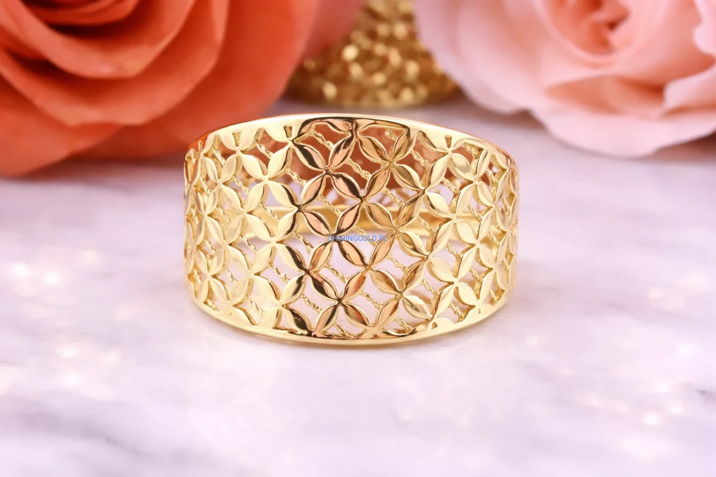 Złoty pierścionek – szeroki, ażurowy wzór (063A)