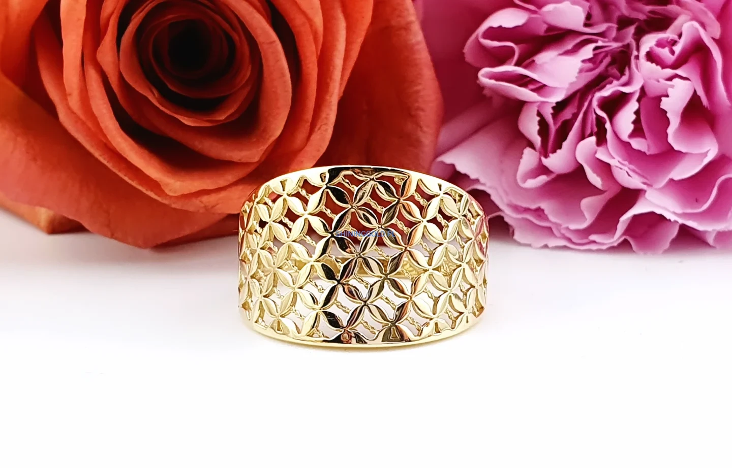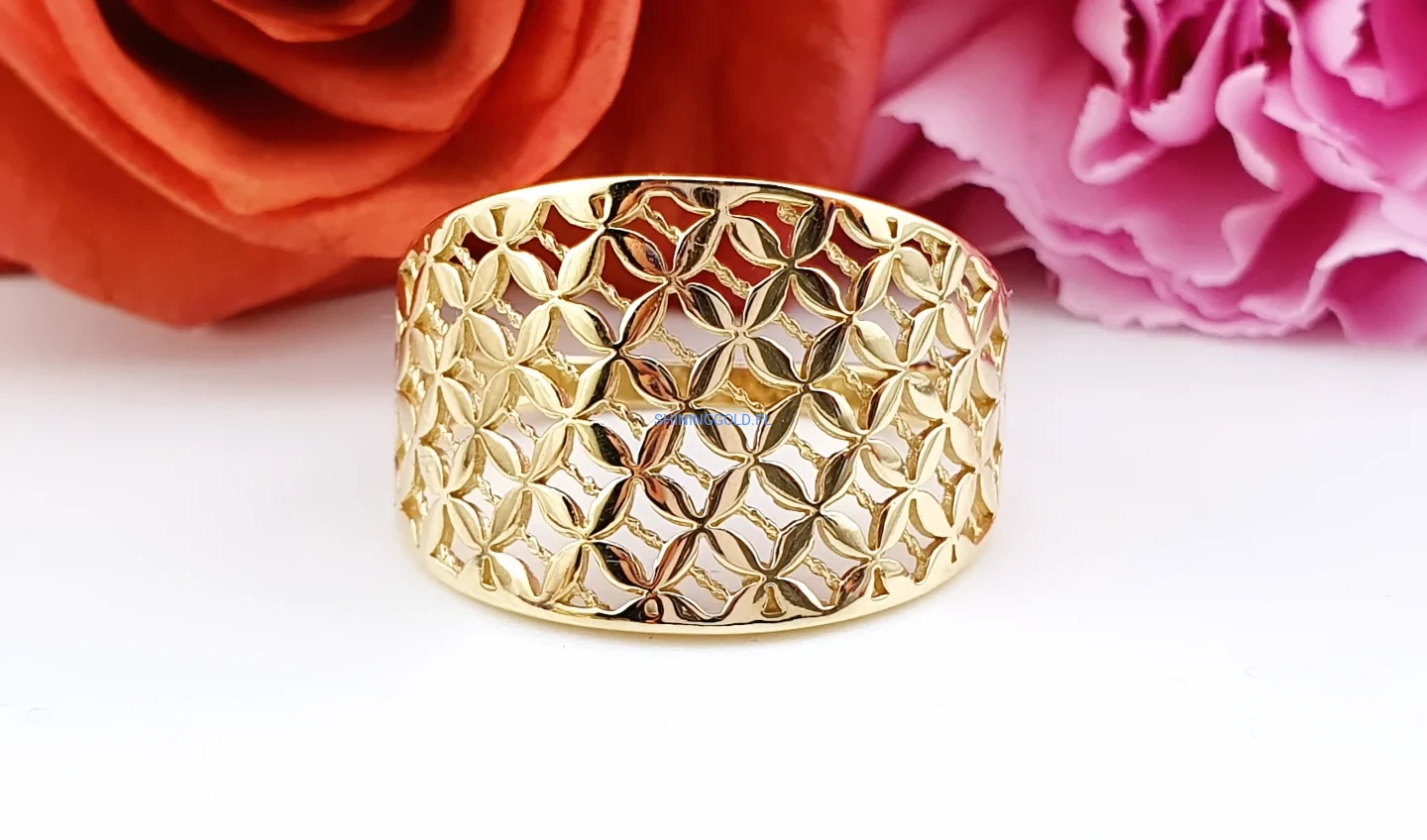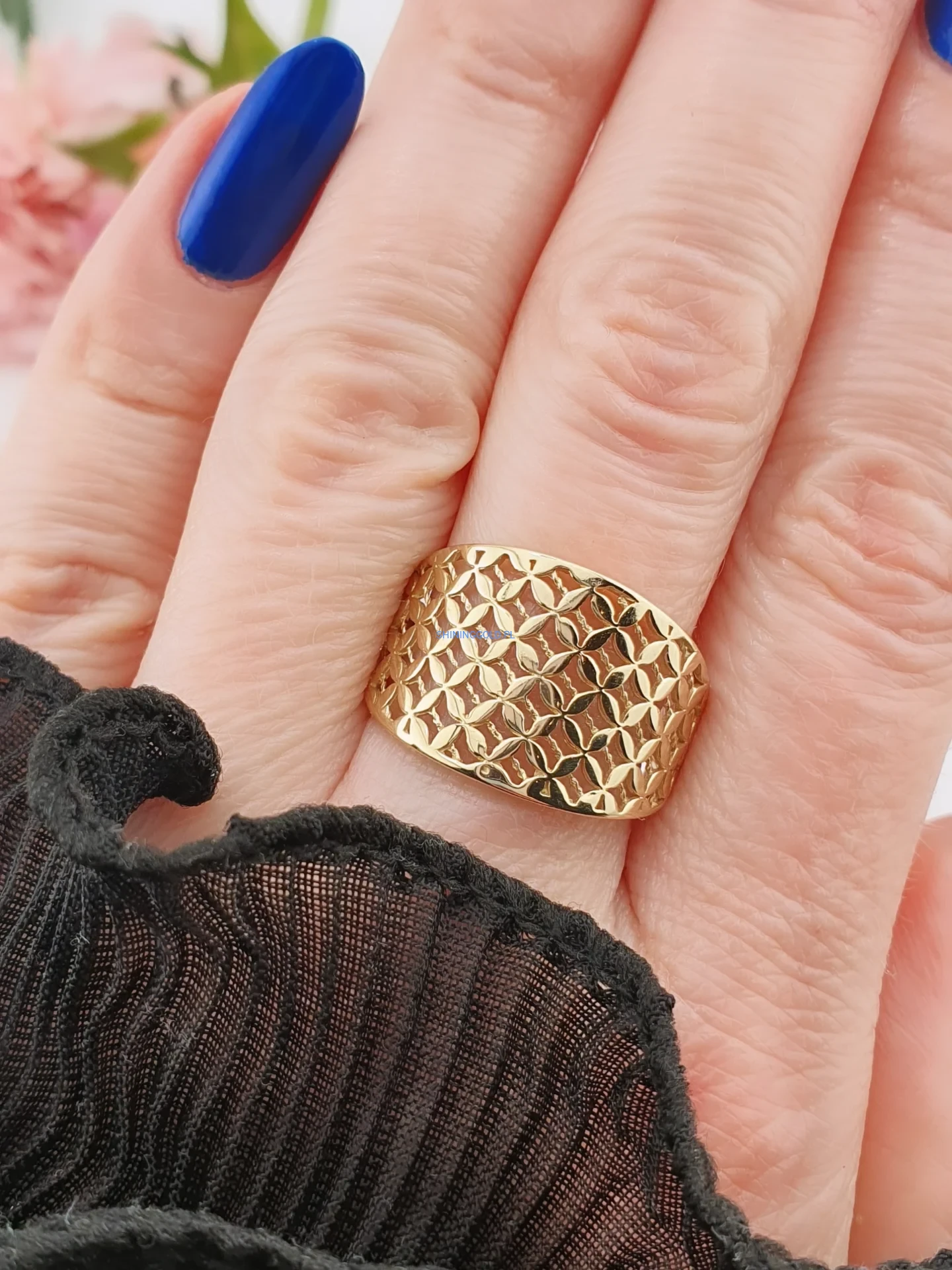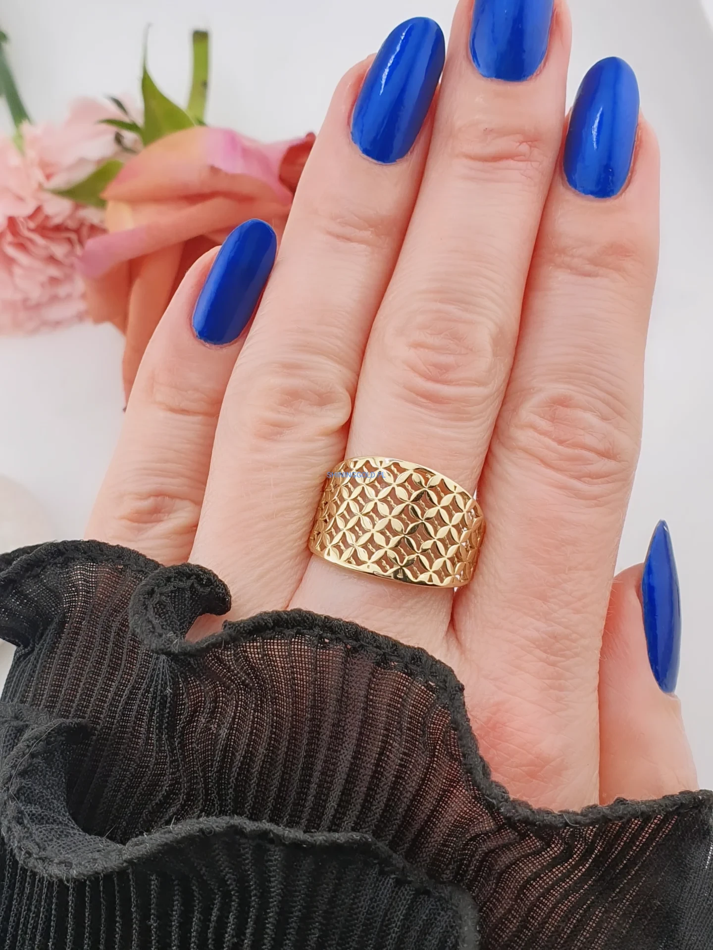Złoty pierścionek – szeroki, ażurowy wzór (063A)