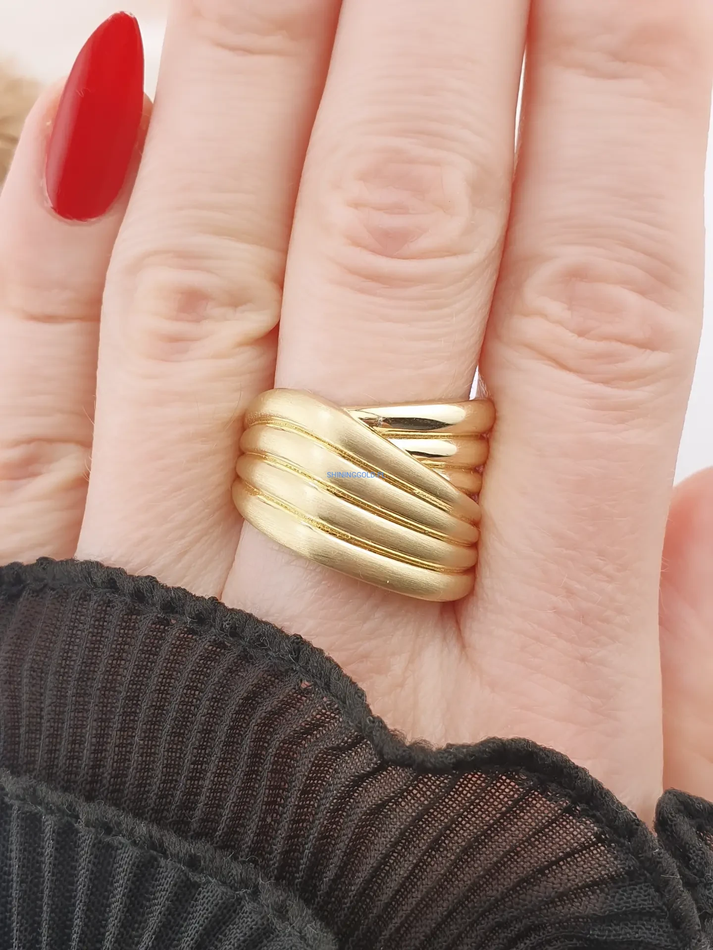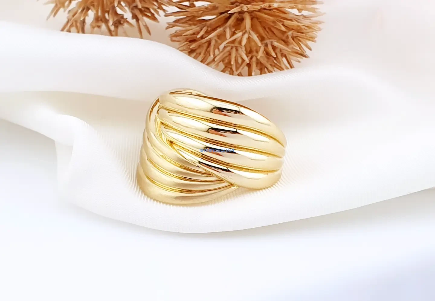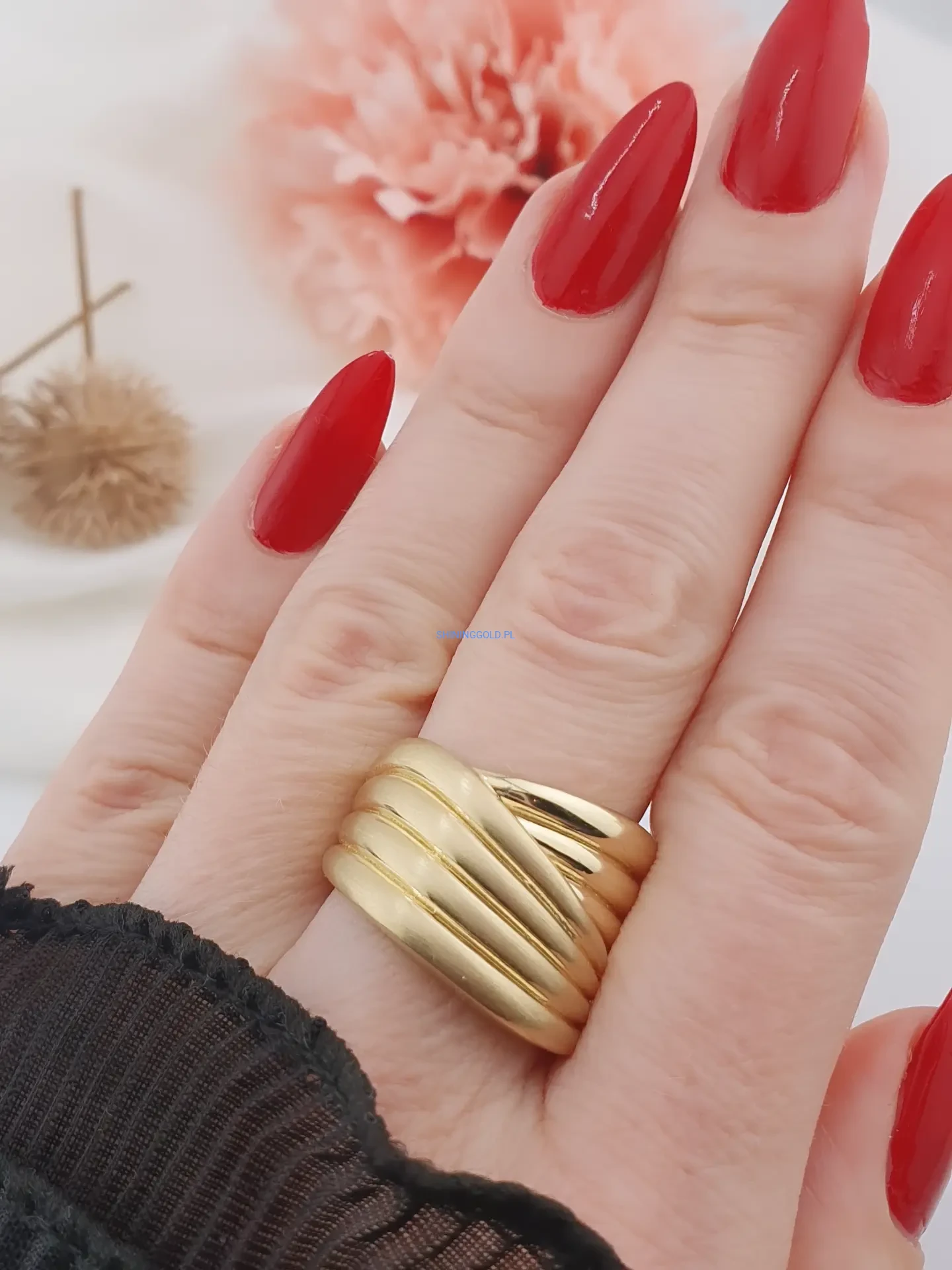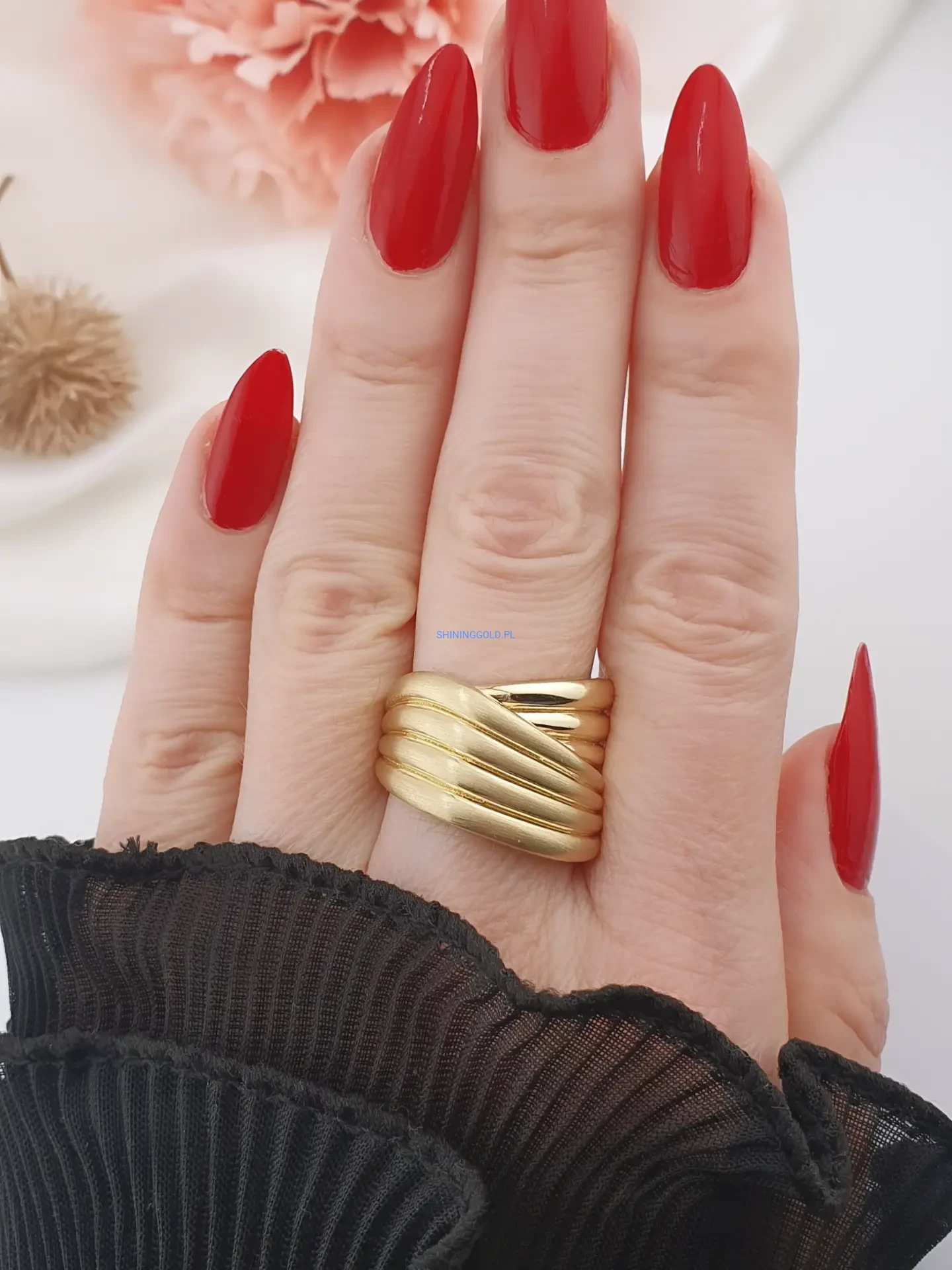 Ten wyjątkowy pierścionek z żółtego złota zachwyca swoją formą i połyskiem. Szeroki, warstwowy wzór tworzy efektowną kompozycję, która pięknie prezentuje się na dłoni. To doskonały wybór dla kobiet ceniących wyrafinowany styl i ponadczasowe piękno.