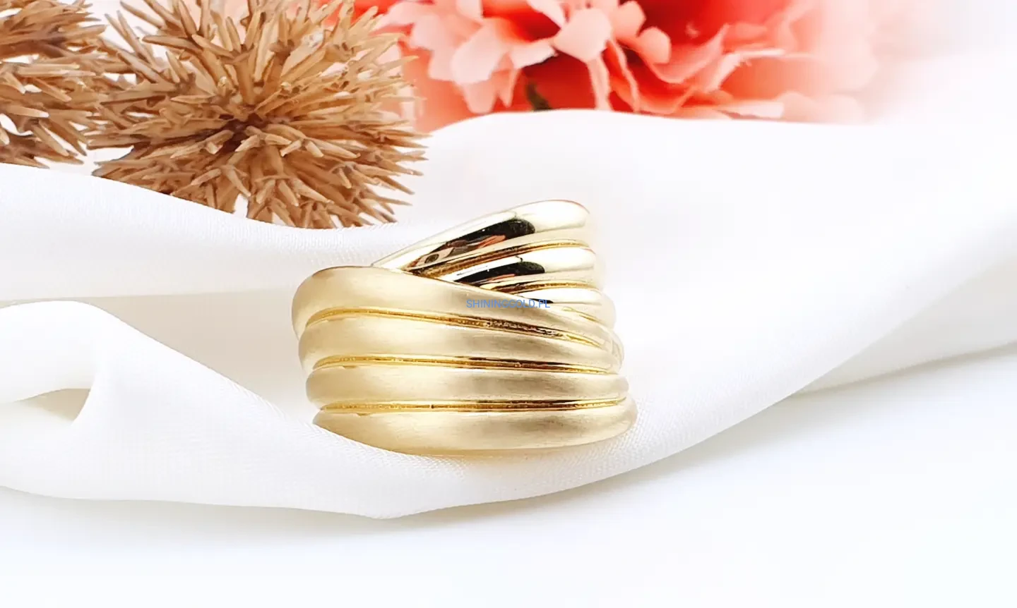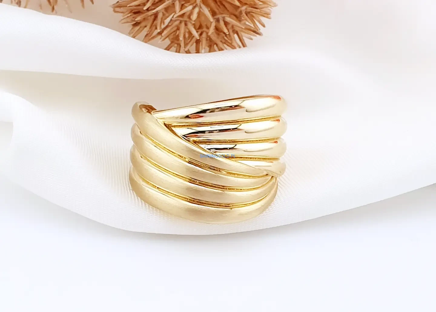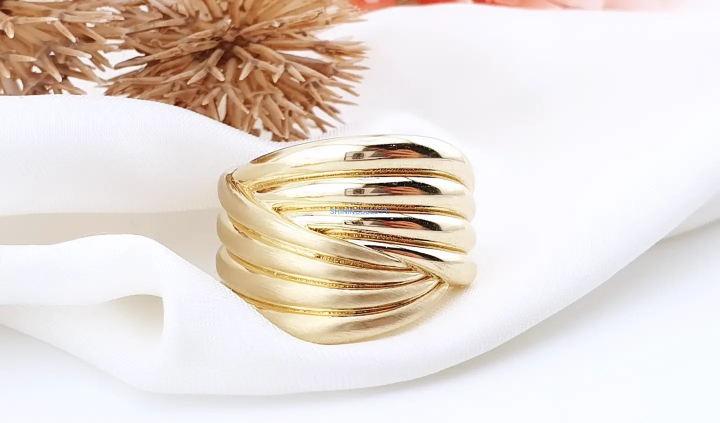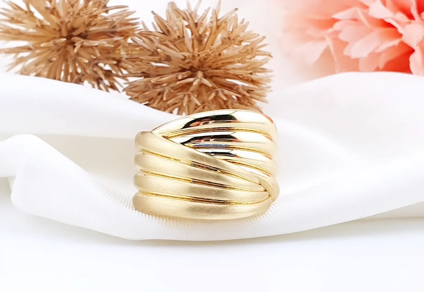 Ten wyjątkowy pierścionek z żółtego złota zachwyca swoją formą i połyskiem. Szeroki, warstwowy wzór tworzy efektowną kompozycję, która pięknie prezentuje się na dłoni. To doskonały wybór dla kobiet ceniących wyrafinowany styl i ponadczasowe piękno.