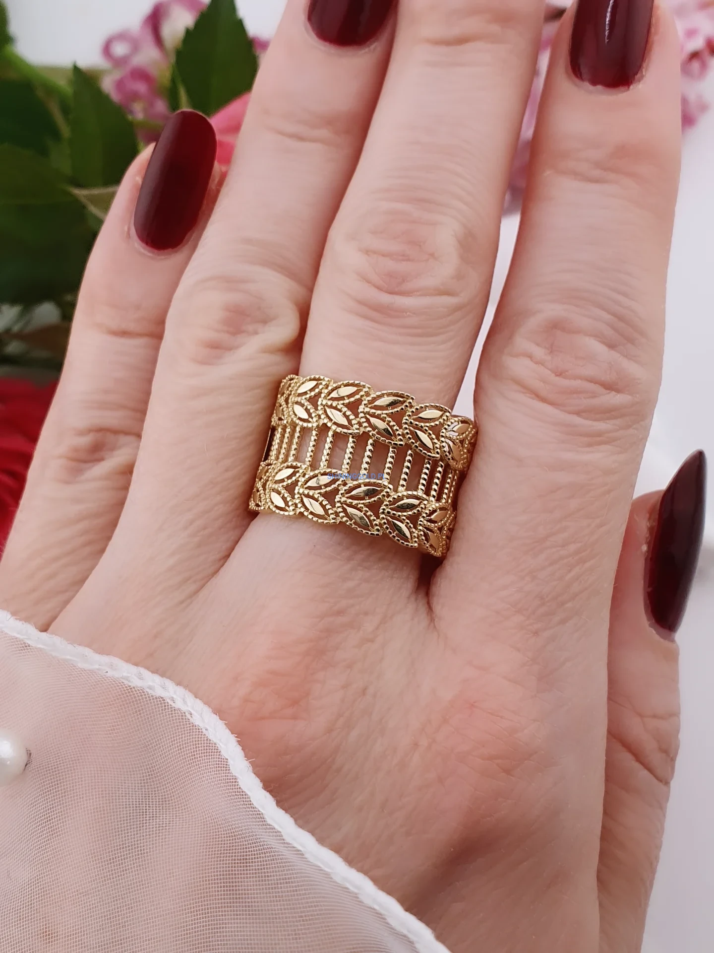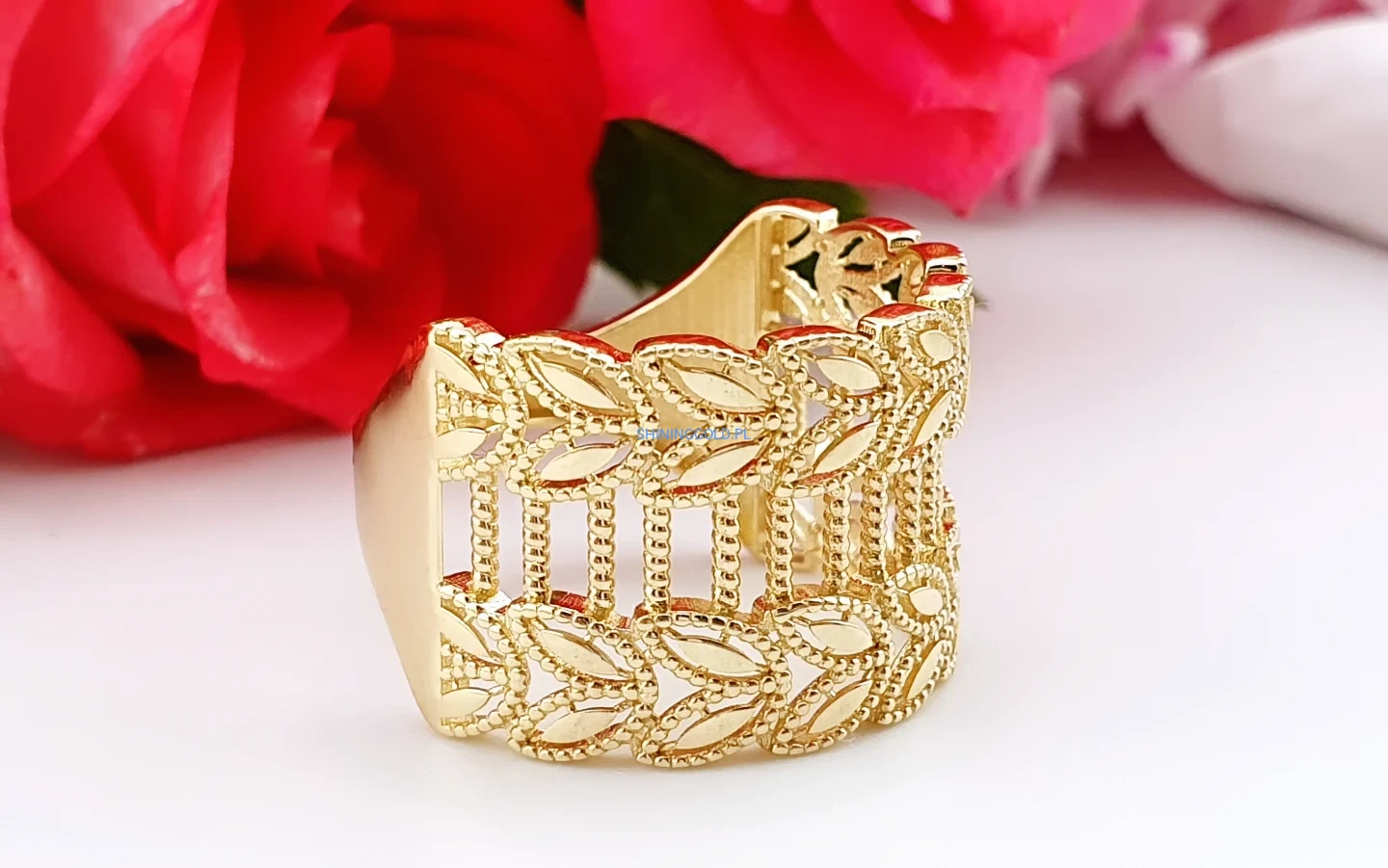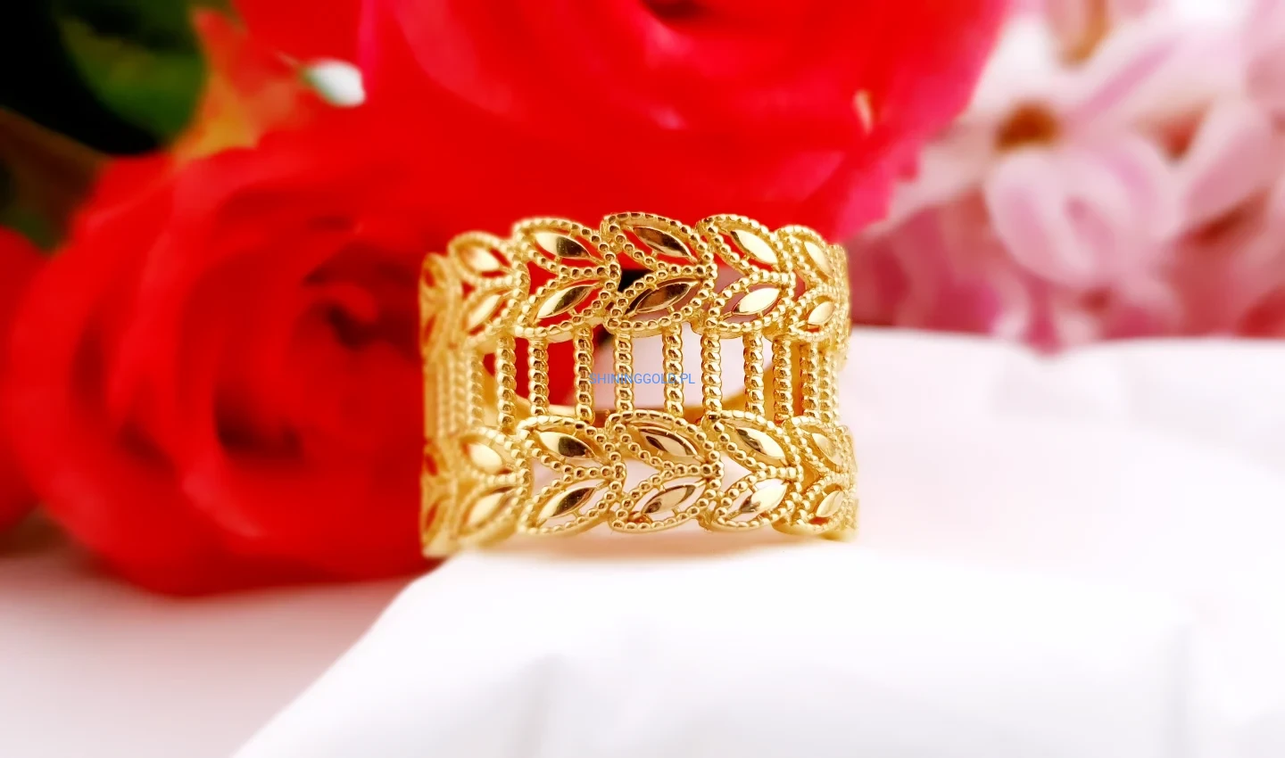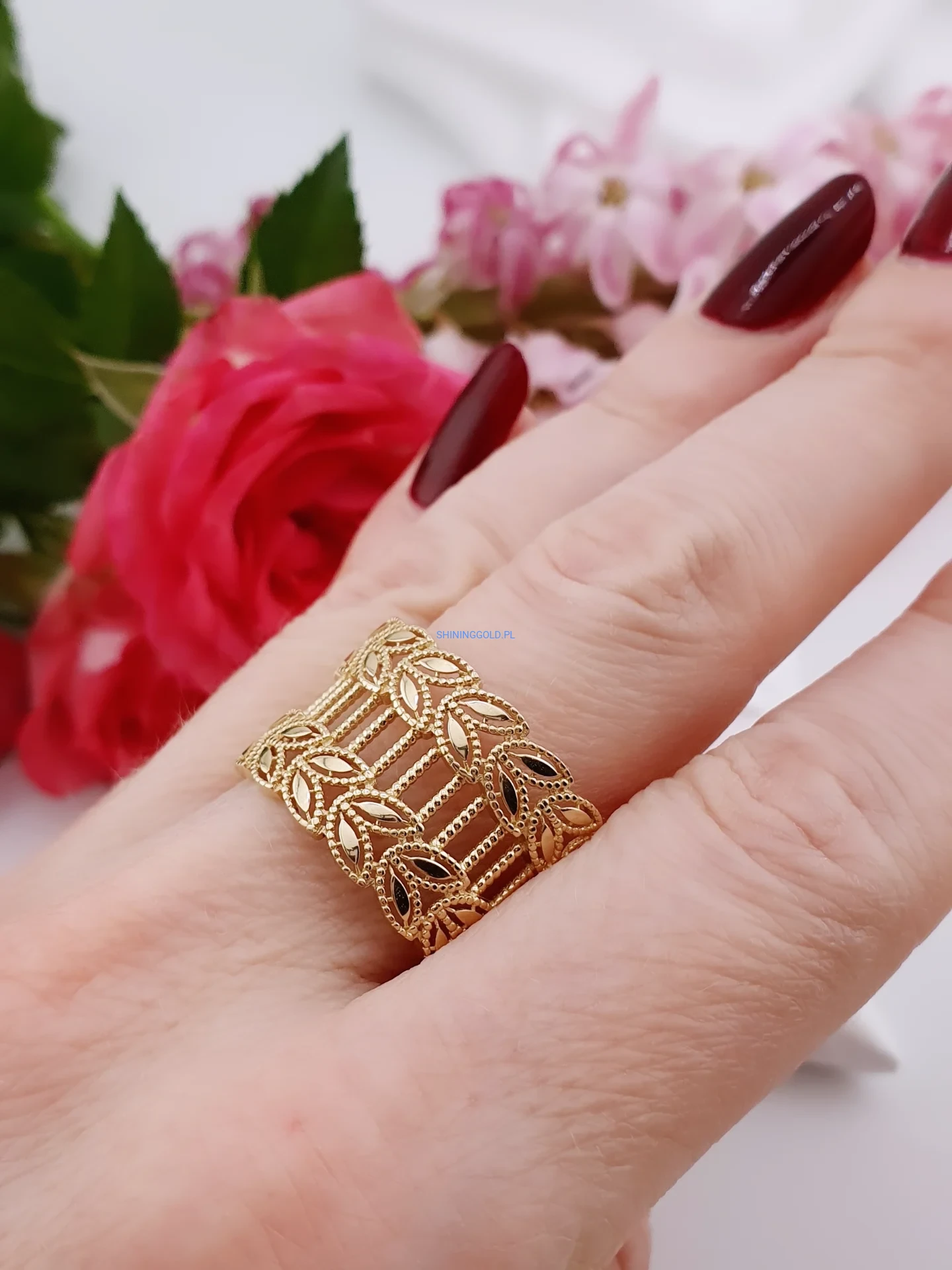 Stylowy złoty pierścionek wykonany ze złota próby 585 wyróżnia się szeroką konstrukcją oraz ażurowym wzorem inspirowanym motywami roślinnymi. Delikatne wycięcia sprawiają, że mimo swojej formy pierścionek pozostaje lekki i komfortowy w noszeniu.