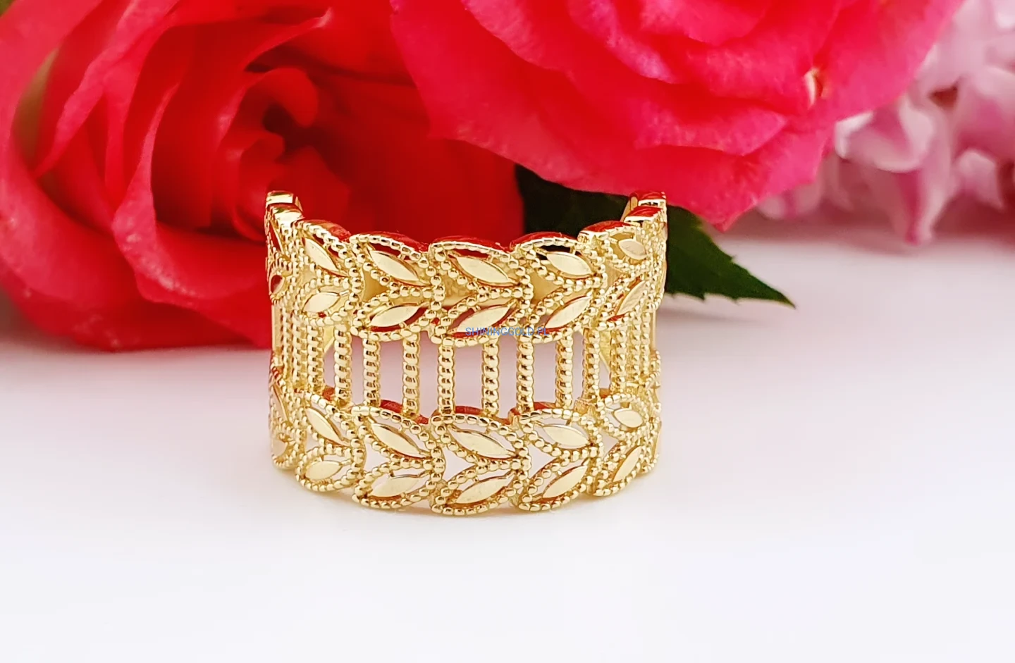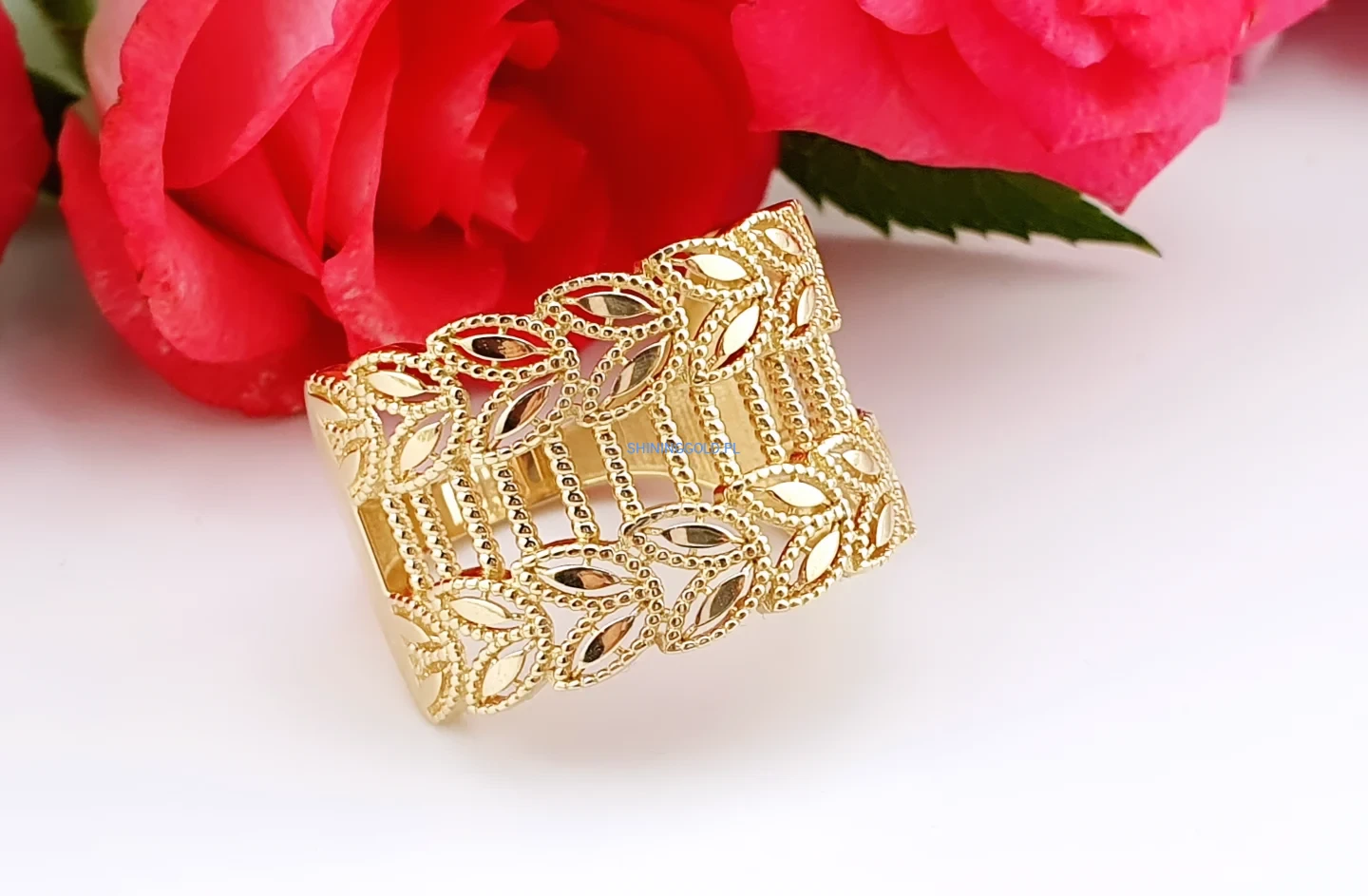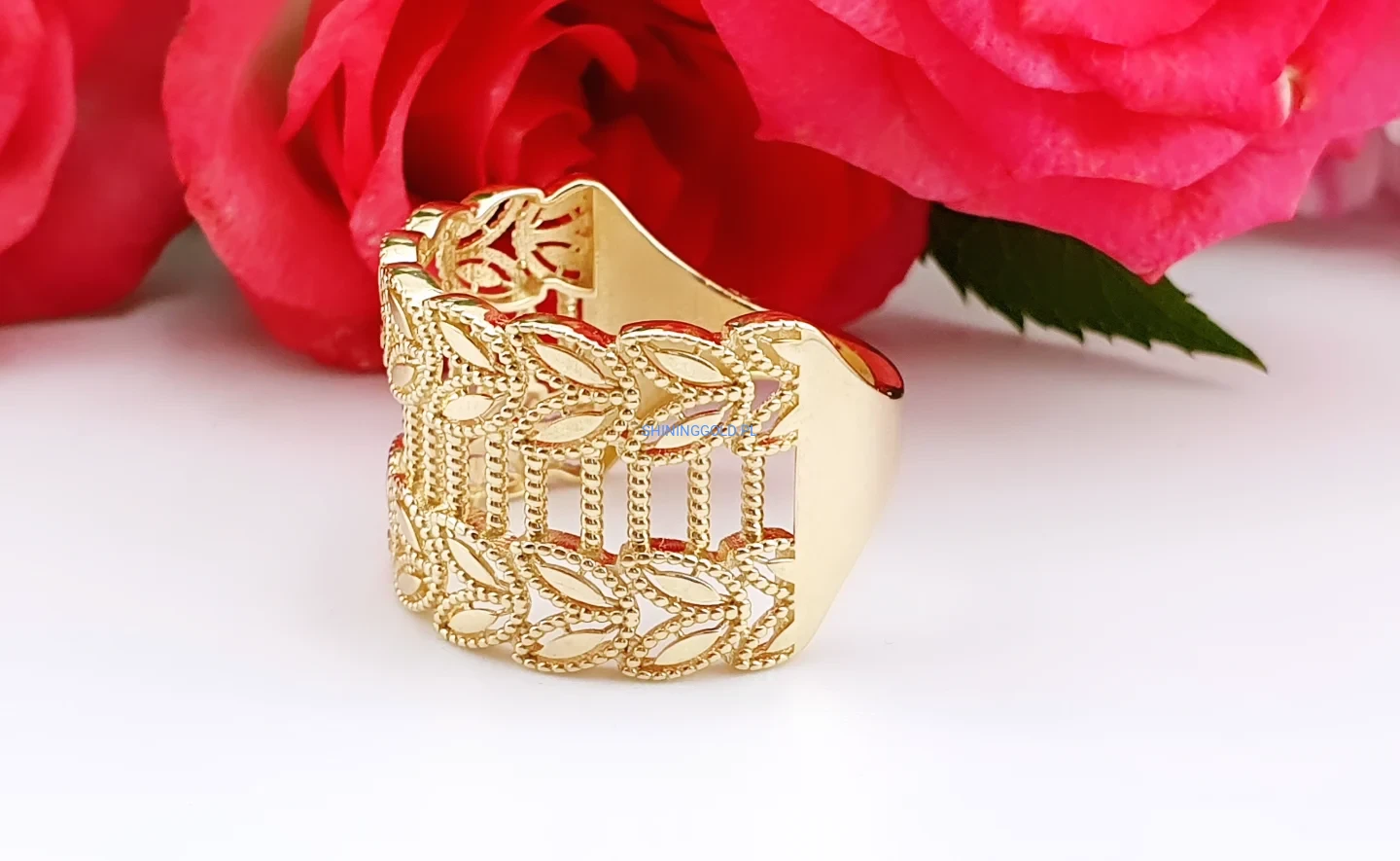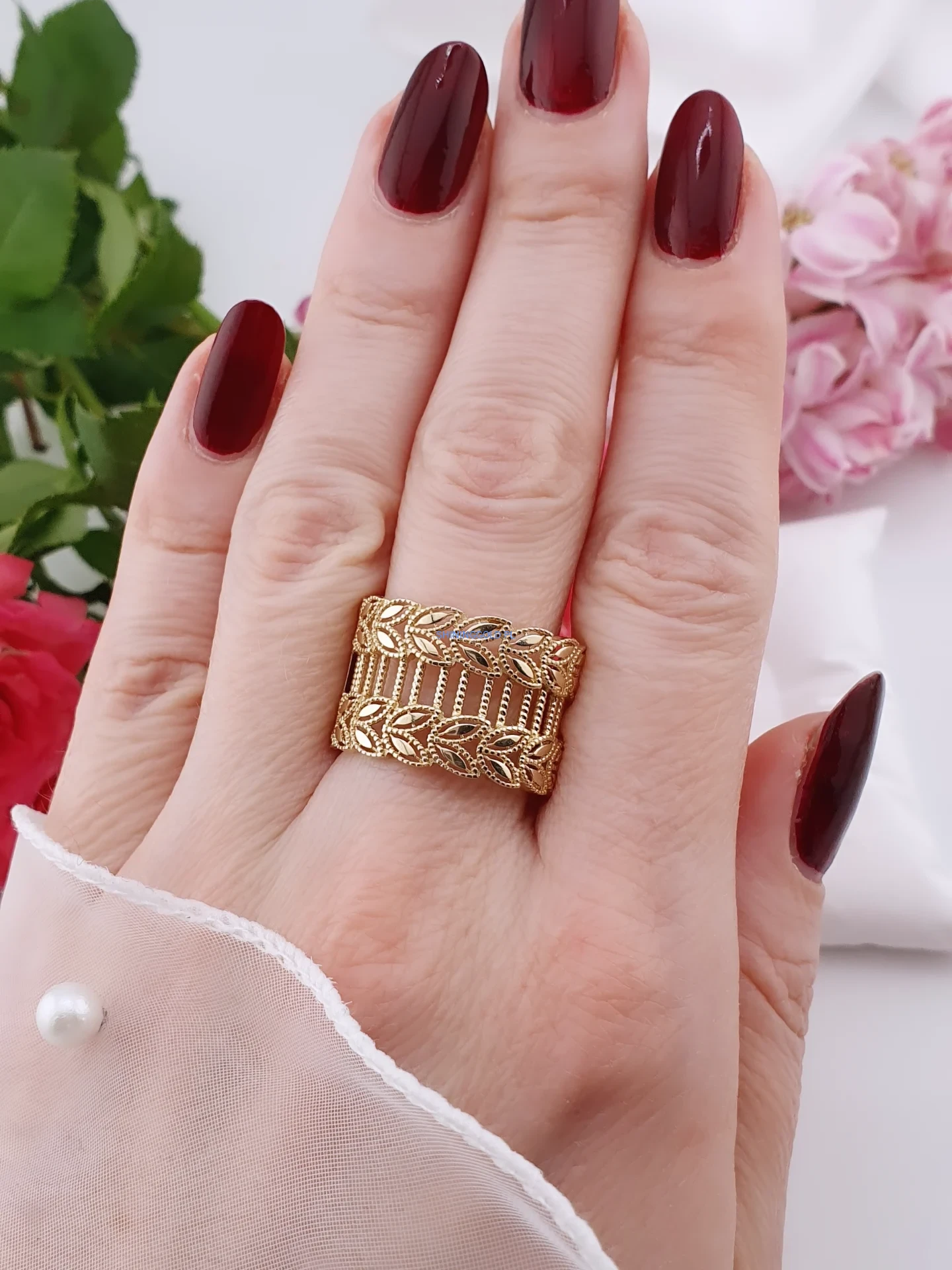 Stylowy złoty pierścionek wykonany ze złota próby 585 wyróżnia się szeroką konstrukcją oraz ażurowym wzorem inspirowanym motywami roślinnymi. Delikatne wycięcia sprawiają, że mimo swojej formy pierścionek pozostaje lekki i komfortowy w noszeniu.