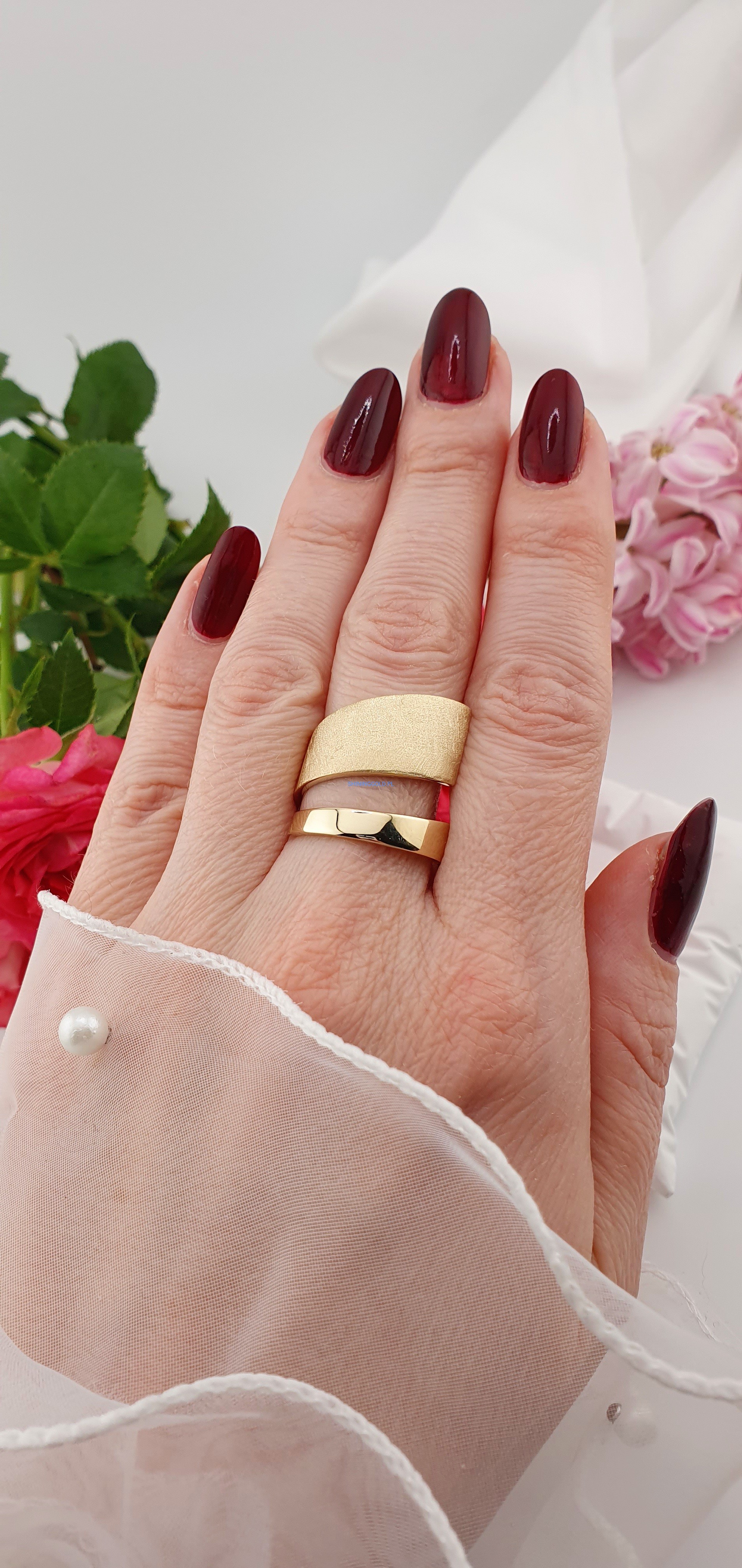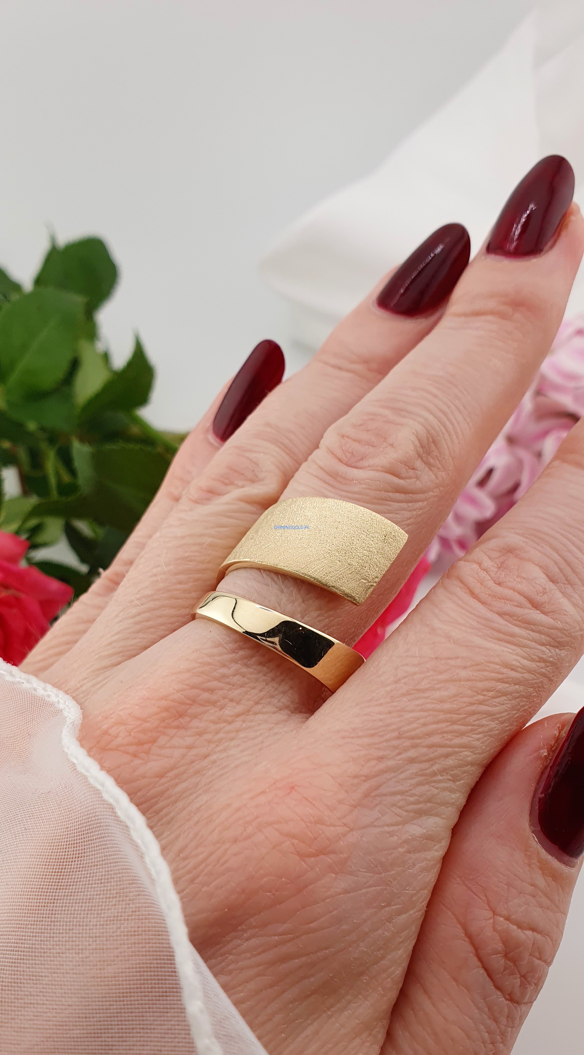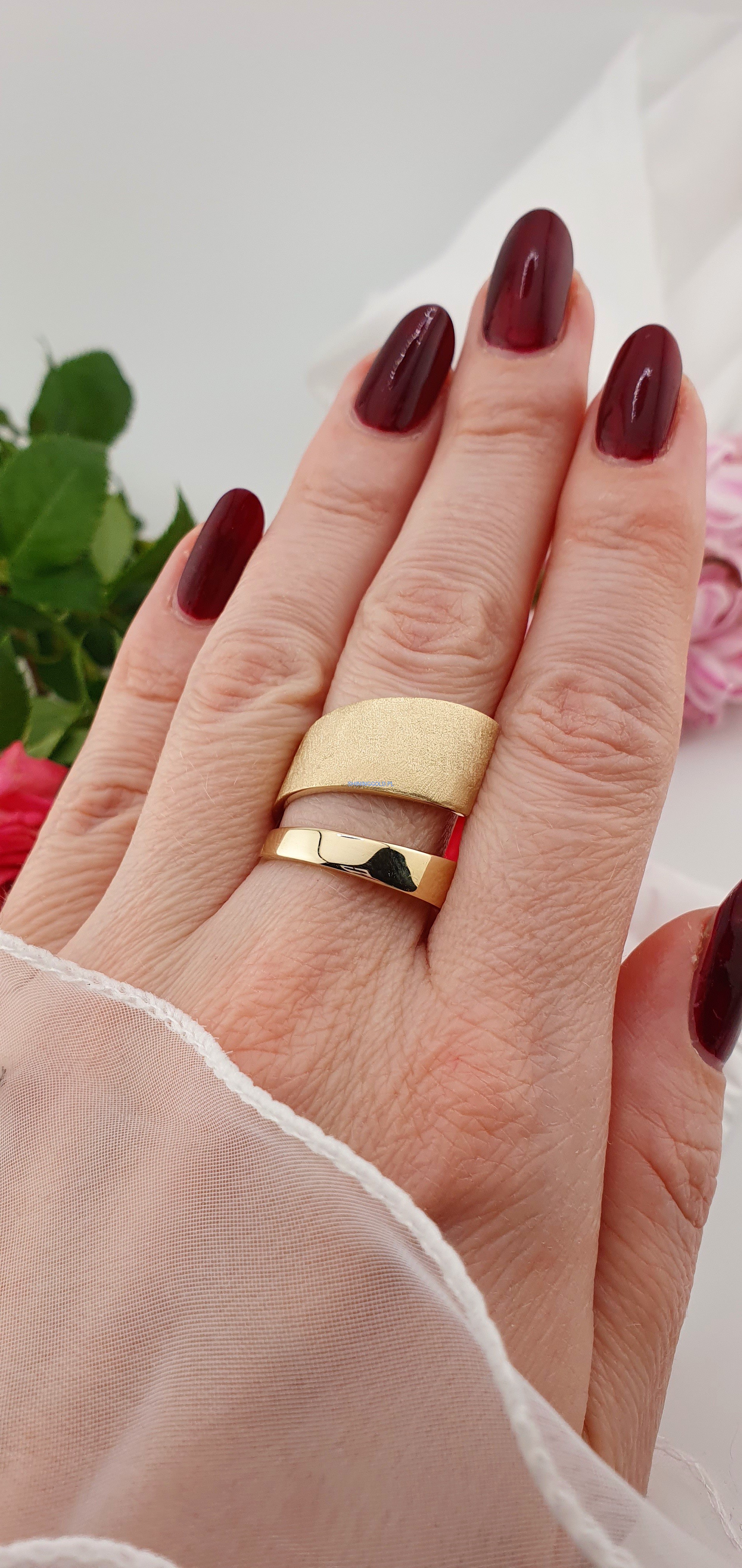 Elegancki złoty pierścionek wykonany ze złota próby 585 przyciąga uwagę swoją szeroką formą i matowym wykończeniem. Połączenie gładkiej i satynowej powierzchni nadaje mu nowoczesnego charakteru i subtelnej elegancji.