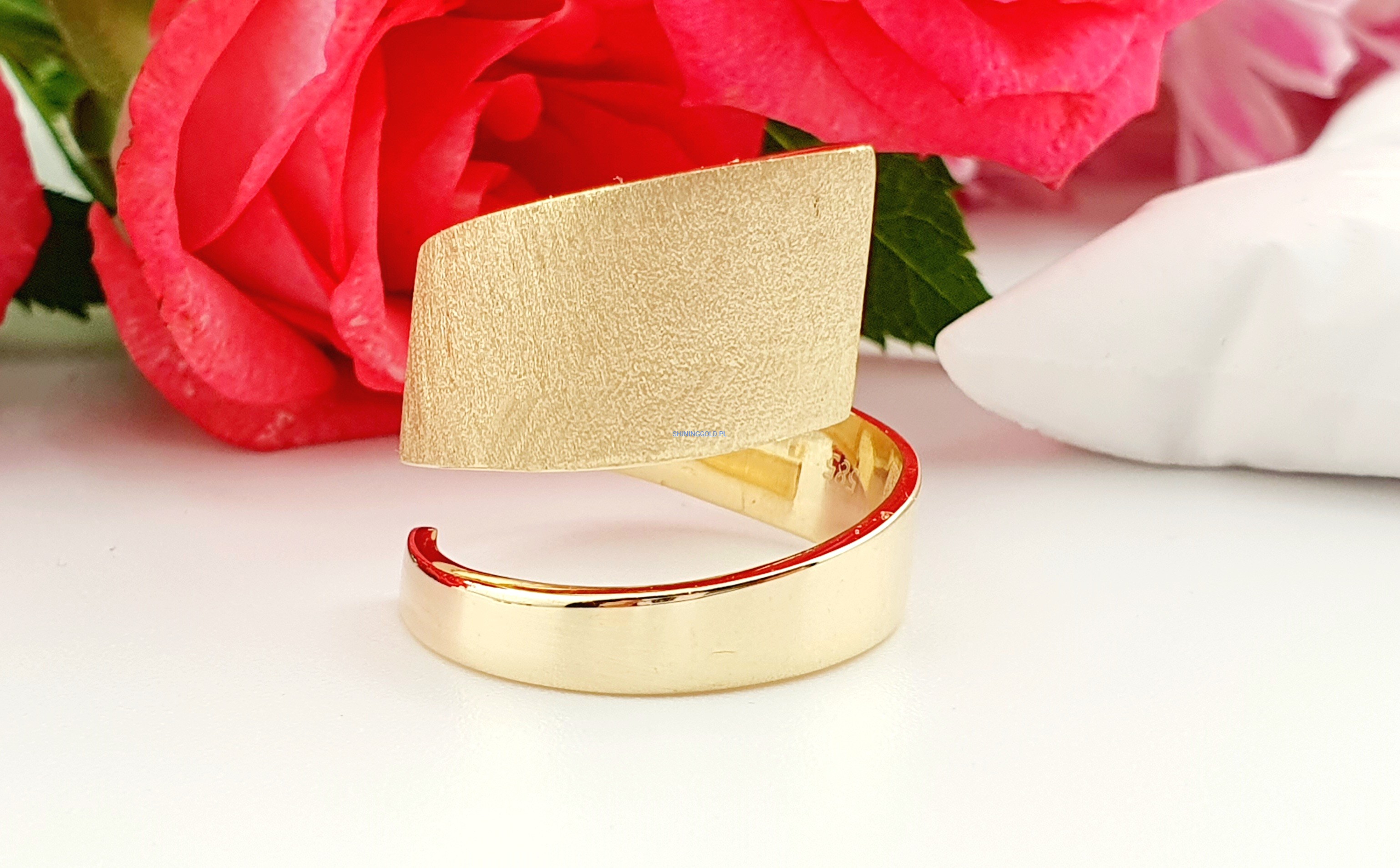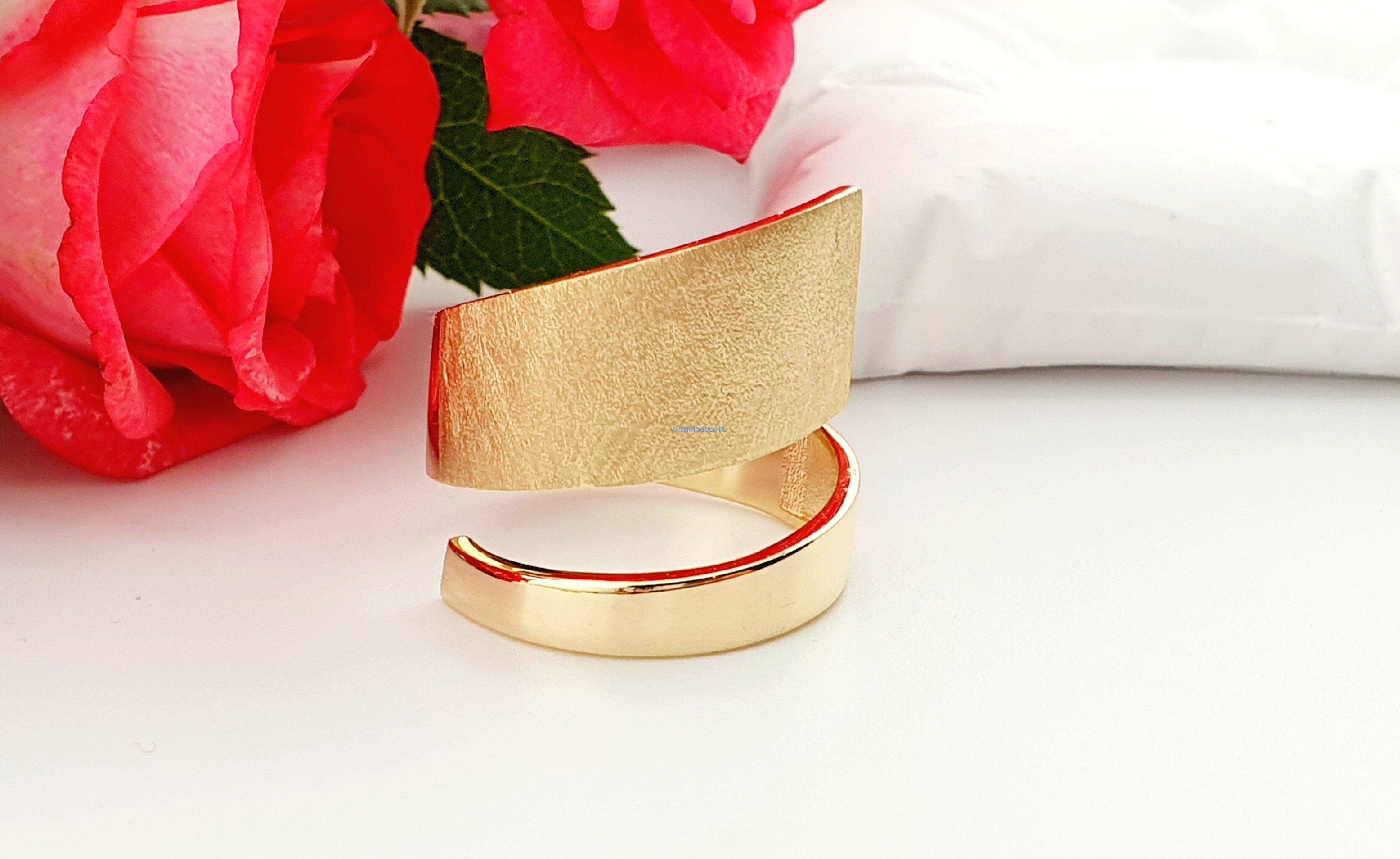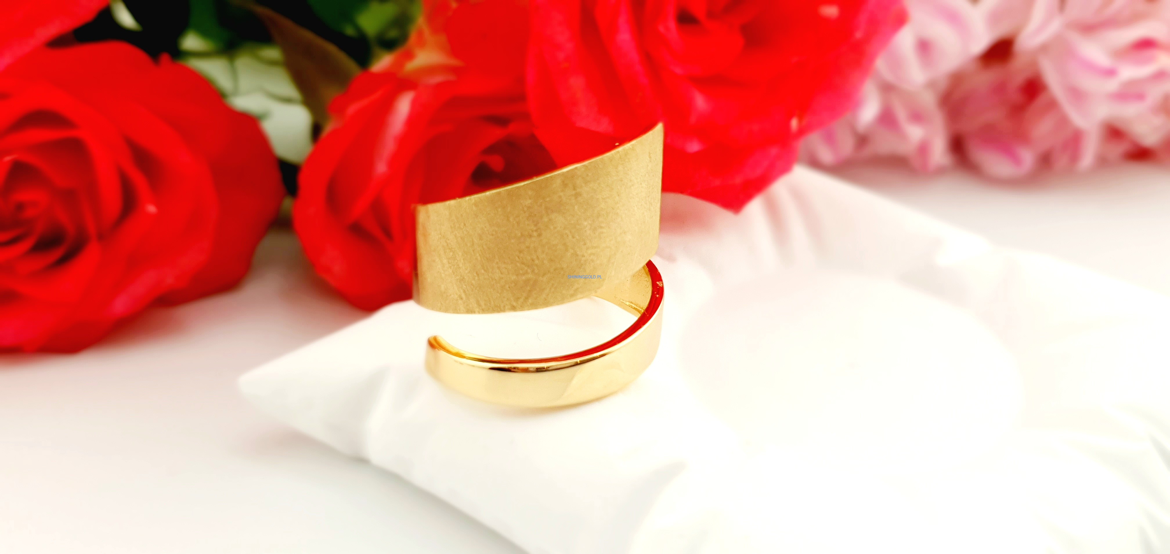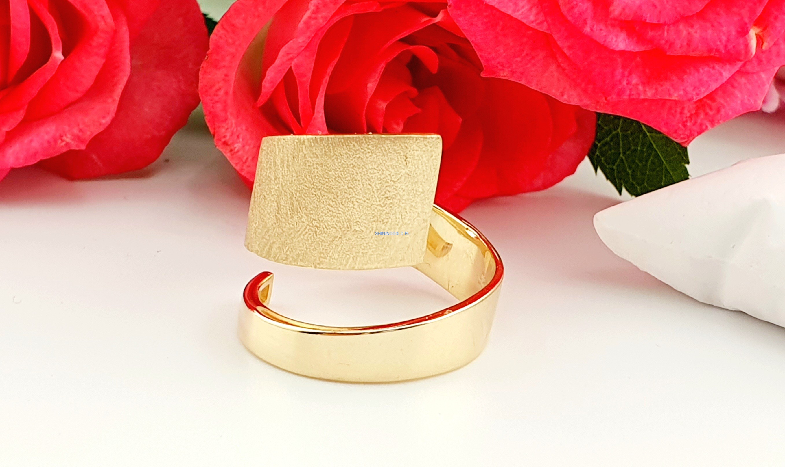 Elegancki złoty pierścionek wykonany ze złota próby 585 przyciąga uwagę swoją szeroką formą i matowym wykończeniem. Połączenie gładkiej i satynowej powierzchni nadaje mu nowoczesnego charakteru i subtelnej elegancji.