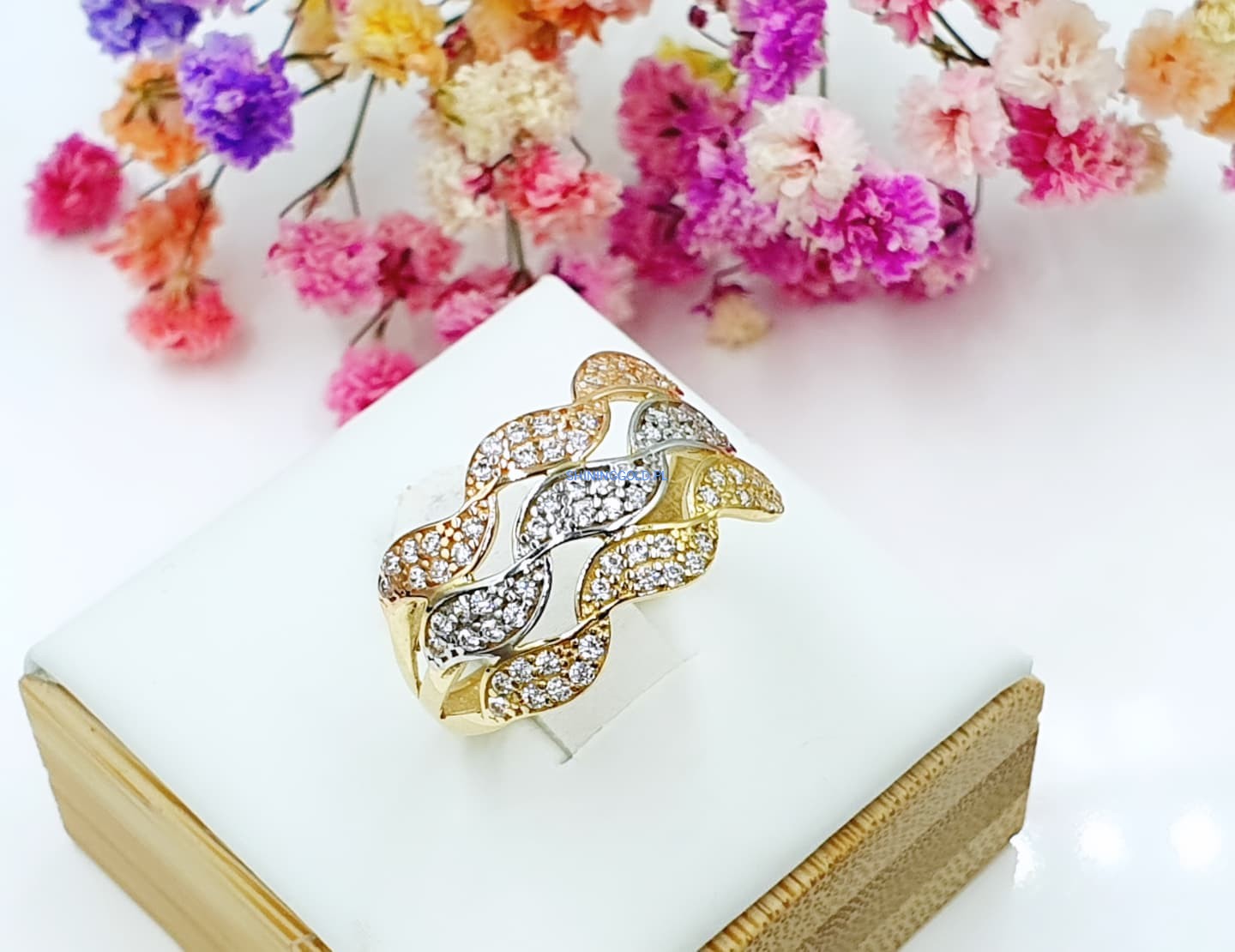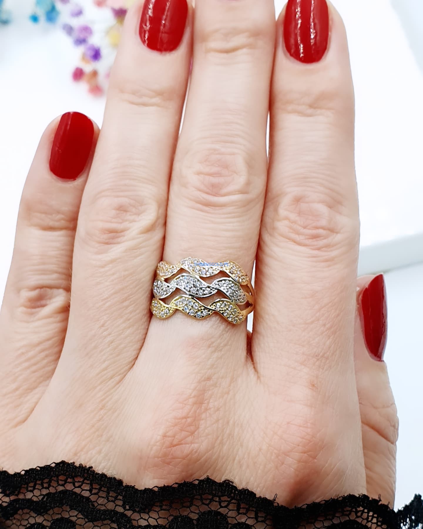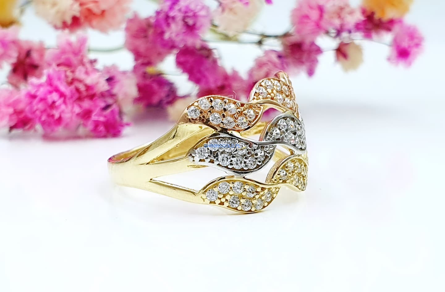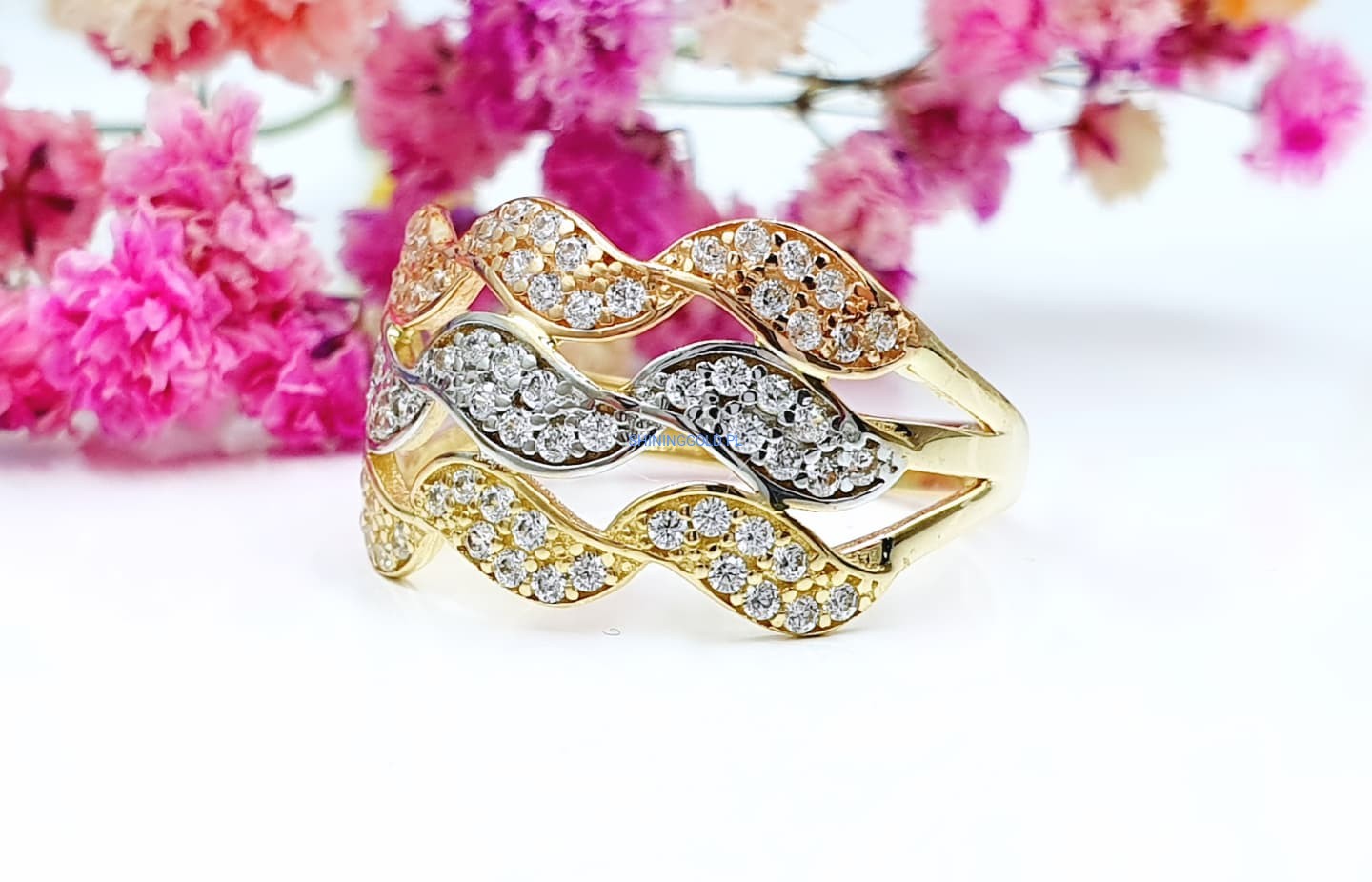 Złoty pierścionek w trzech kolorach złota z cyrkoniami (009.A)
