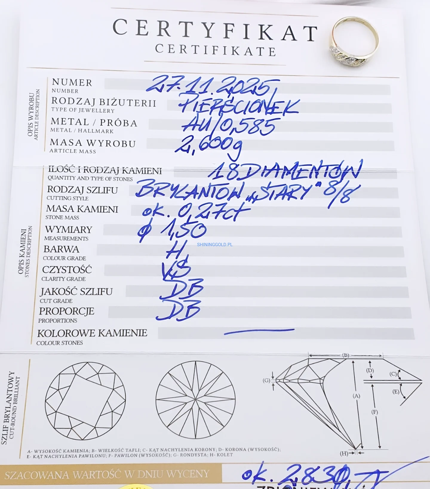 Subtelny i elegancki pierścionek wykonany ze złota próby 585, ozdobiony diamentami w klasycznym, starym szlifie brylantowym 8/8. Harmonijna forma i precyzyjne oprawienie kamieni sprawiają, że biżuteria zachwyca ponadczasowym charakterem i delikatnym blaskiem.