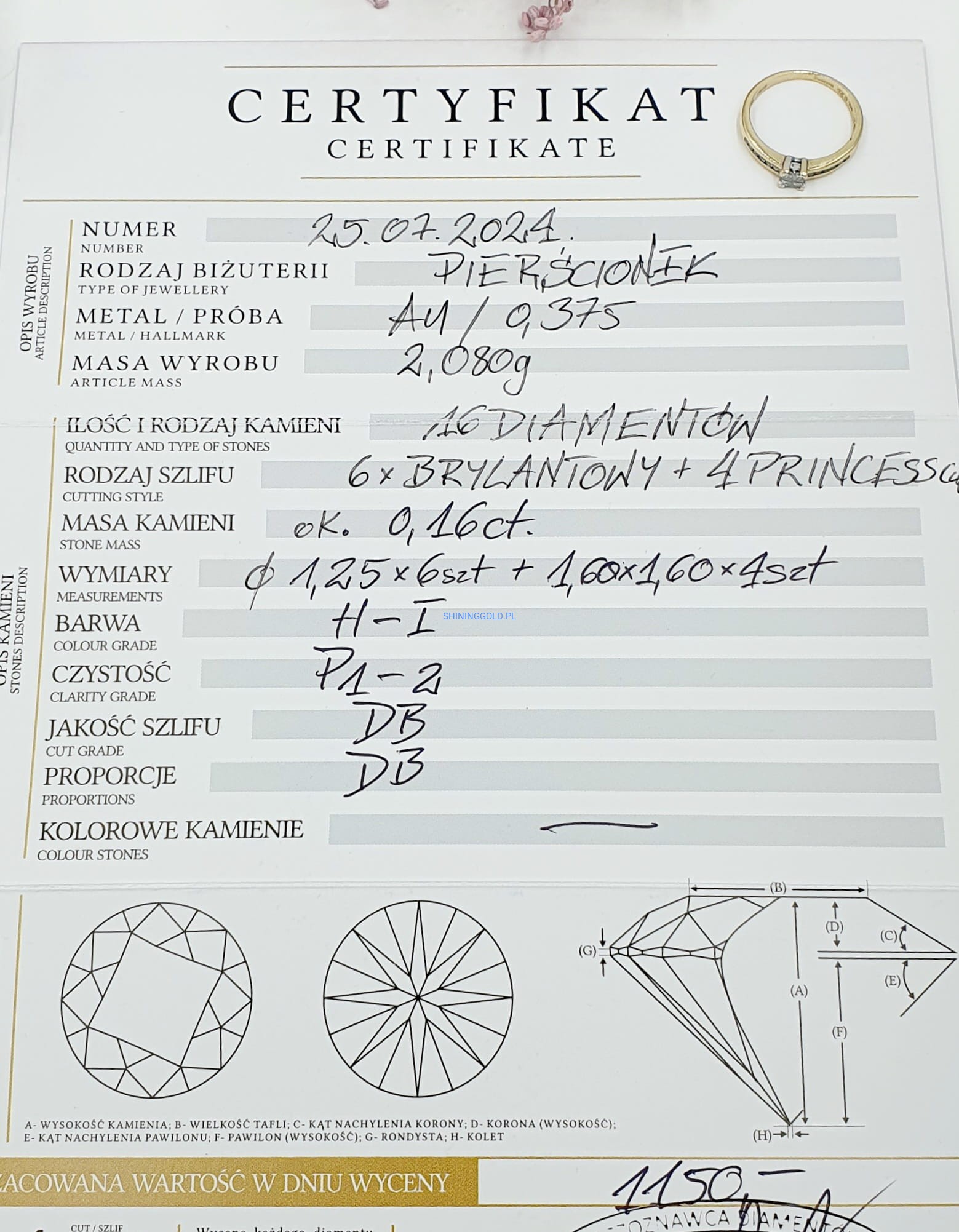 - Diamenty: 16 sztuk, masa ok. 0,16ct, czystość P1-P2, barwa H-I