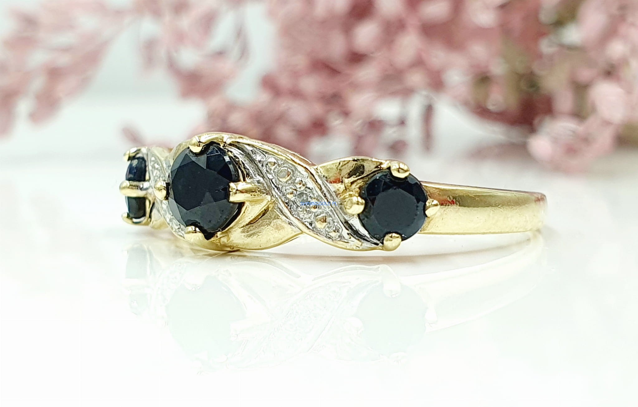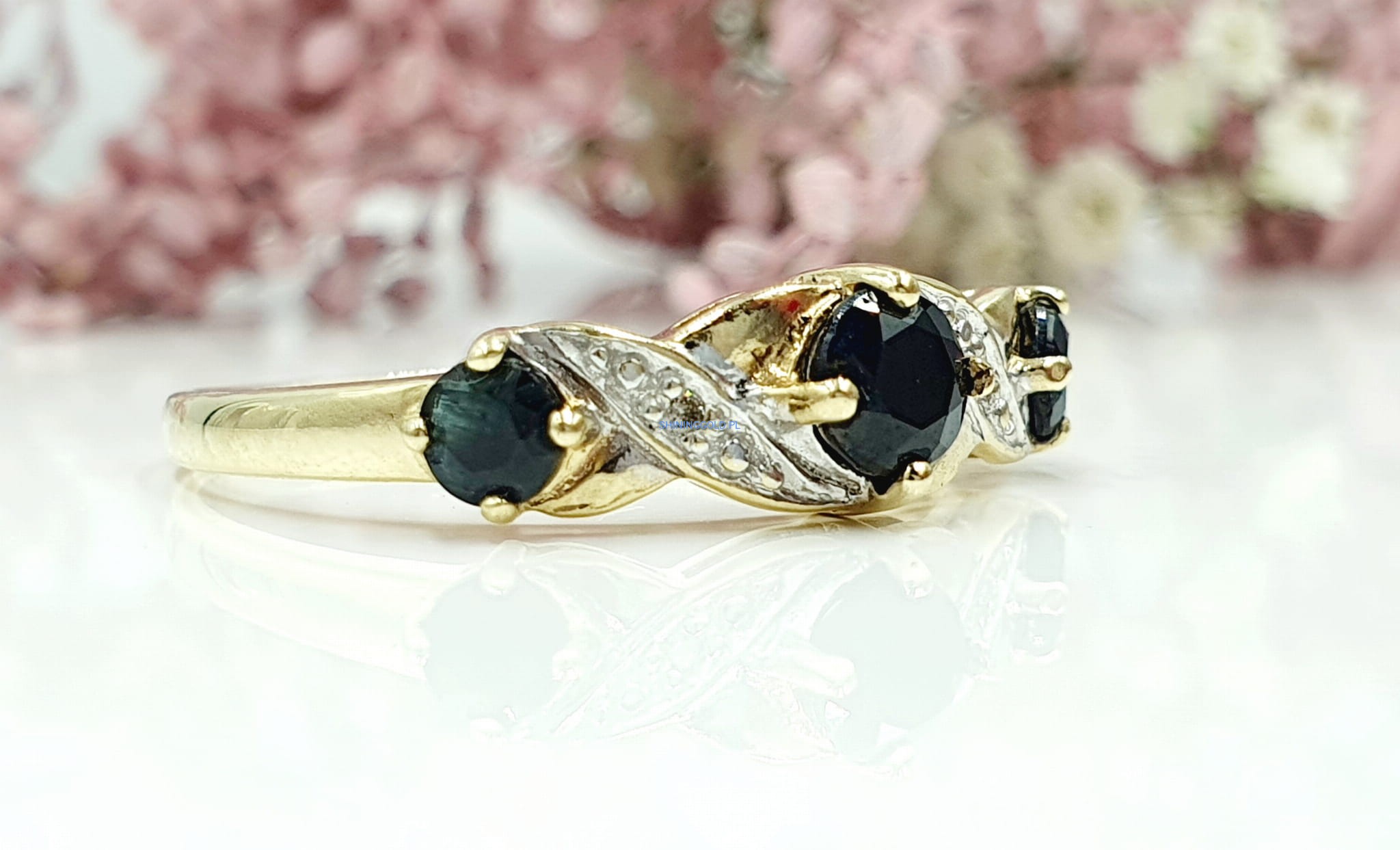 Centralnym elementem pierścionka są trzy naturalne szafiry o łącznej masie 0,96ct. Szafiry, znane ze swojego głębokiego, niebieskiego koloru, dodają biżuterii wyrafinowanego charakteru. Towarzyszą im dwa diamenty o masie ok. 0,01ct każdy, czystości P1 i barwie I-J, które delikatnie podkreślają blask szafirów.