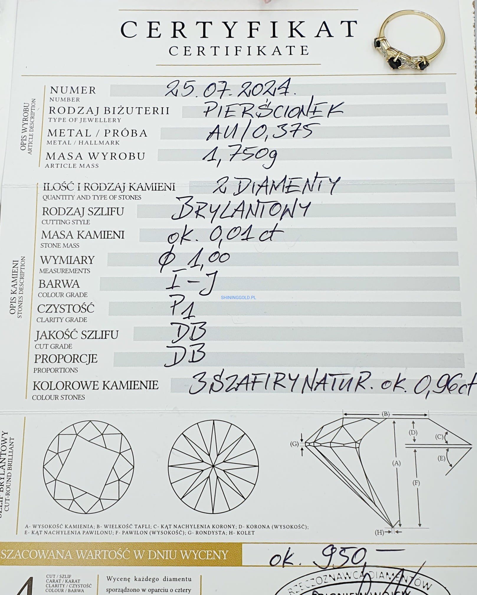 - Szafiry: 3 naturalne szafiry, masa 0,96ct