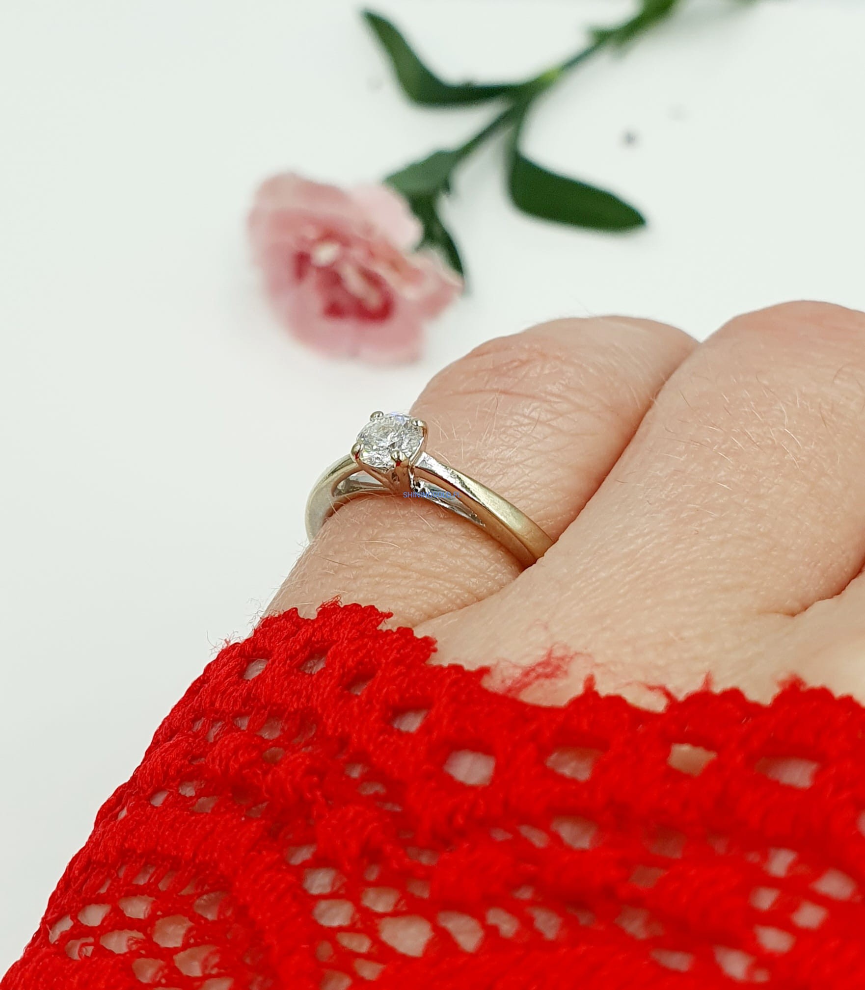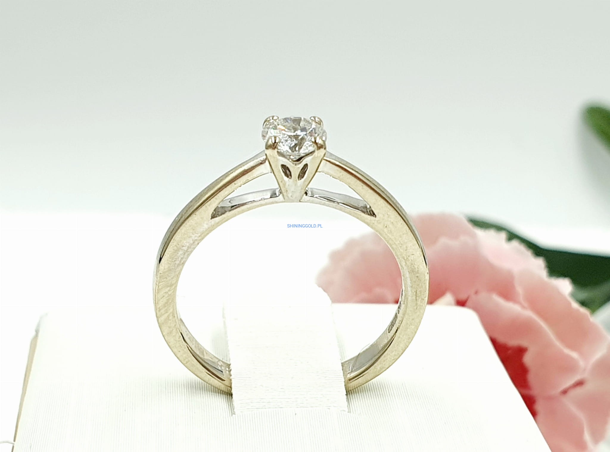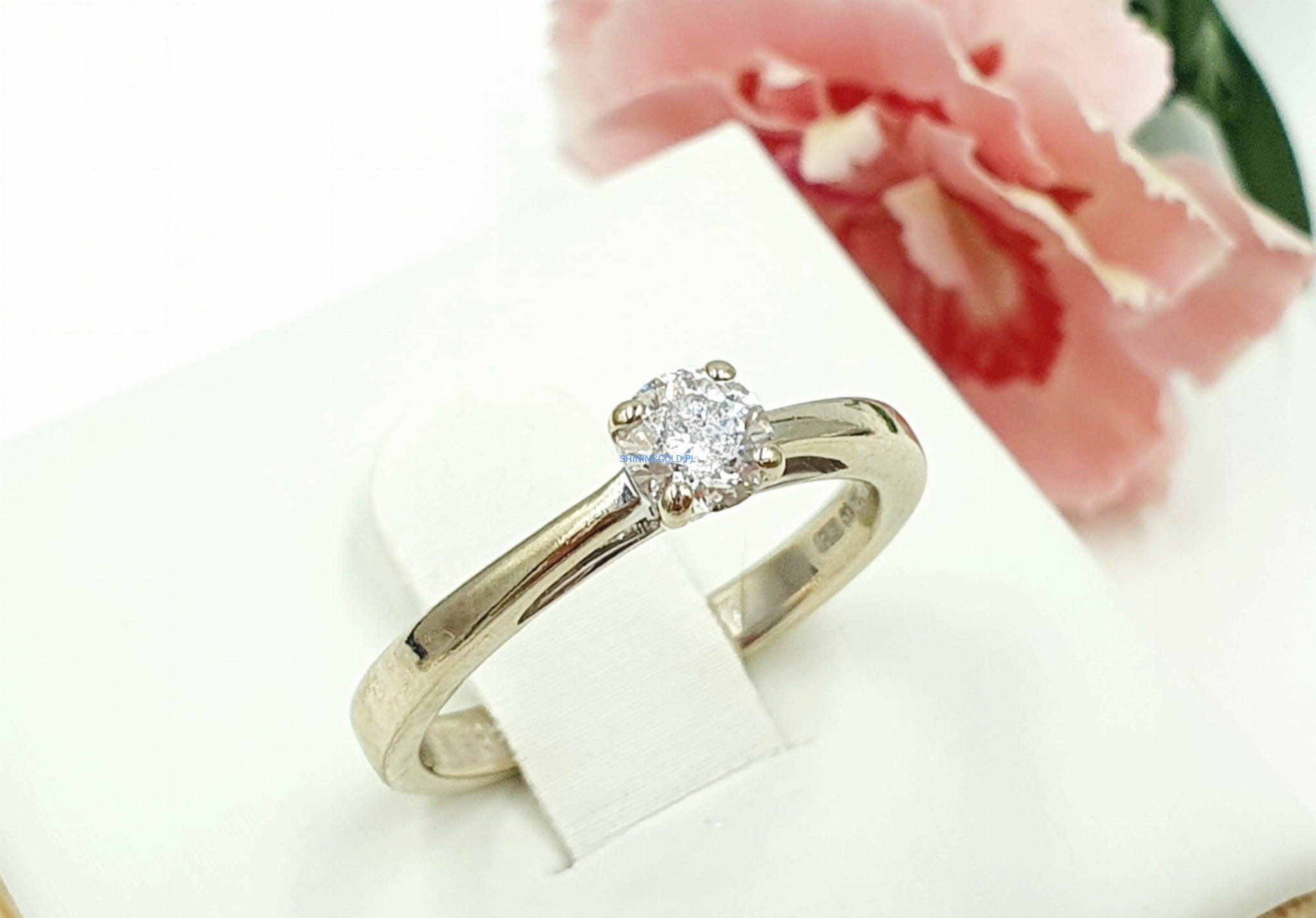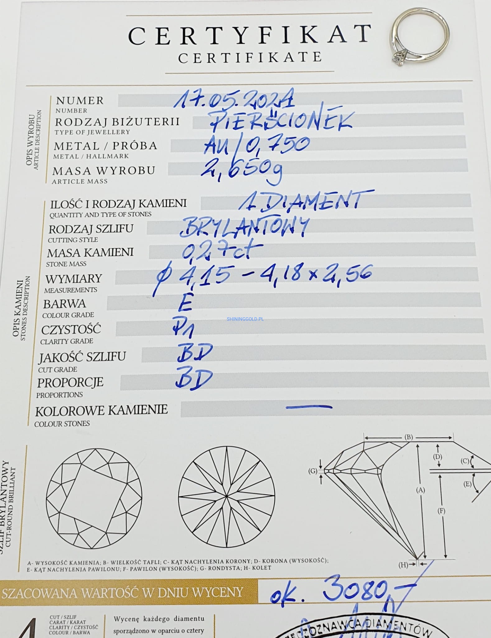 - Kamienie: 1 diament w szlifie brylantowym (ok. 0,27 ct), czystość P1, barwa E