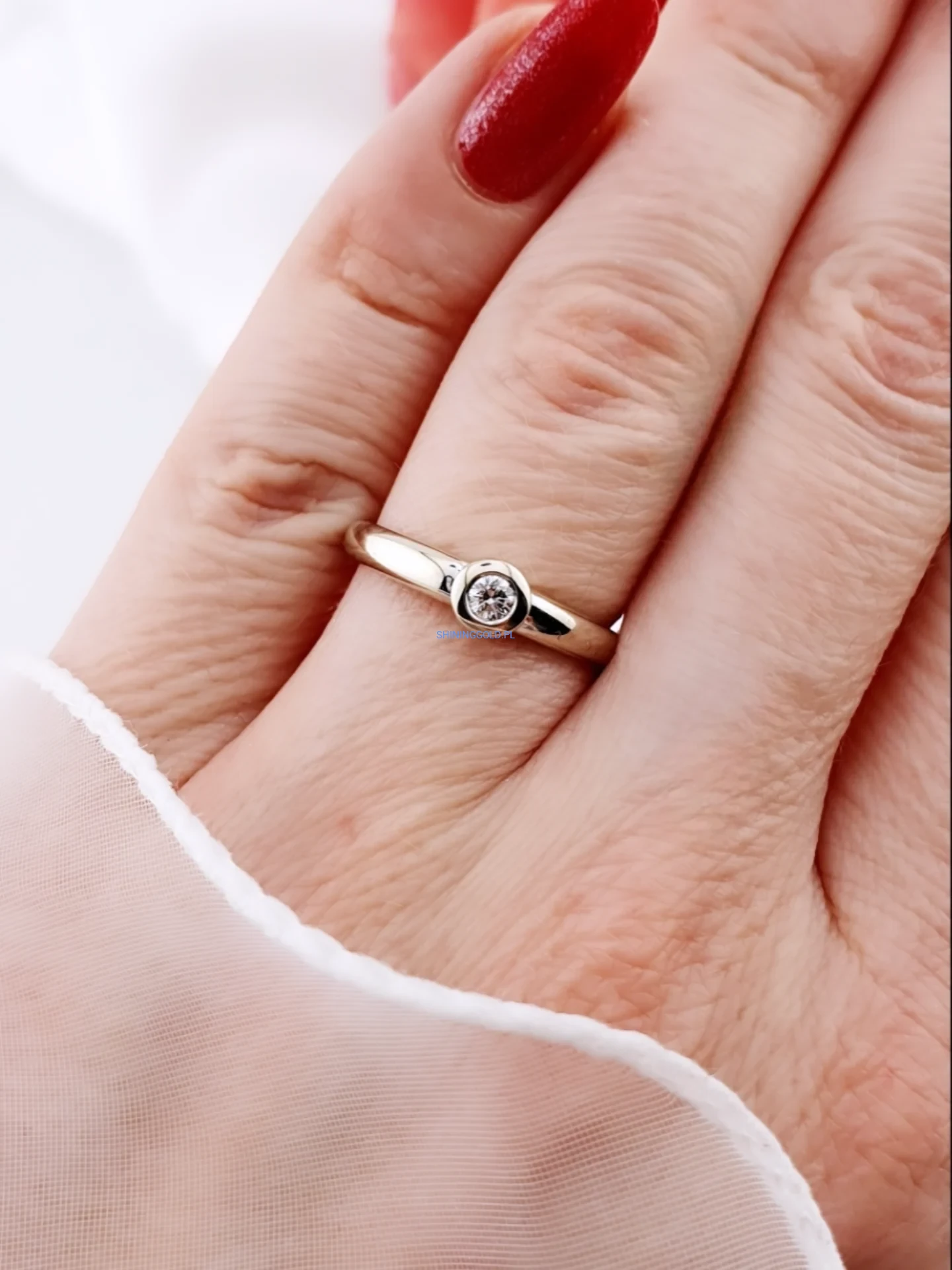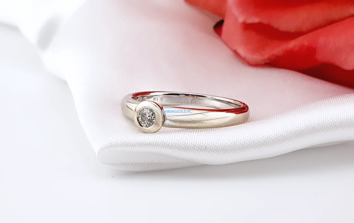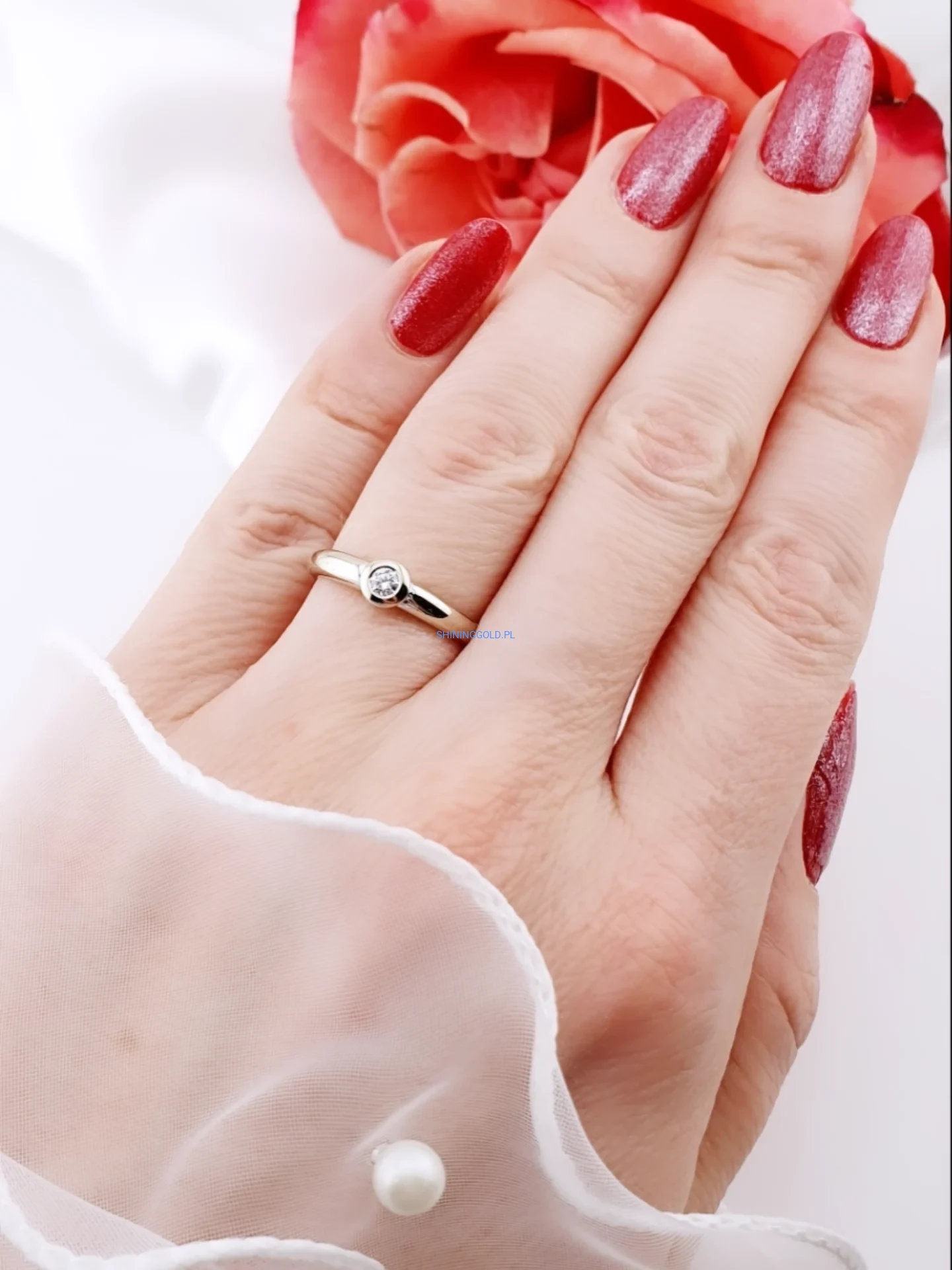 Diament o barwie H i czystości VS pięknie odbija światło, nadając biżuterii elegancki, szlachetny charakter. Minimalistyczny design sprawia, że pierścionek doskonale sprawdzi się zarówno jako pierścionek zaręczynowy, jak i codzienna, elegancka biżuteria.
