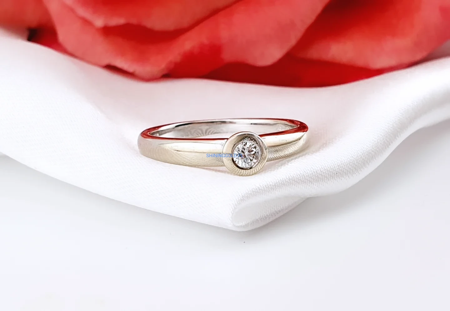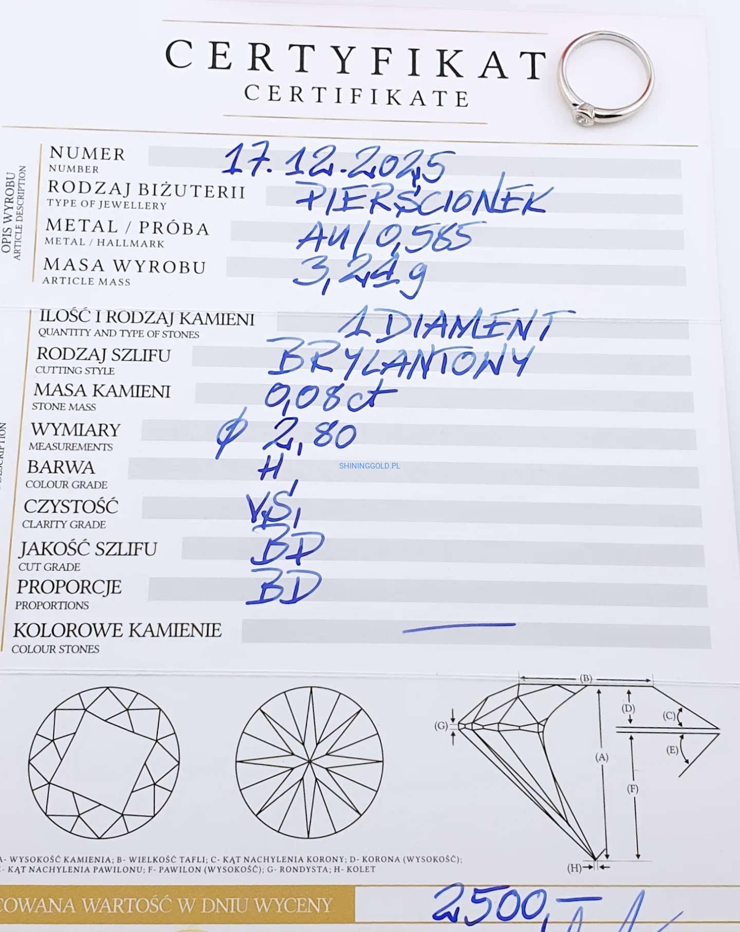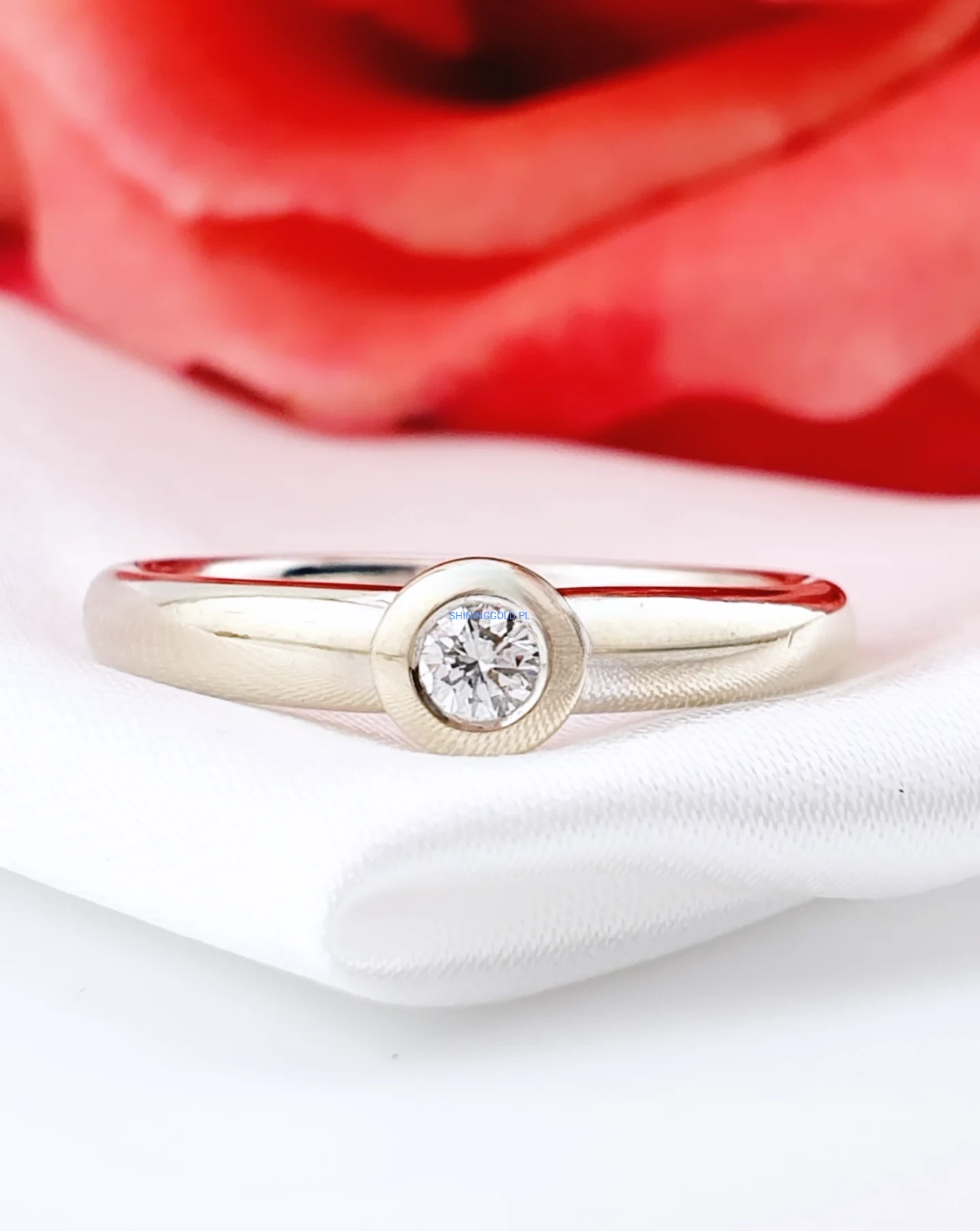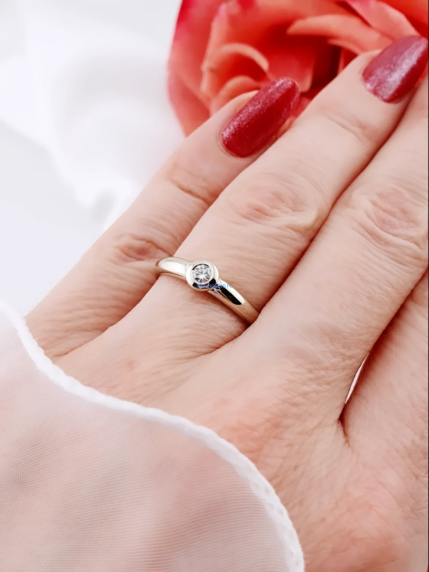 Diament o barwie H i czystości VS pięknie odbija światło, nadając biżuterii elegancki, szlachetny charakter. Minimalistyczny design sprawia, że pierścionek doskonale sprawdzi się zarówno jako pierścionek zaręczynowy, jak i codzienna, elegancka biżuteria.