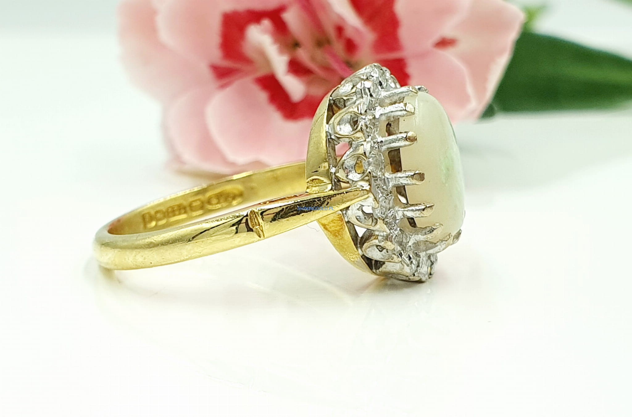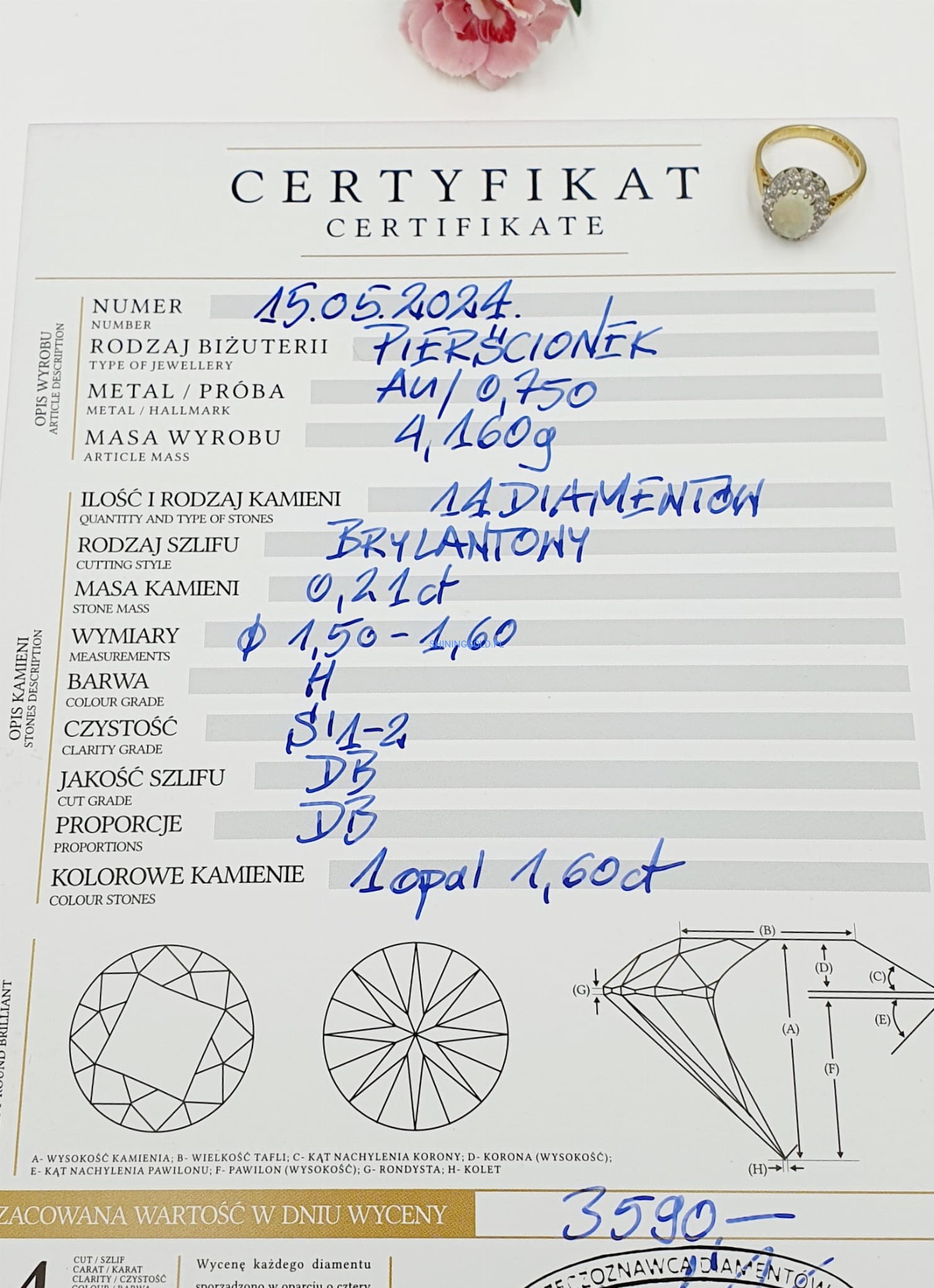 - Kamienie: 1 opal (1,60 ct), 14 diamentów w szlifie brylantowym (ok. 0,21 ct), czystość SI1-2, barwa H