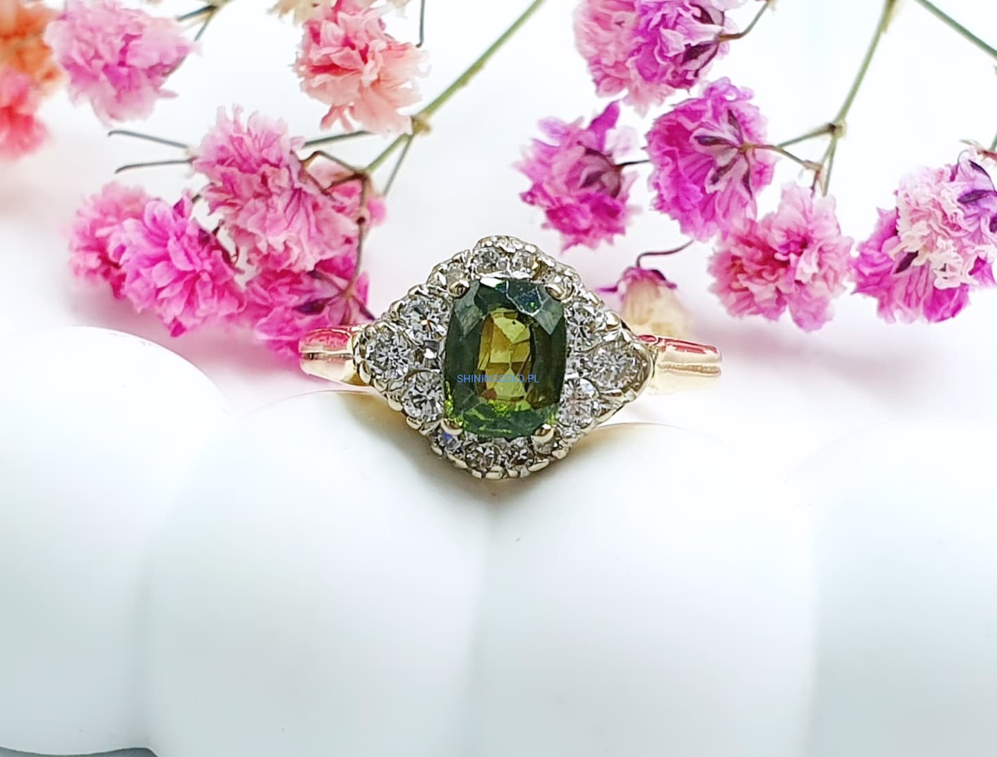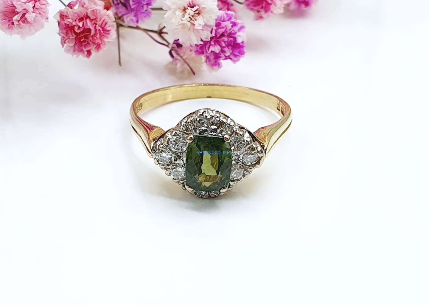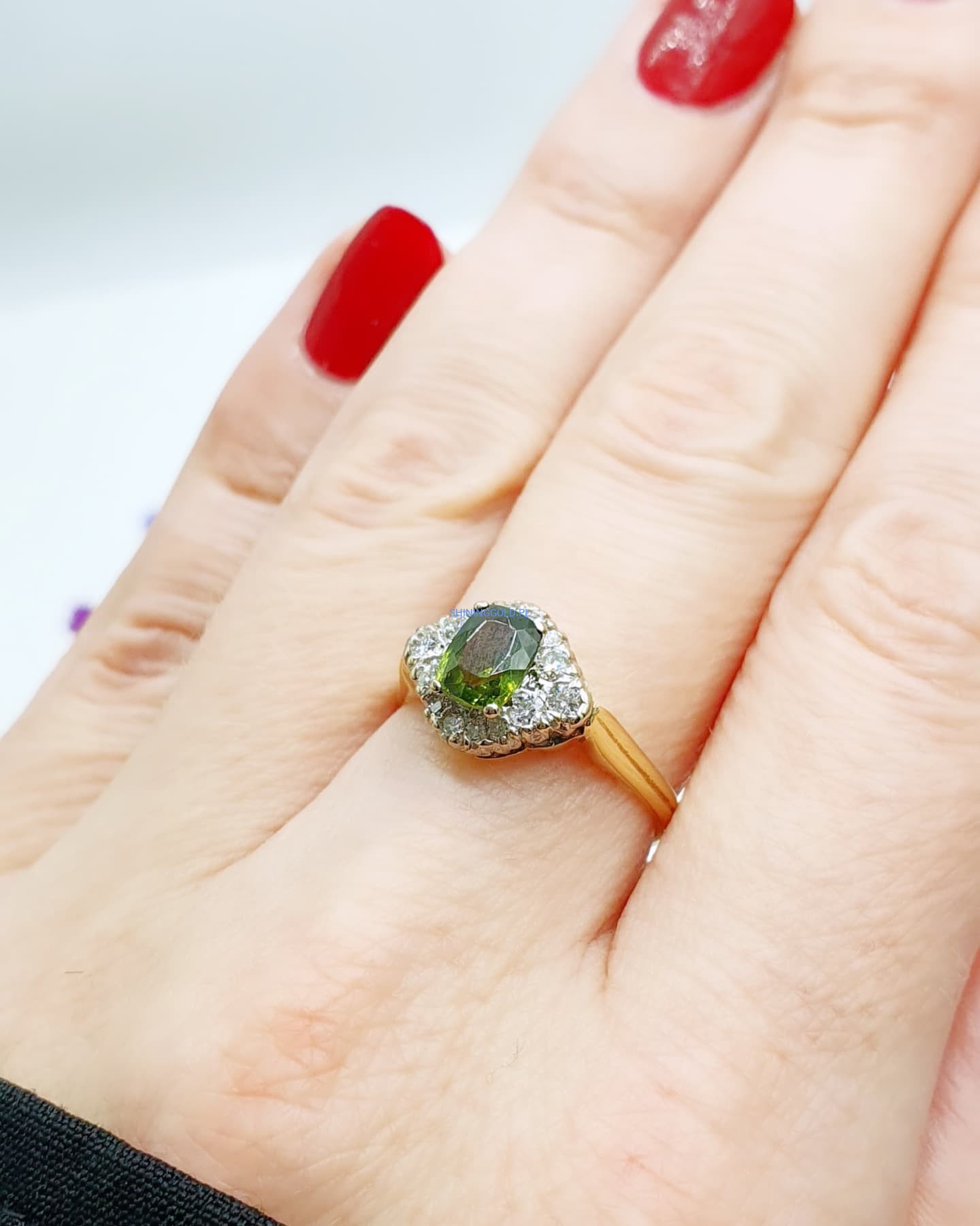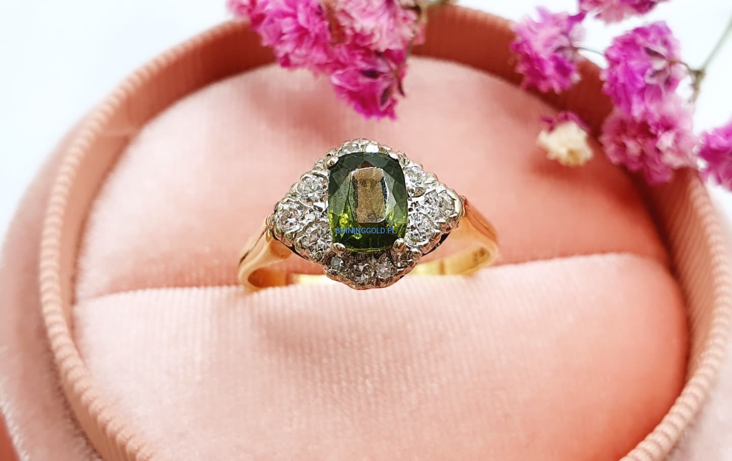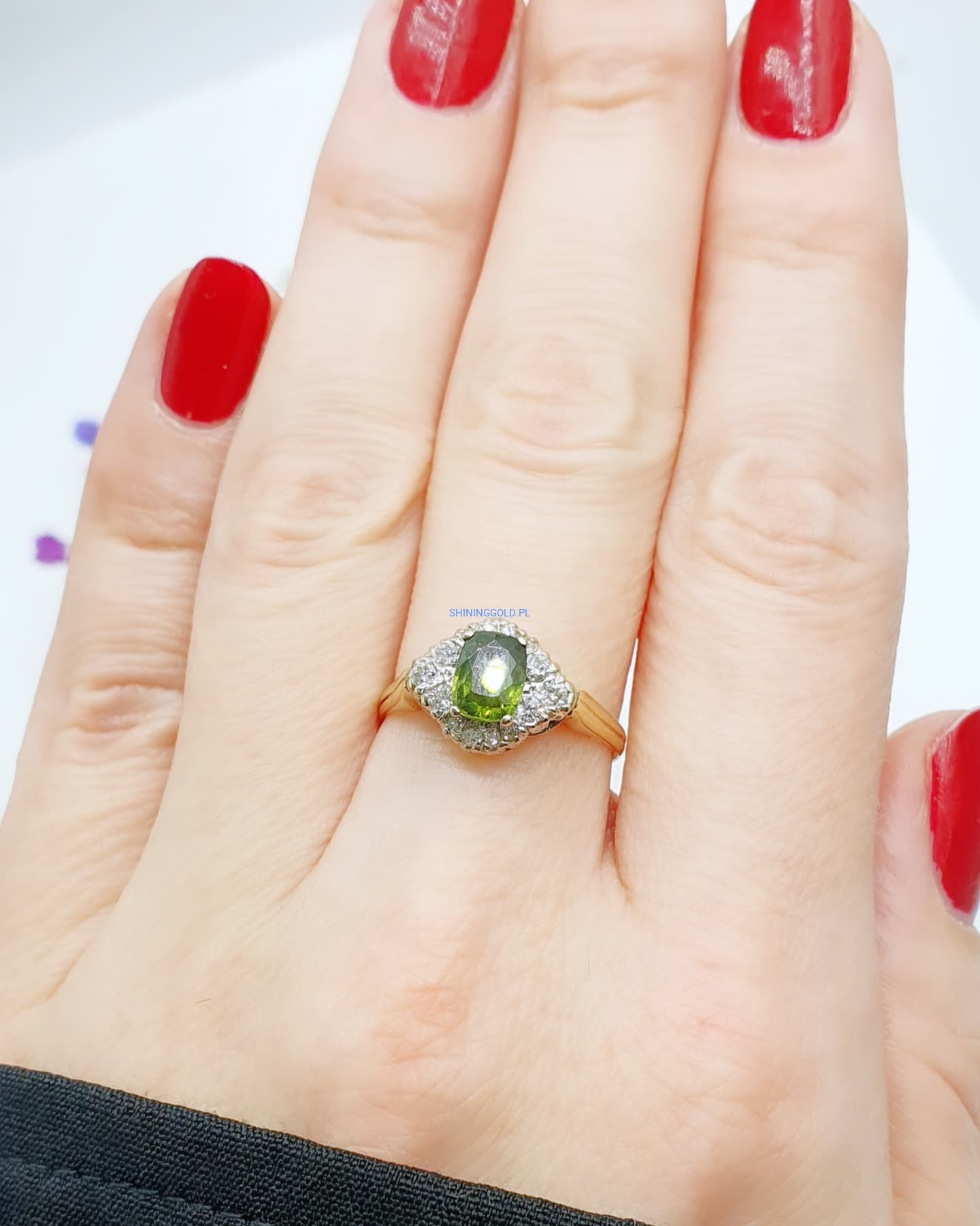 Złoty, nowy pierścionek z Peridotem i Diamentami