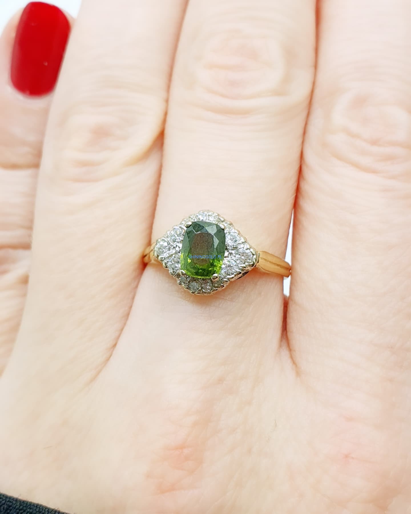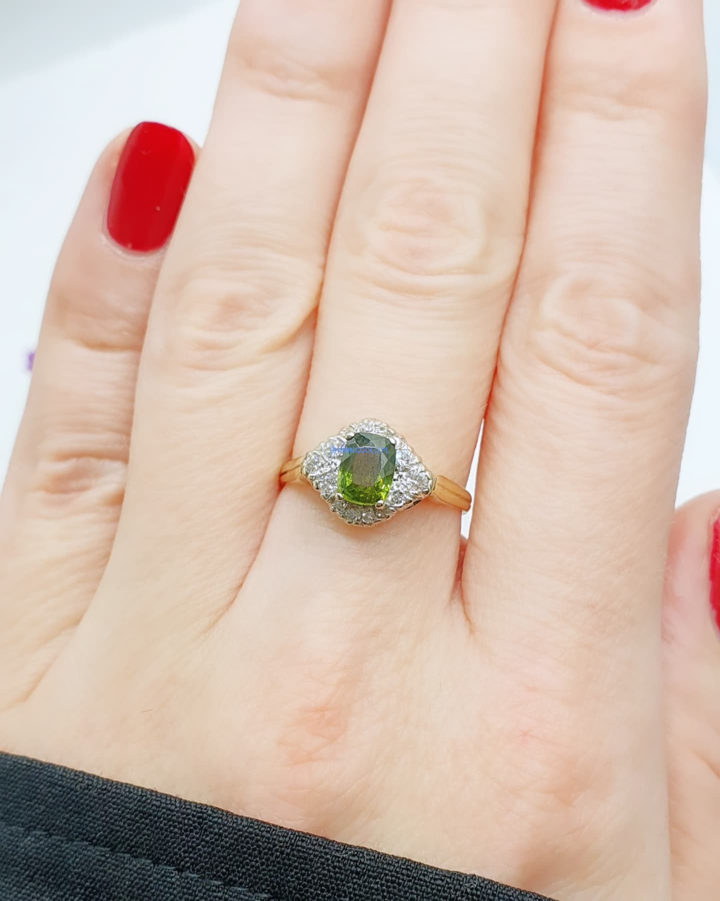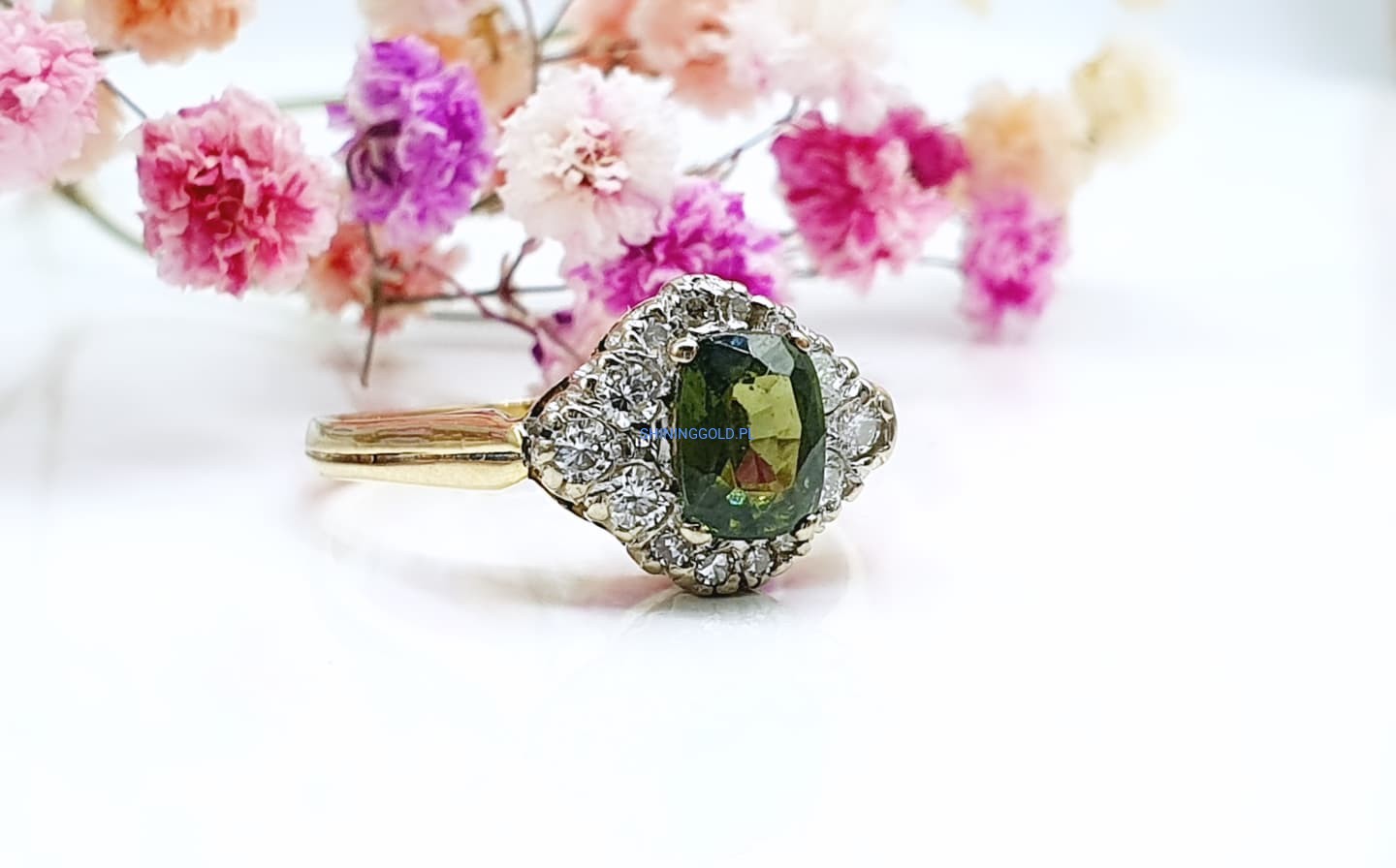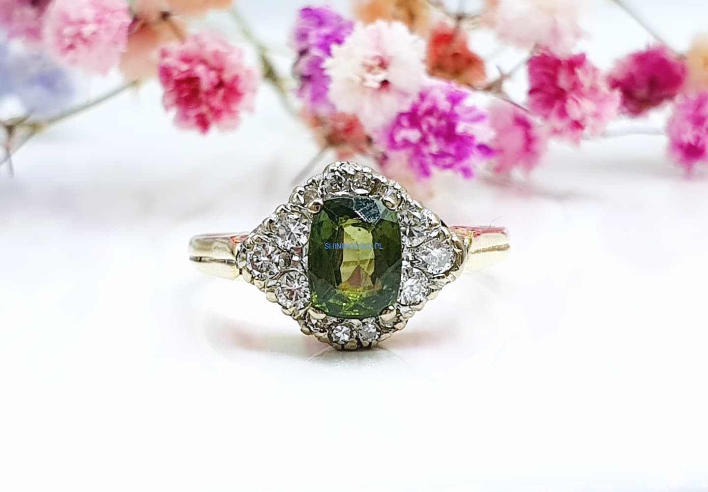 Złoty pierścionek z Peridotem i Diamentami (1111.WS)