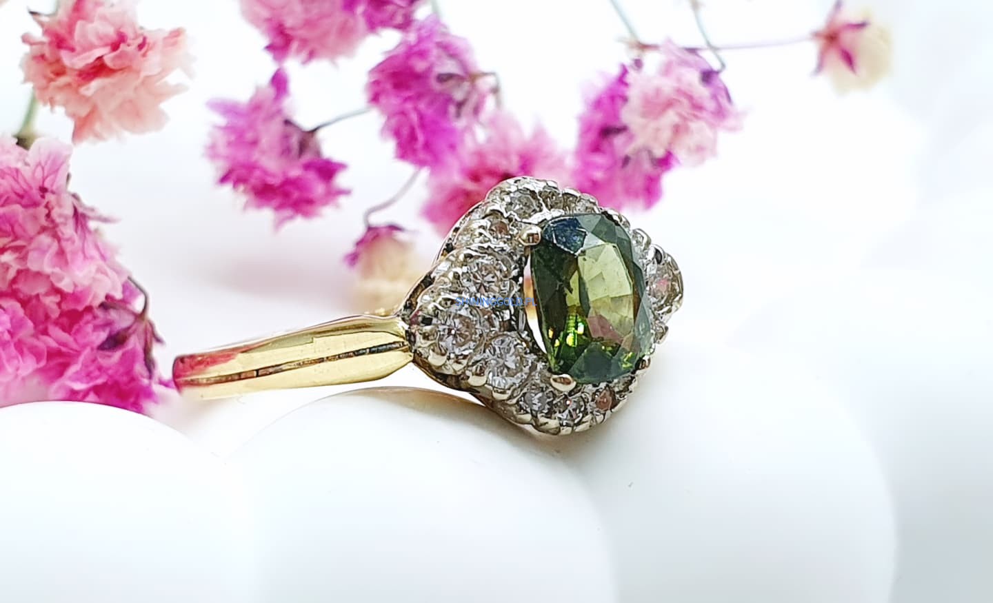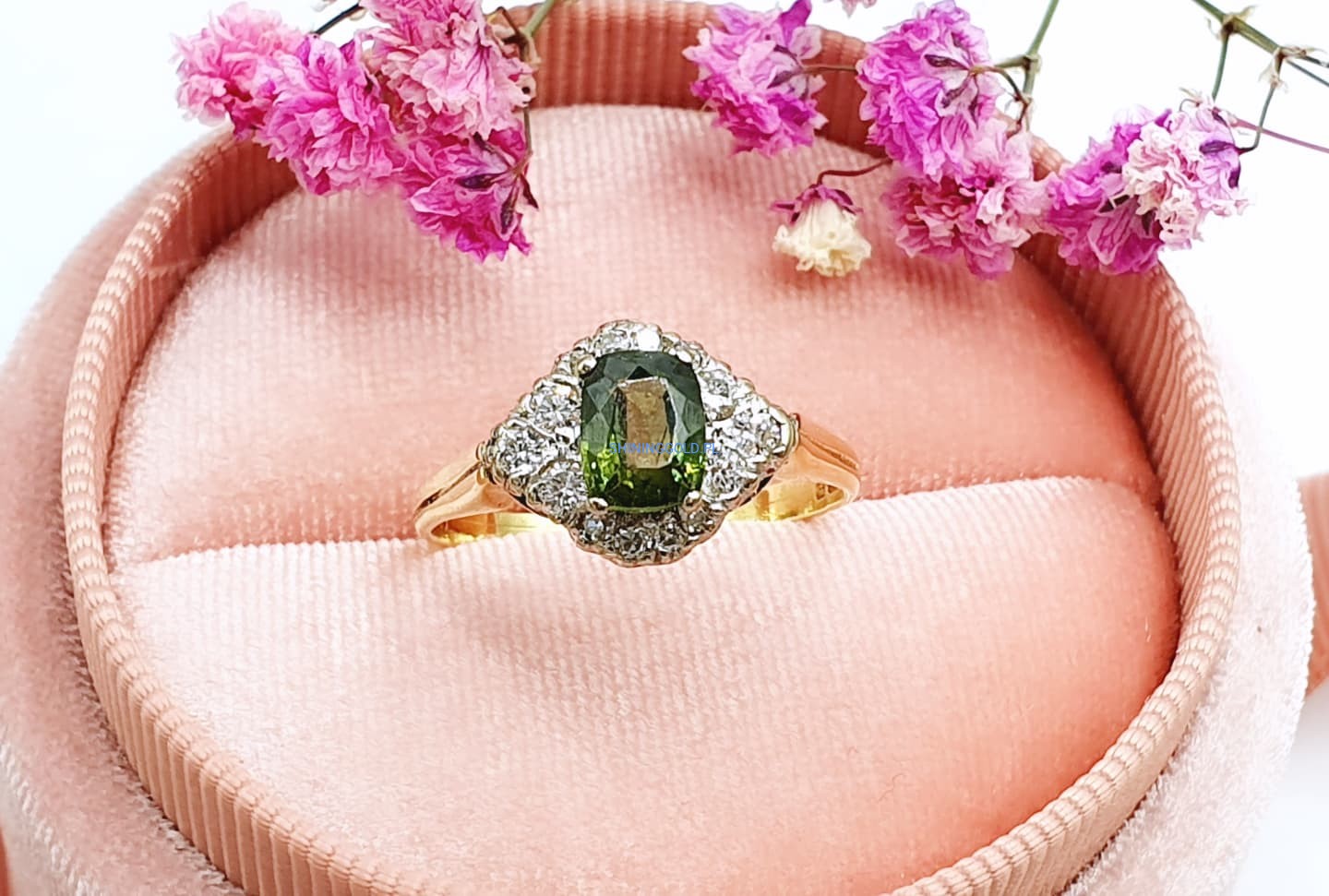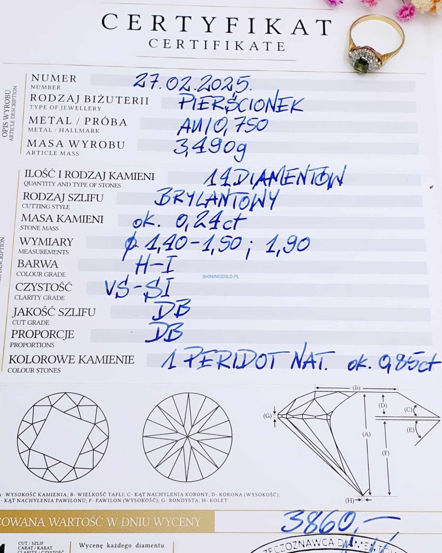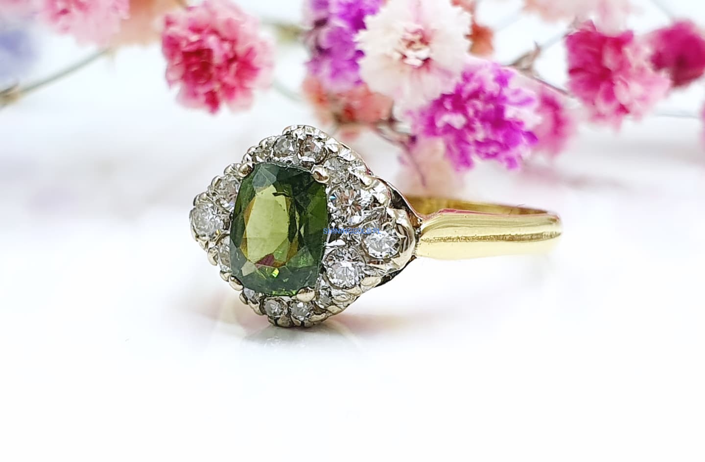 Złoty pierścionek z Peridotem i Diamentami (1111.WS)
