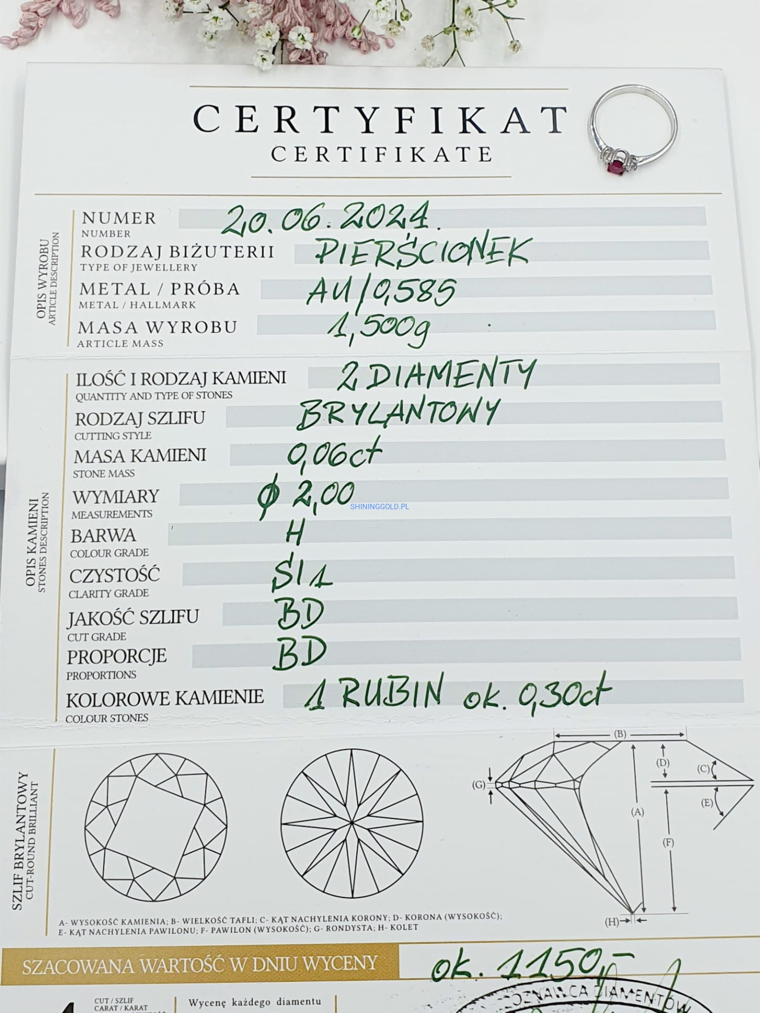 - Diamenty: 2 w szlifie brylantowym, masa ok. 0,06ct, czystość SI1, barwa H