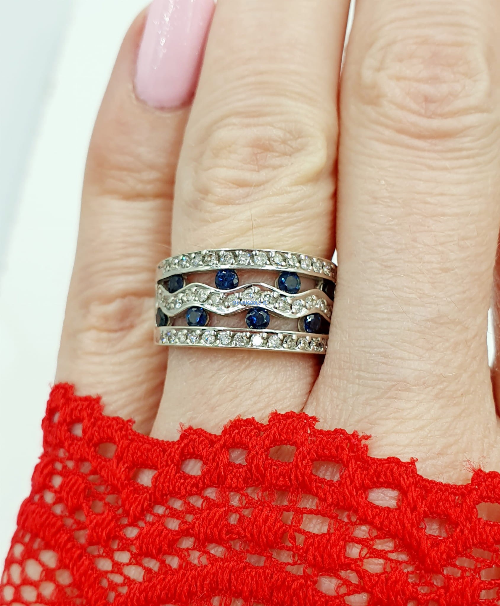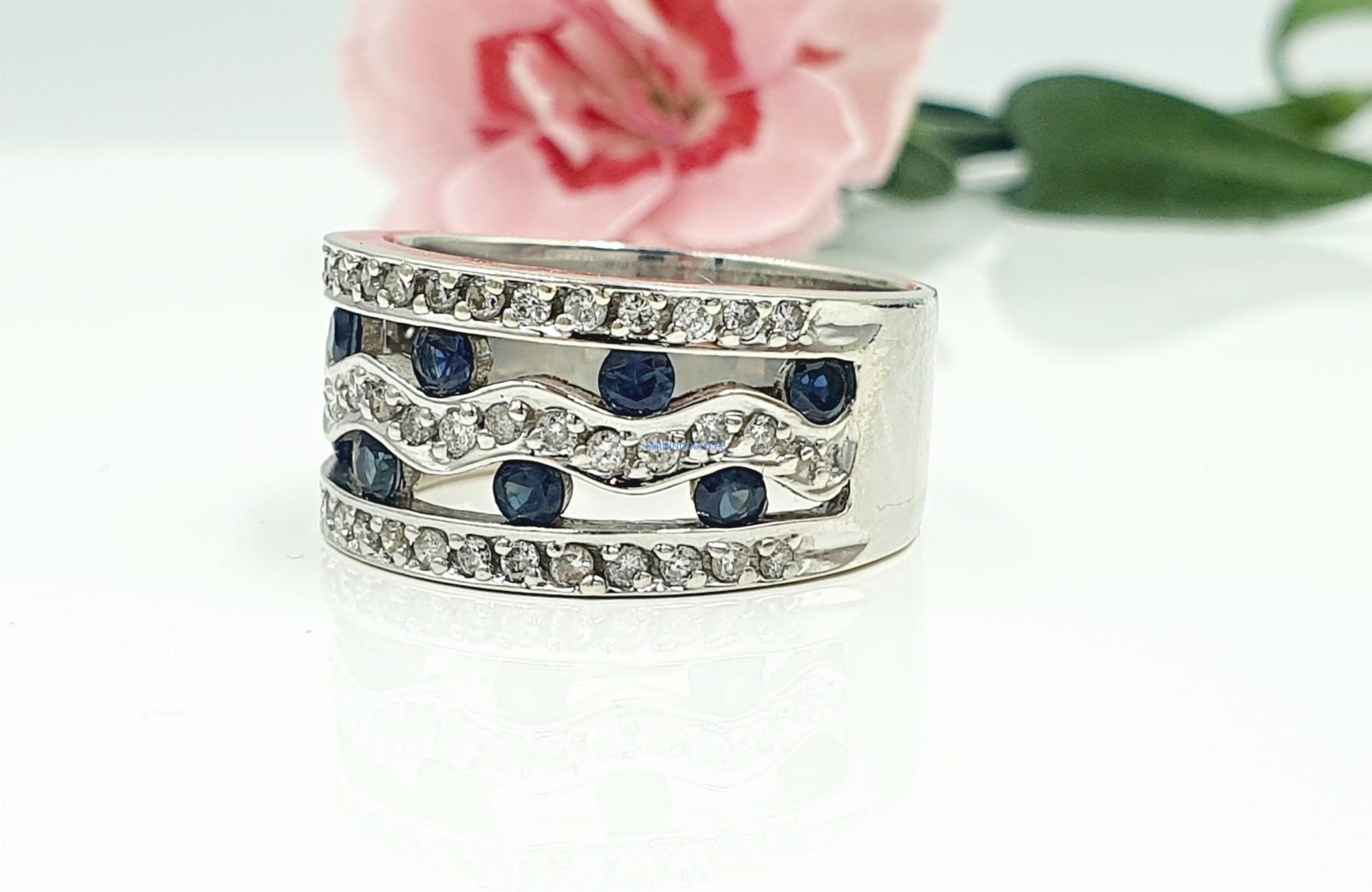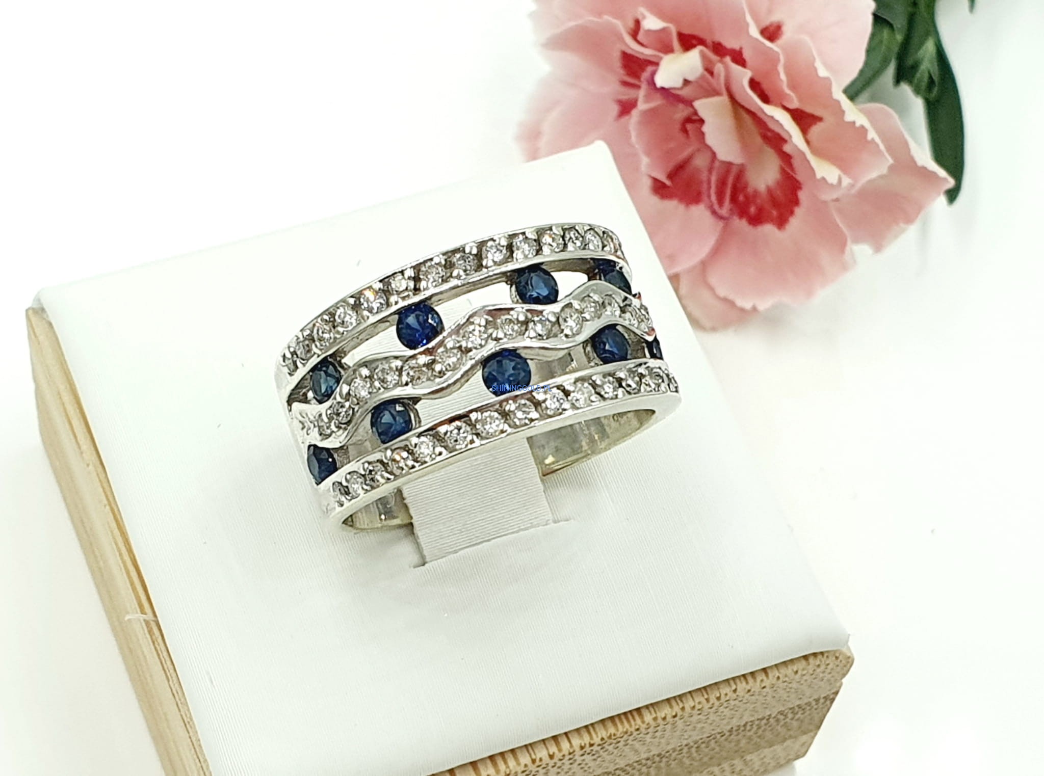 - Elegancki design z pięknymi szafirami i lśniącymi diamentami.