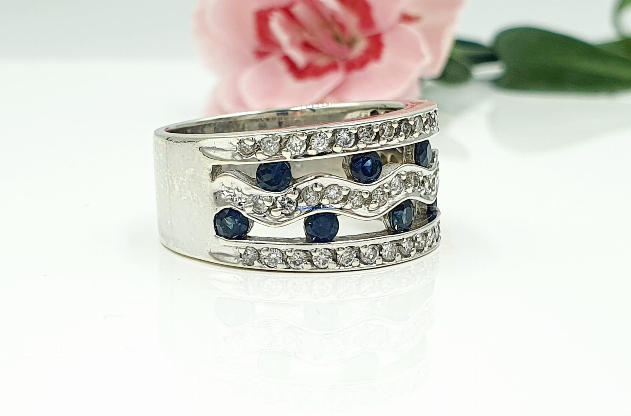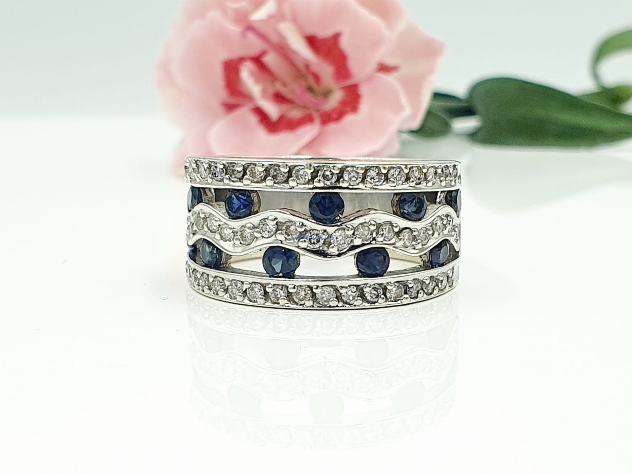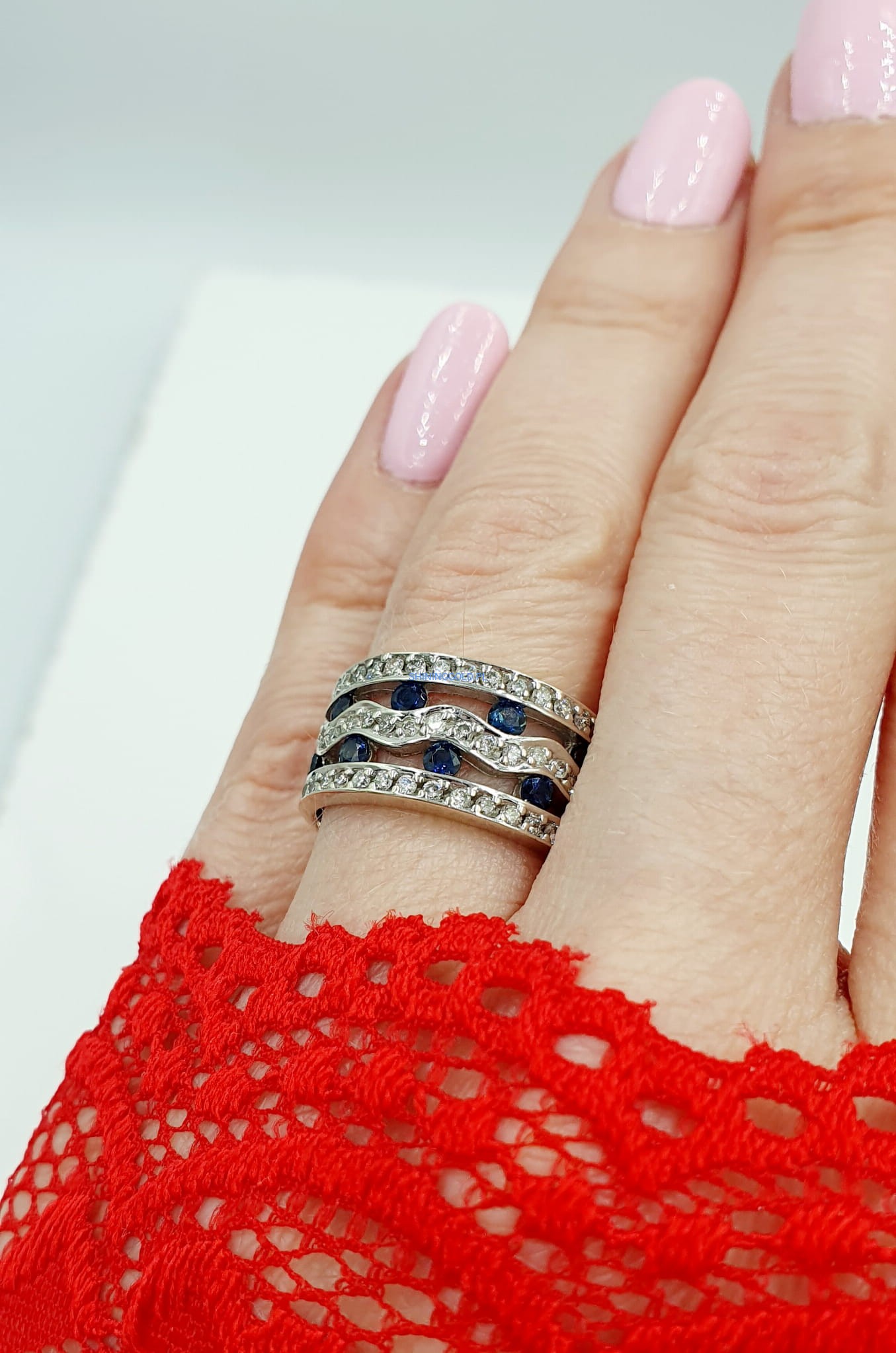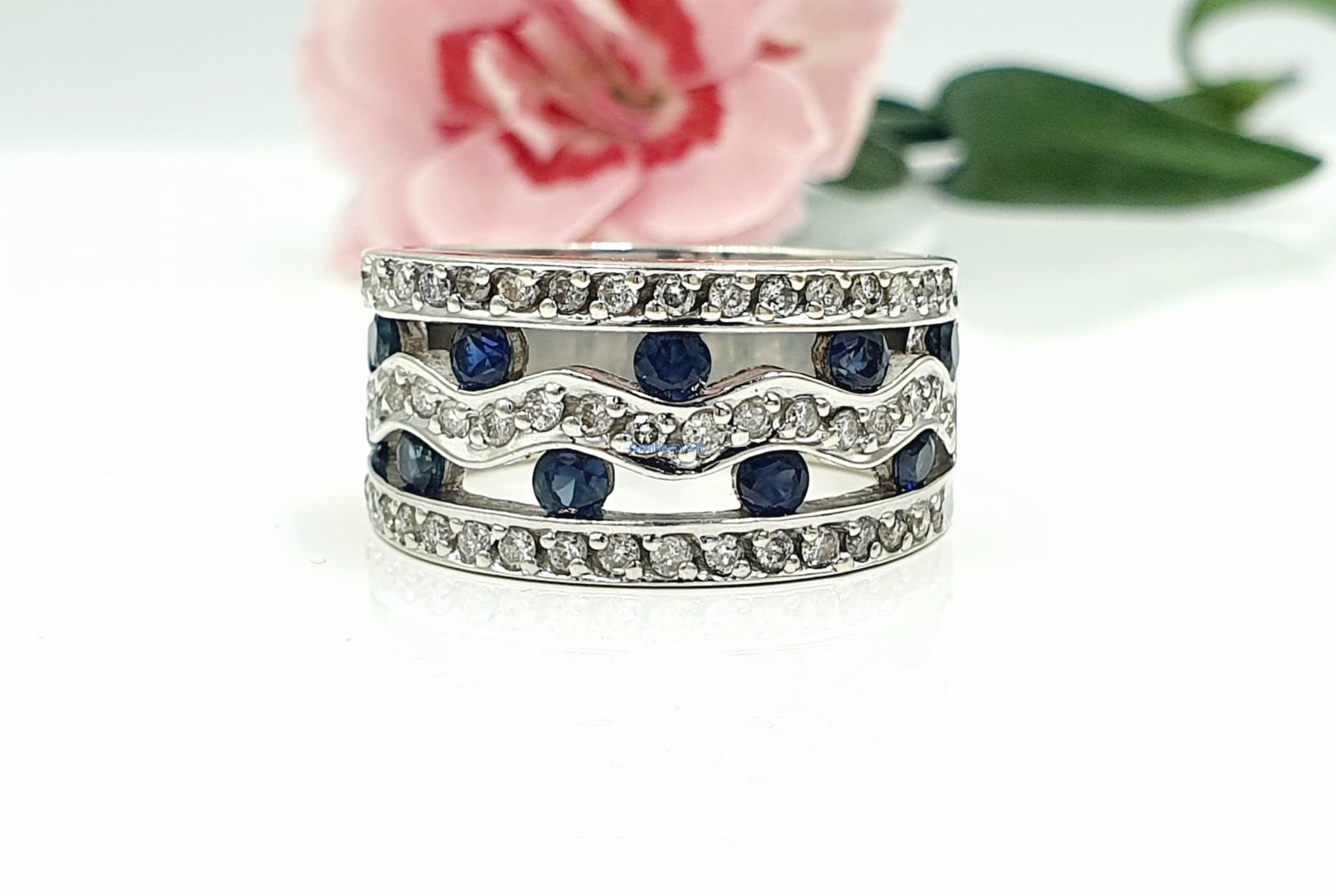 - Elegancki design z pięknymi szafirami i lśniącymi diamentami.
