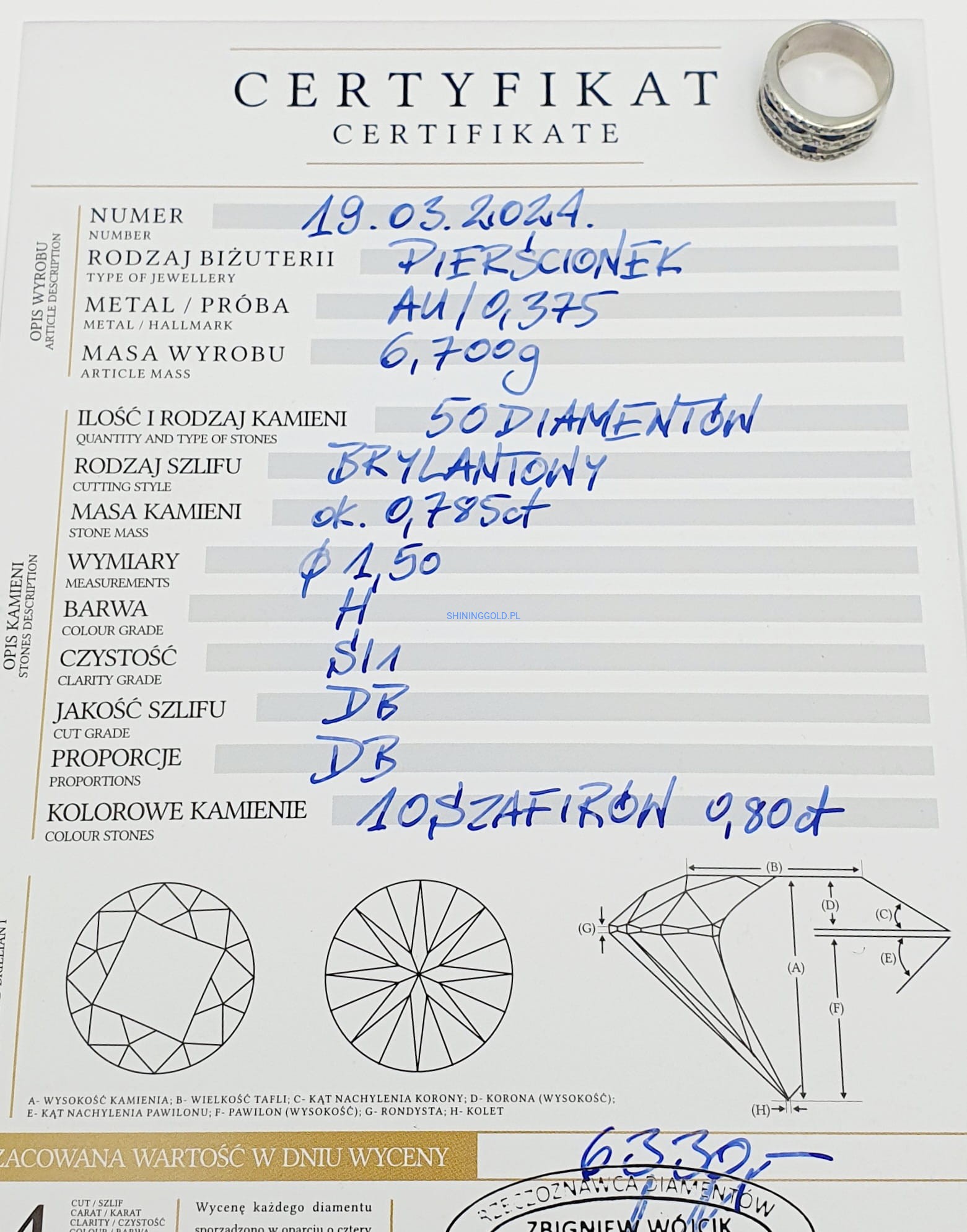 - Kamienie: 50 diamentów w szlifie brylantowym (ok. 0,785 ct), czystość SI1, barwa H