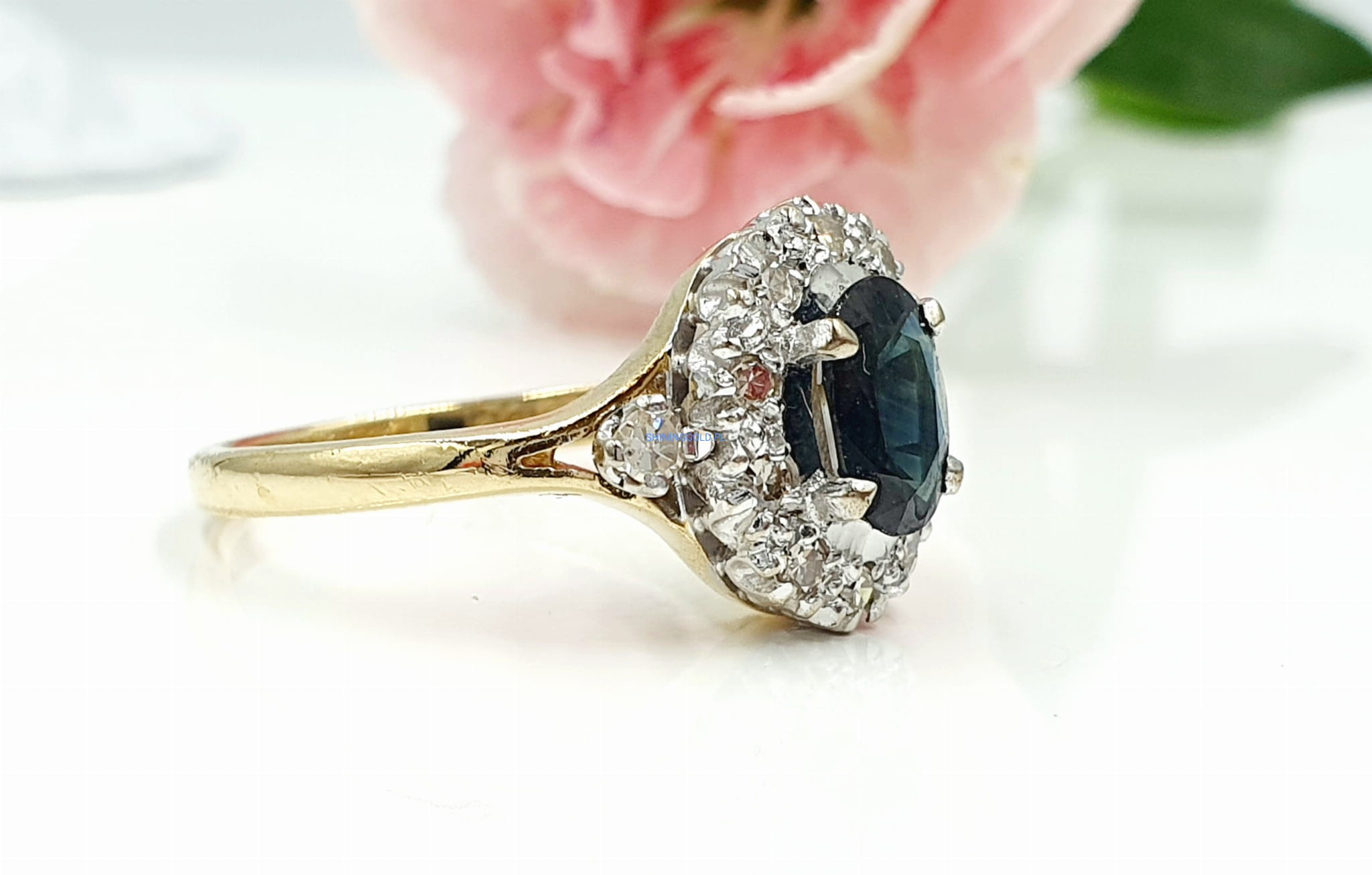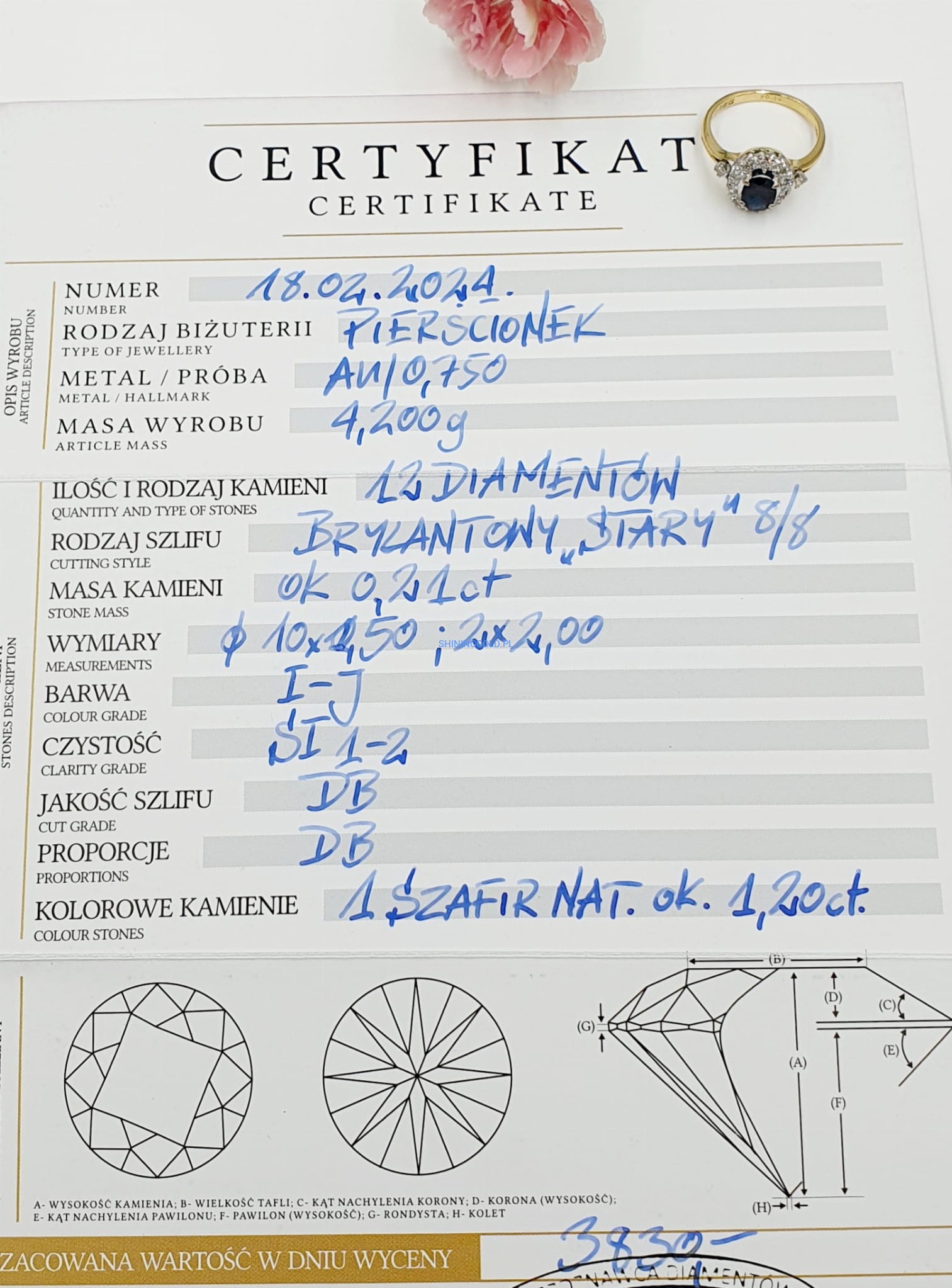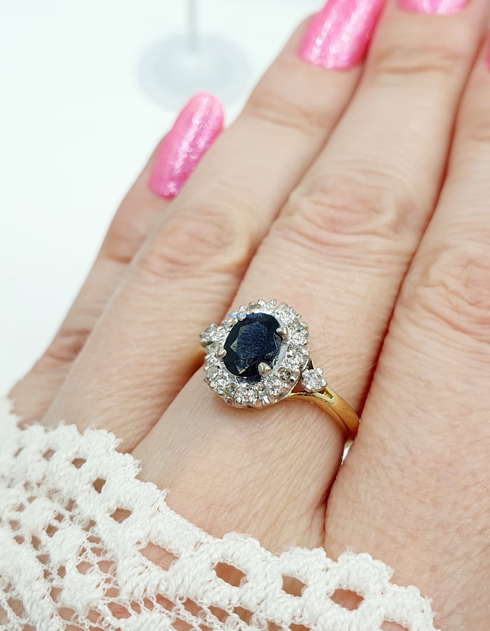 - Piękno kamieni: Diamenty o wysokiej czystości i szlifie brylantowym "starym" 8/8 oraz naturalny szafir o intensywnym kolorze nadają pierścionkowi niezwykły urok.