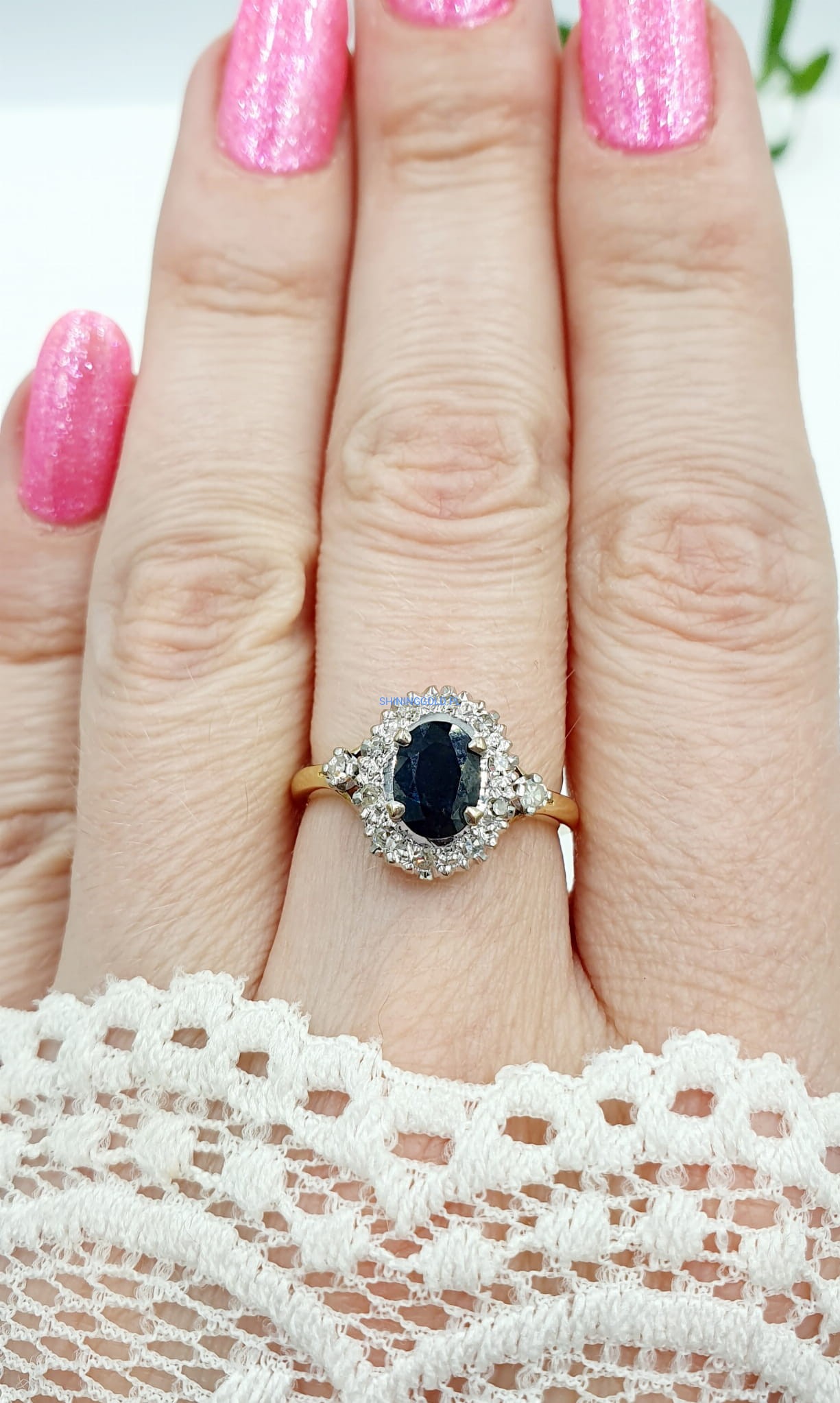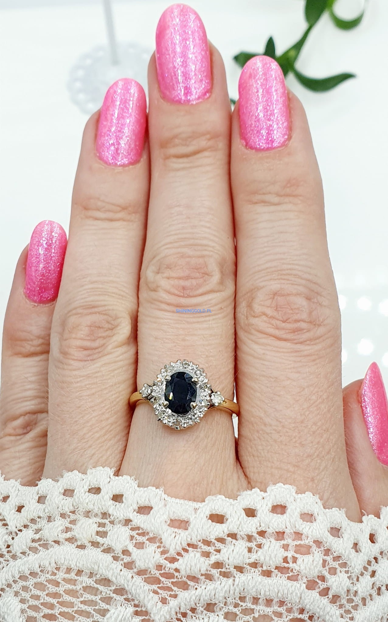 Dodaj ten wyjątkowy złoty pierścionek z szafirem i diamentami do swojej kolekcji biżuterii, ciesząc się jego niezwykłym blaskiem i elegancją każdego dnia.