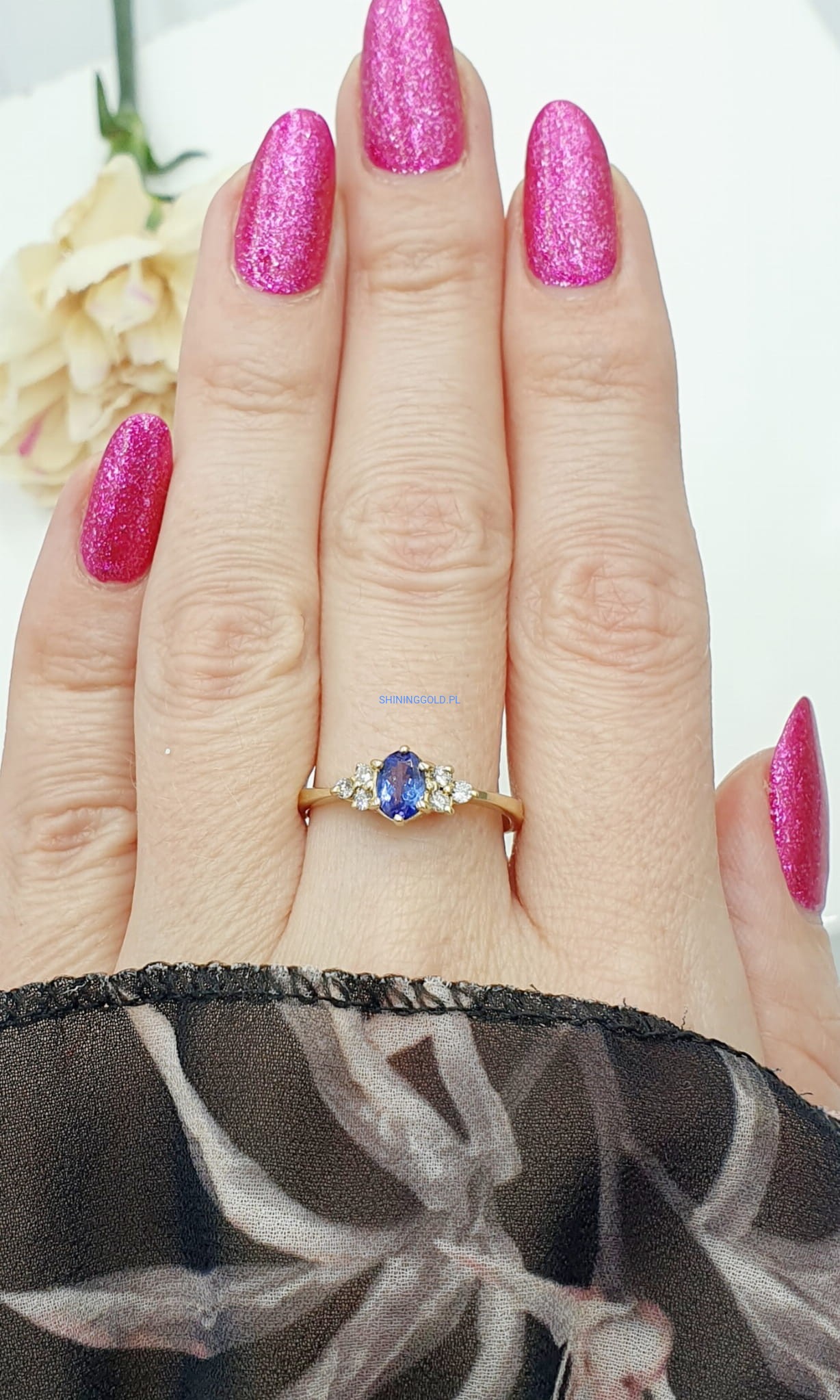 - Tanzanit – olśniewający kamień centralny o głębokiej, niebiesko-fioletowej barwie.