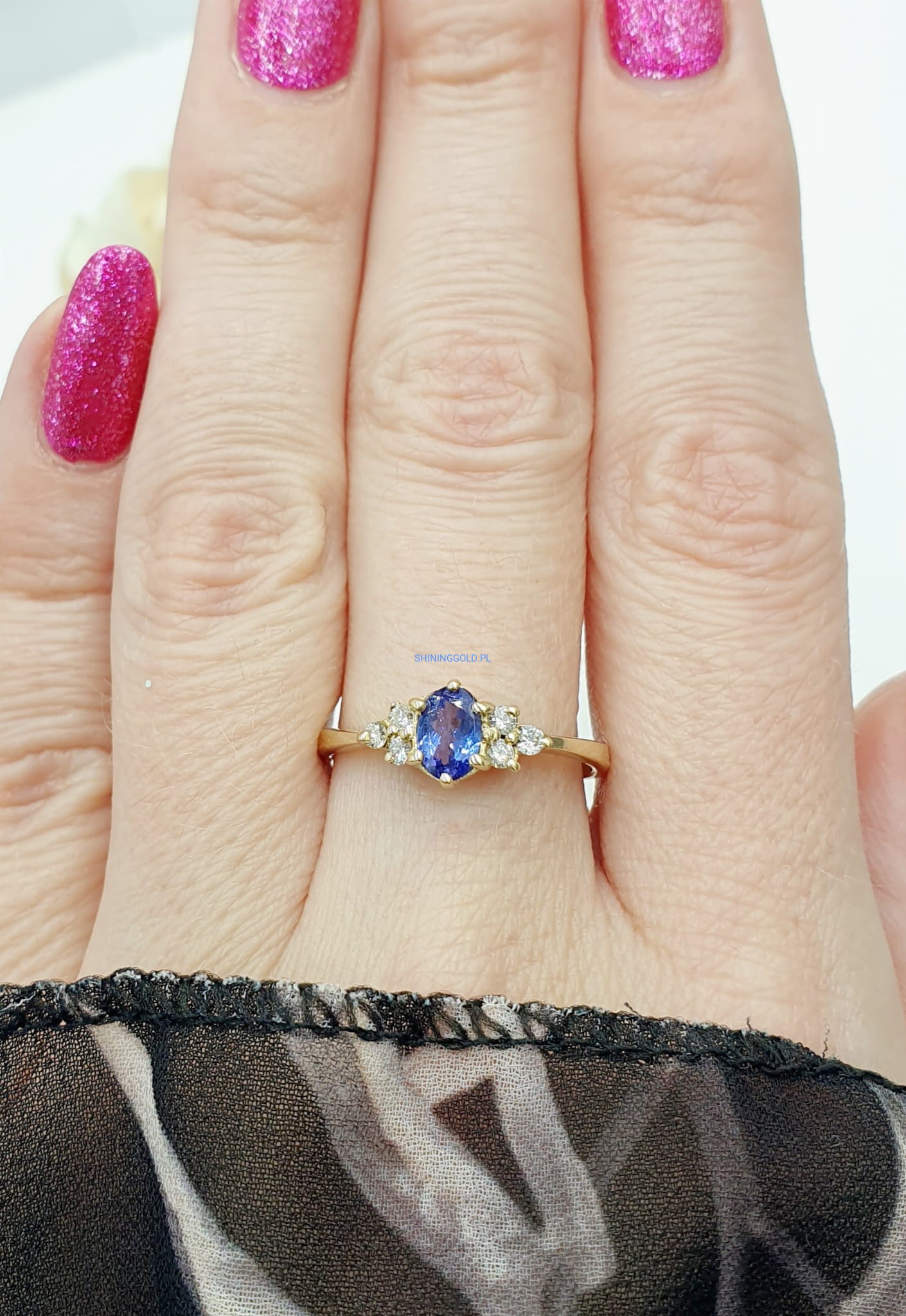 Złoty, nowy pierścionek z Tanzanitem i Diamentami