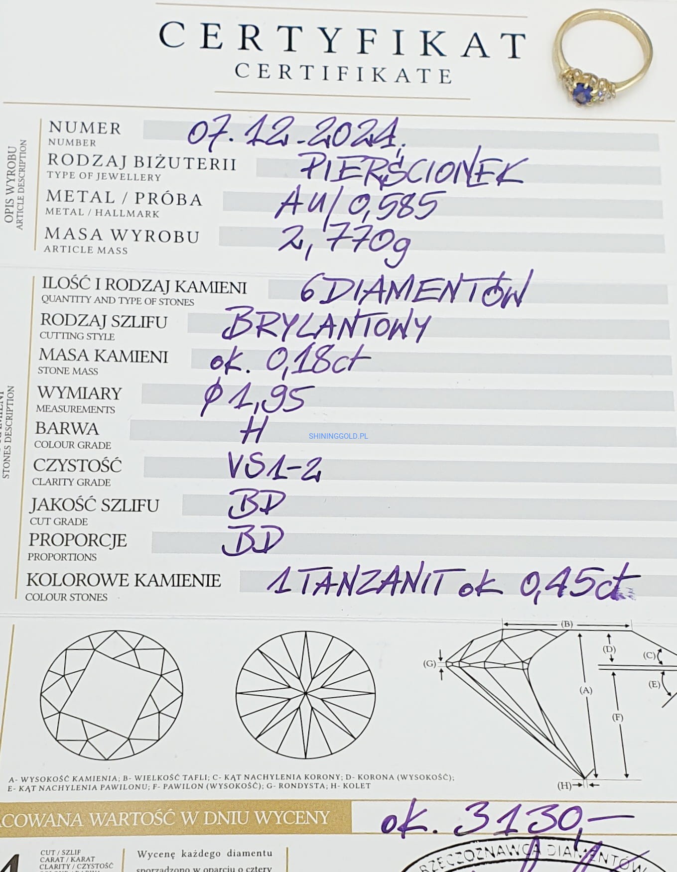- 6 diamentów – masa 0,18 ct, czystość VS1-2, barwa H.