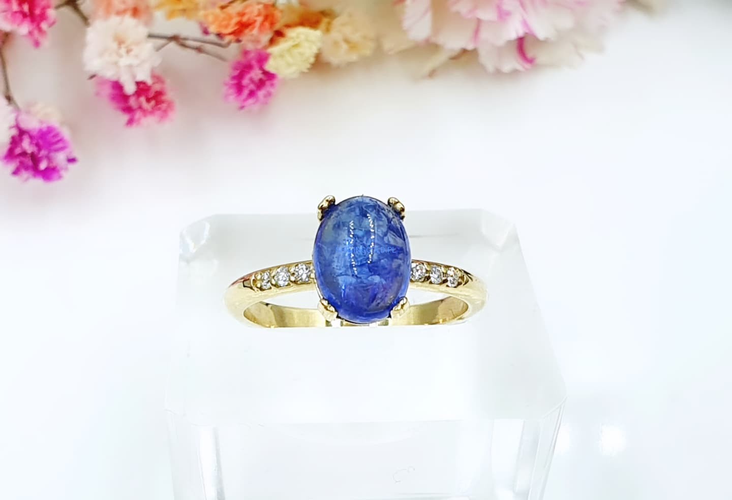 Elegancki pierścionek wykonany z wysokiej jakości złota próby 585, ozdobiony unikatowym tanzanitem i subtelnym blaskiem sześciu diamentów. Doskonały wybór dla miłośników ekskluzywnej biżuterii, idealny na prezent lub wyjątkową okazję.