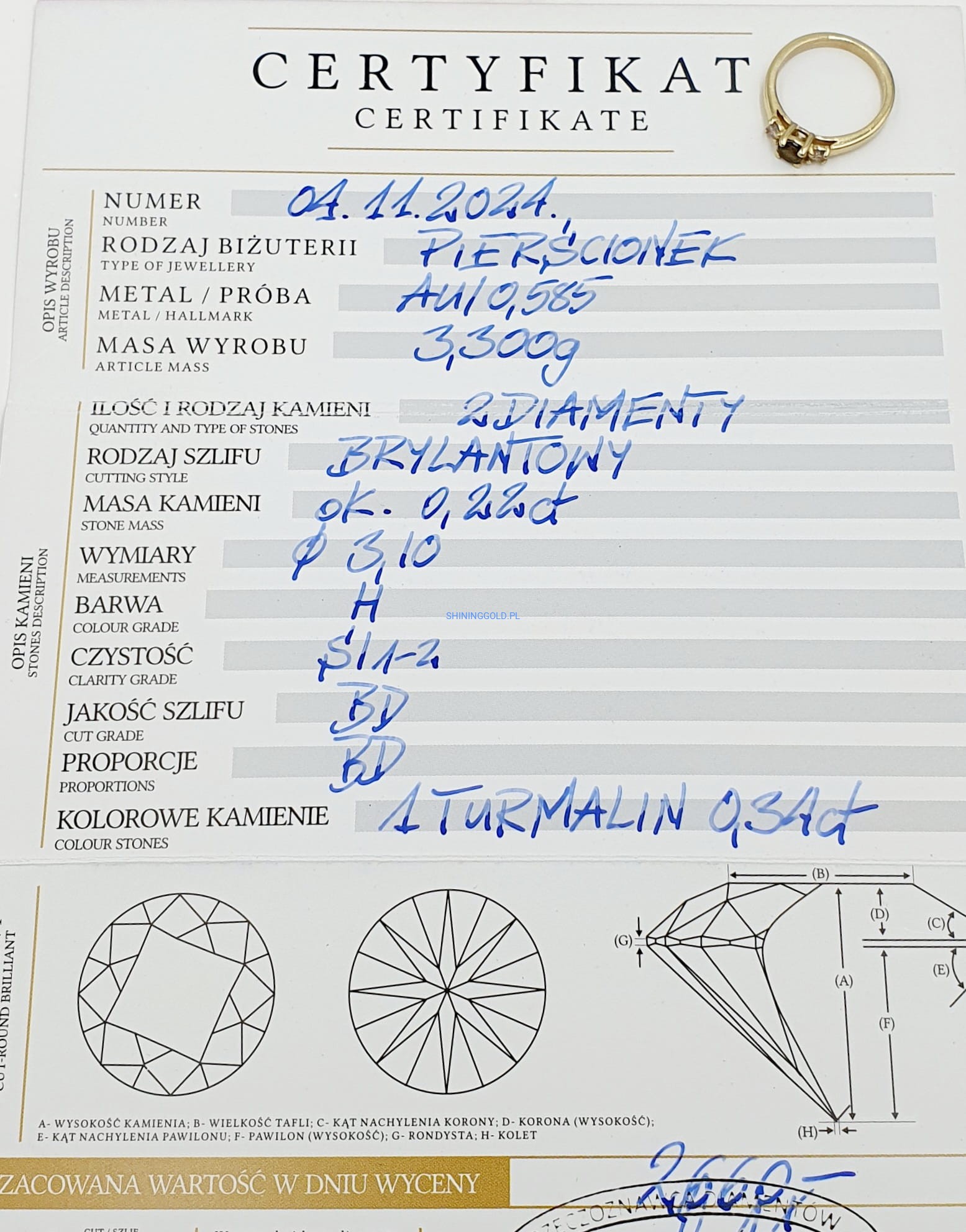 Złoty pierścionek z Turmalinem i Diamentami (1035.WS)