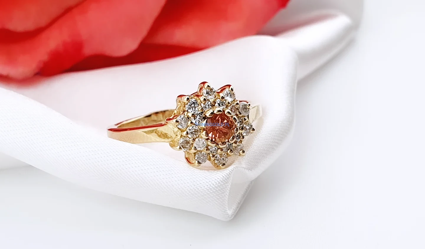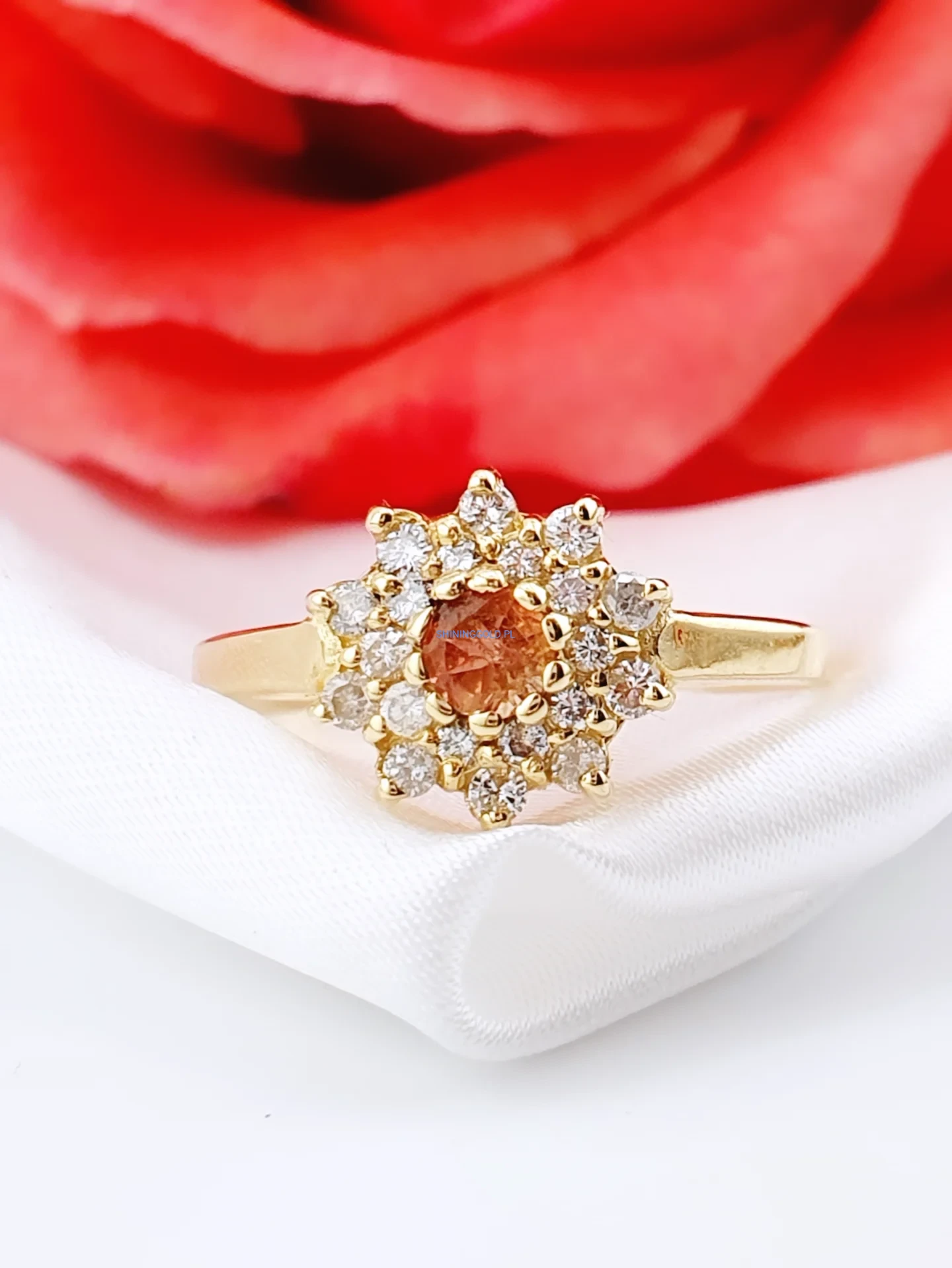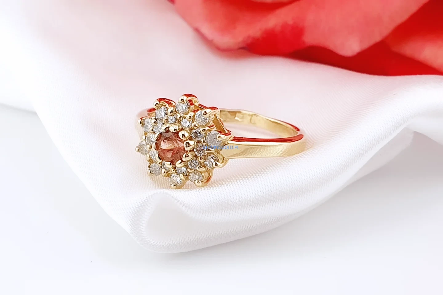Elegancki pierścionek wykonany ze złota, ozdobiony naturalnym turmalinem w ciepłej, szlachetnej barwie. Centralny kamień otoczony jest misterną rozetą z diamentów o brylantowym szlifie, które pięknie podkreślają blask i głębię kamienia głównego.