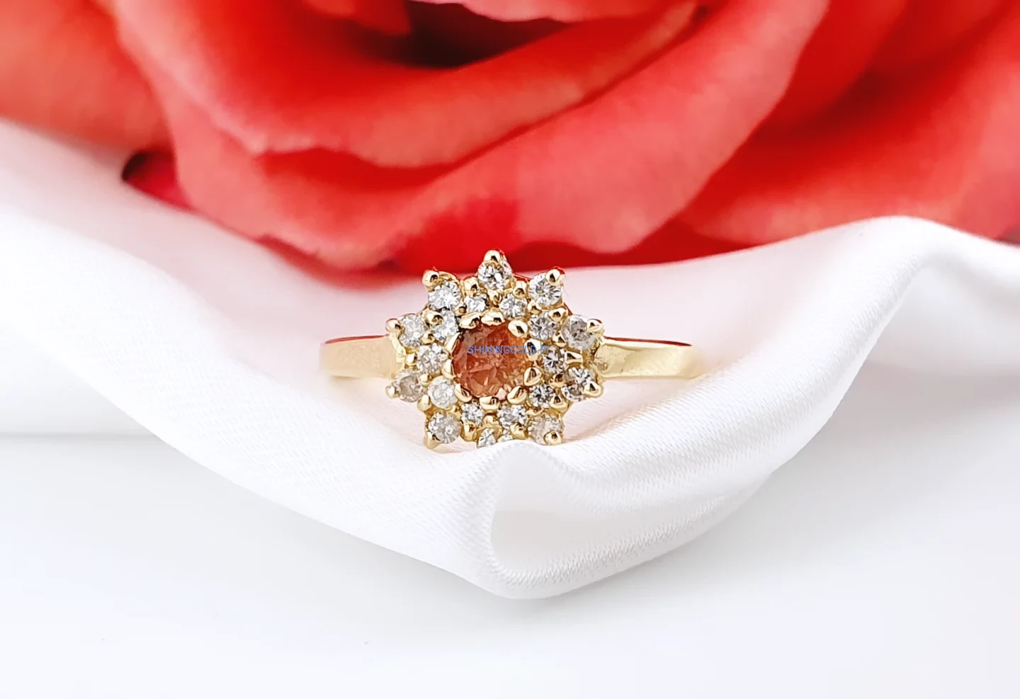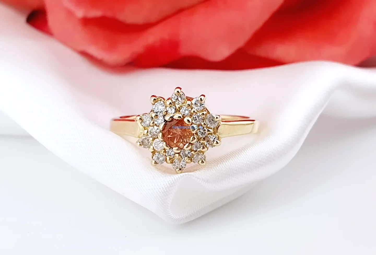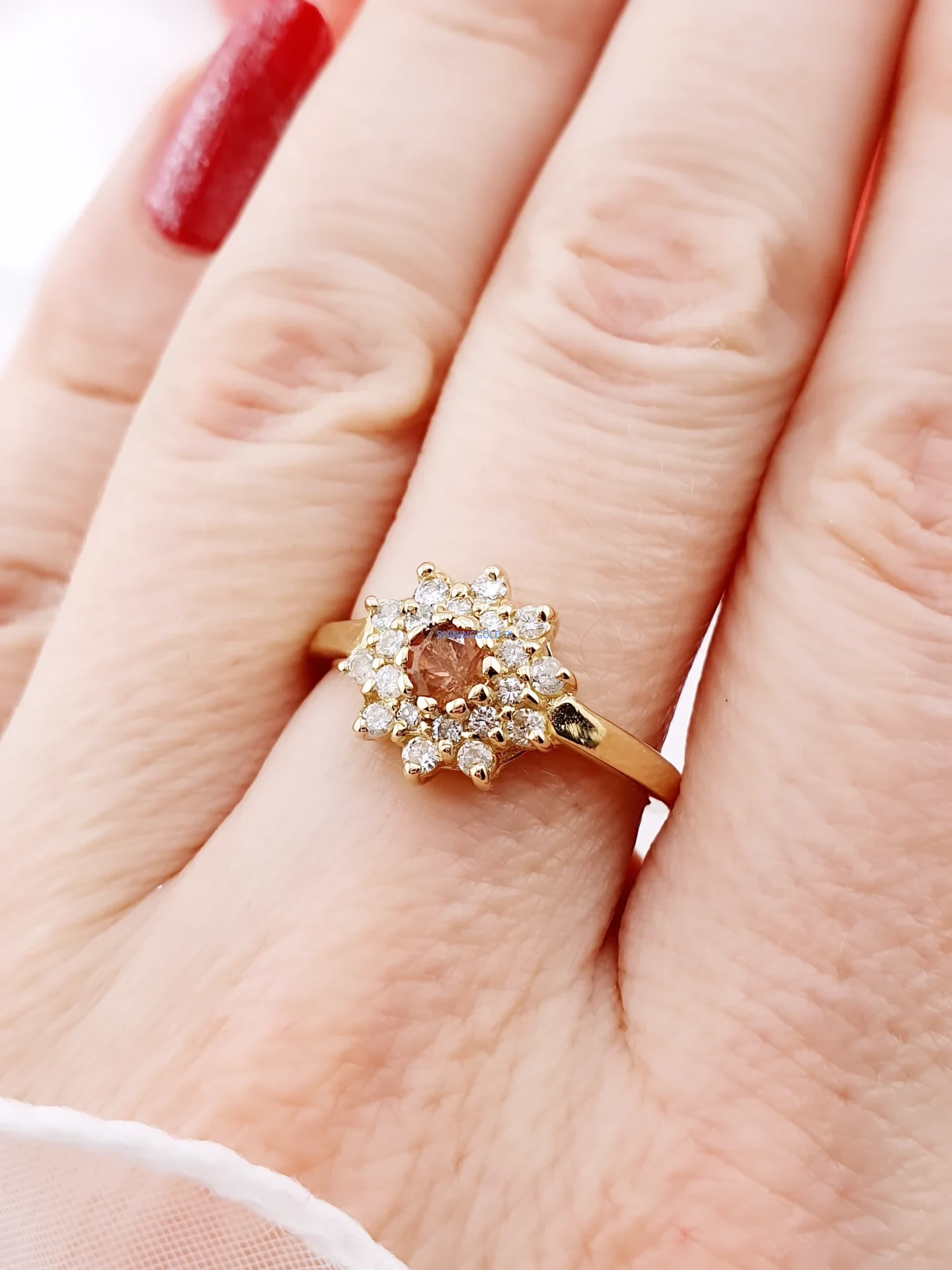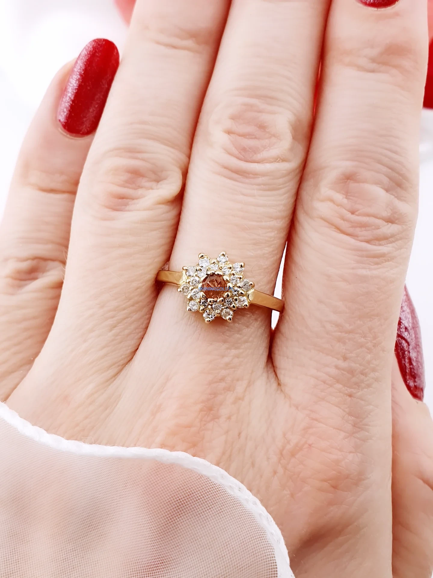 Elegancki pierścionek wykonany ze złota, ozdobiony naturalnym turmalinem w ciepłej, szlachetnej barwie. Centralny kamień otoczony jest misterną rozetą z diamentów o brylantowym szlifie, które pięknie podkreślają blask i głębię kamienia głównego.