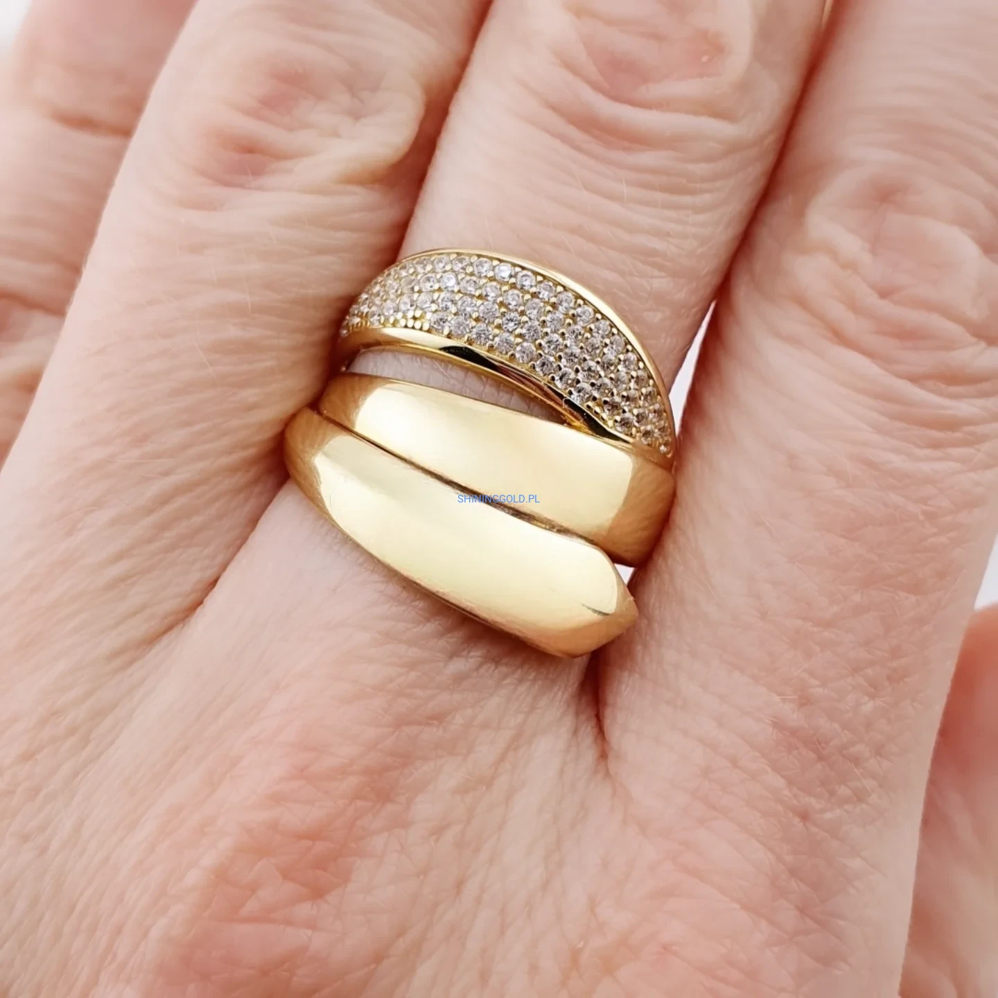 Efektowny pierścionek wykonany ze złota próby 585, zachwycający nowoczesnym, falującym kształtem. Jedna z części została bogato wysadzana drobnymi cyrkoniami, które pięknie odbijają światło i nadają biżuterii luksusowego charakteru. Połączenie gładkiej, polerowanej powierzchni ze zdobionym pasem tworzy harmonijną i bardzo kobiecą całość.