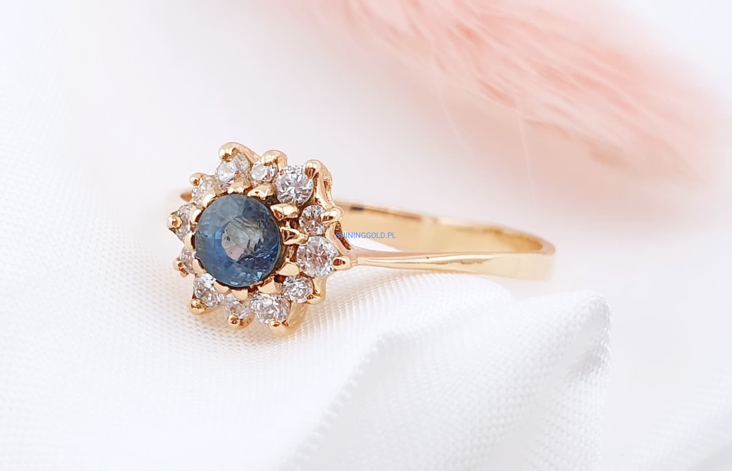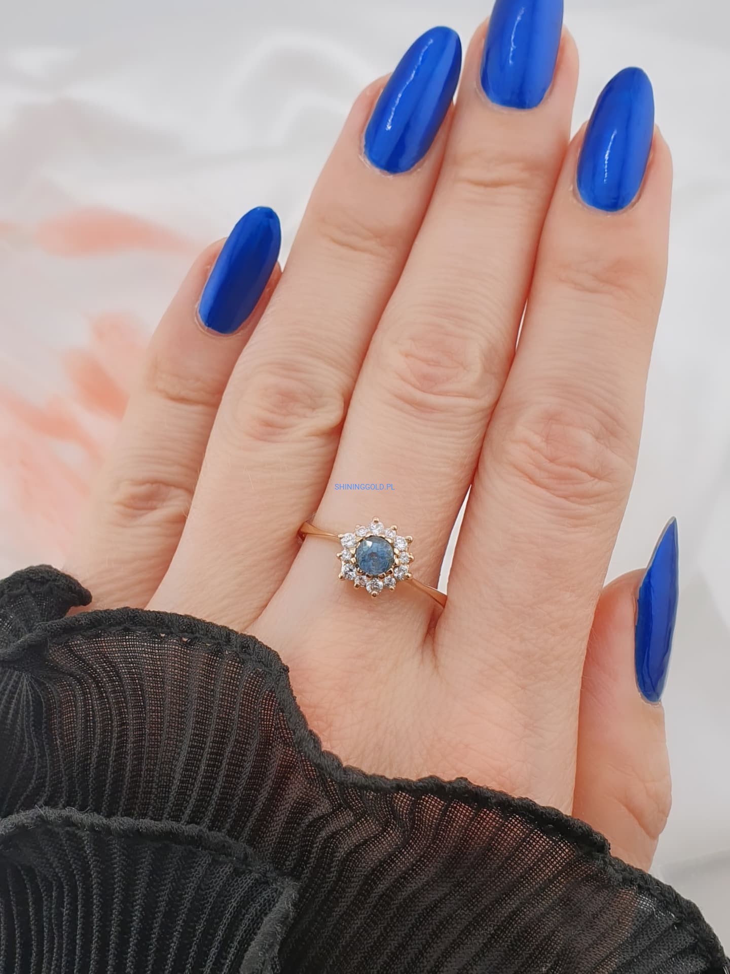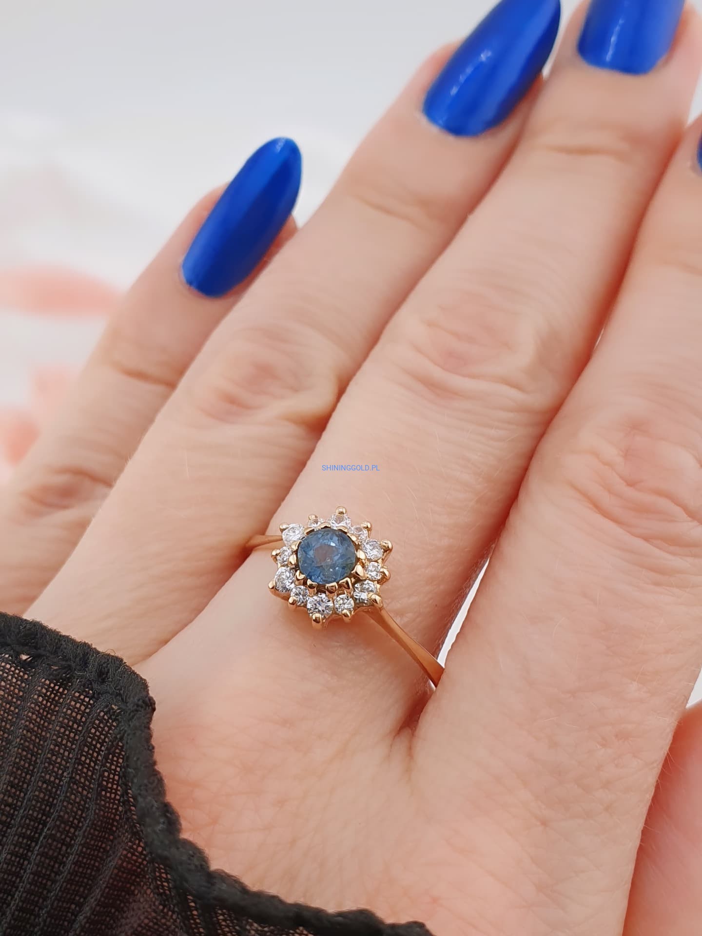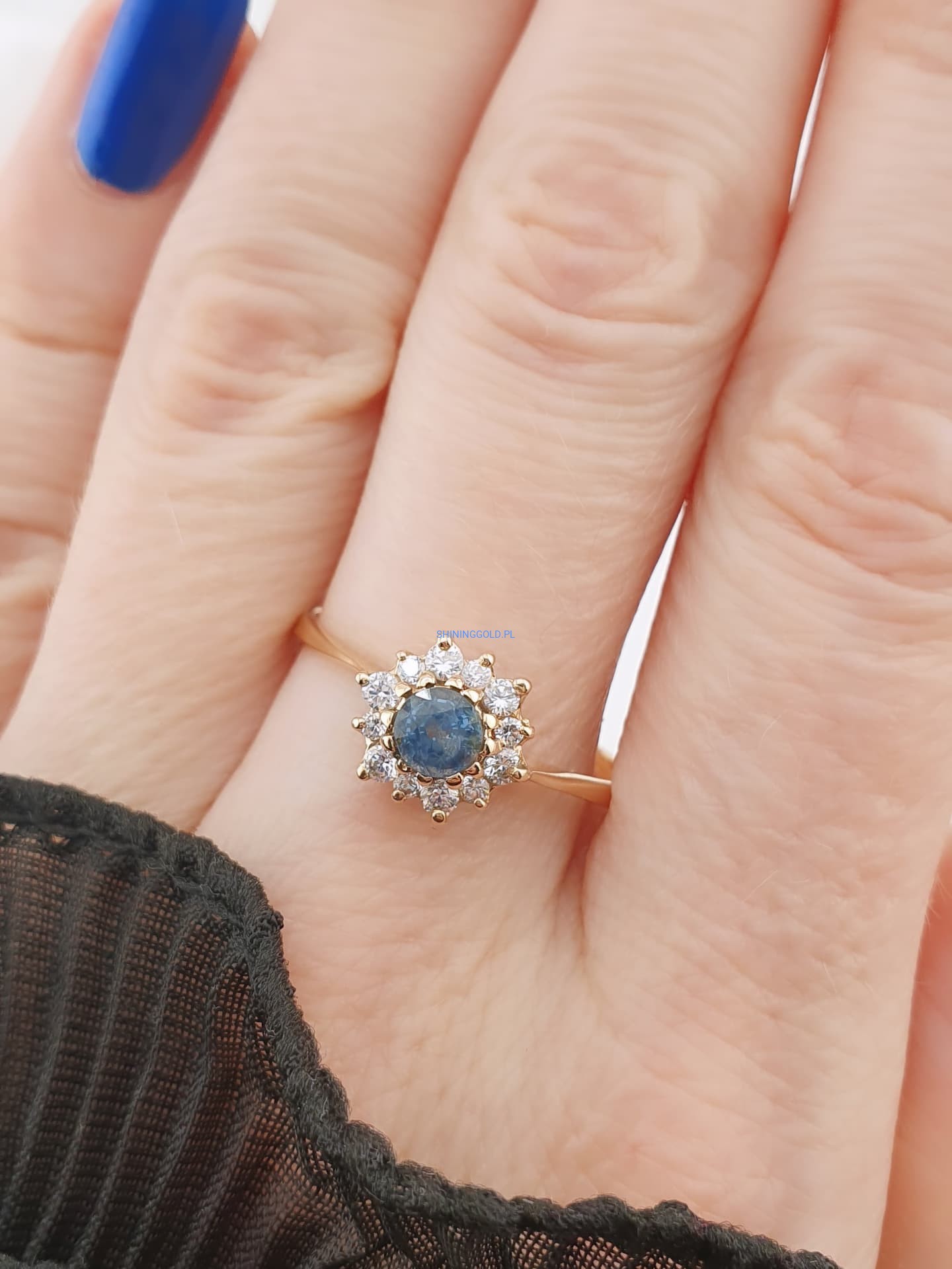 Złoty pierścionek z cyrkoniami to wyjątkowa propozycja dla osób ceniących elegancję i subtelny blask. Centralny kamień w głębokim odcieniu niebieskiego otoczony został jasnymi cyrkoniami, tworząc efektowną kompozycję przypominającą promienistą gwiazdę. Wykonany ze złota próby 585, łączy w sobie klasykę i nowoczesny szyk, sprawiając, że doskonale sprawdzi się zarówno na co dzień, jak i przy wyjątkowych okazjach.