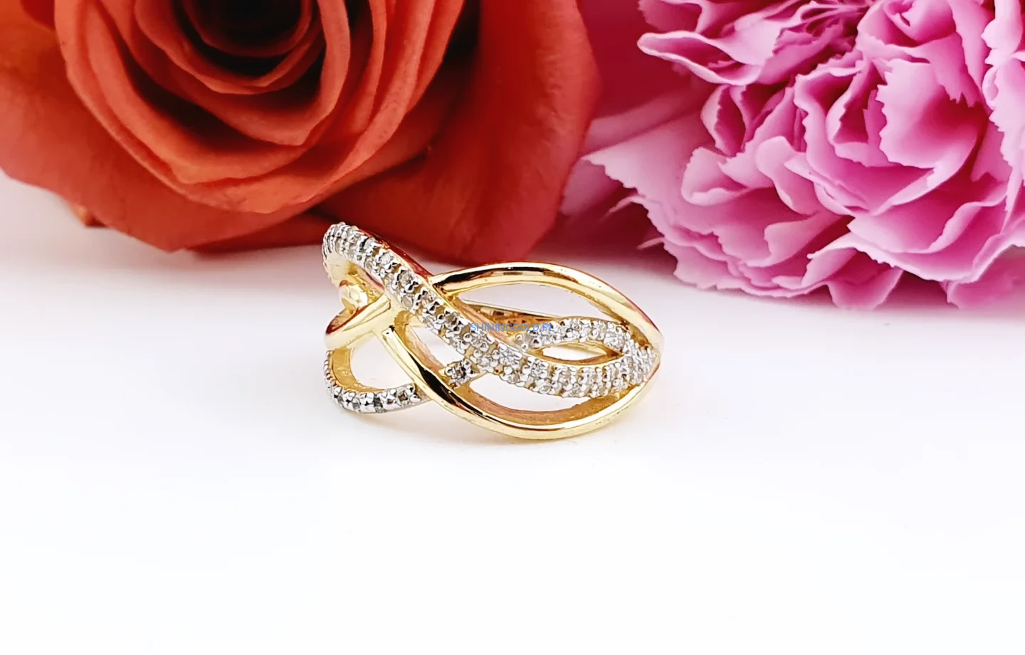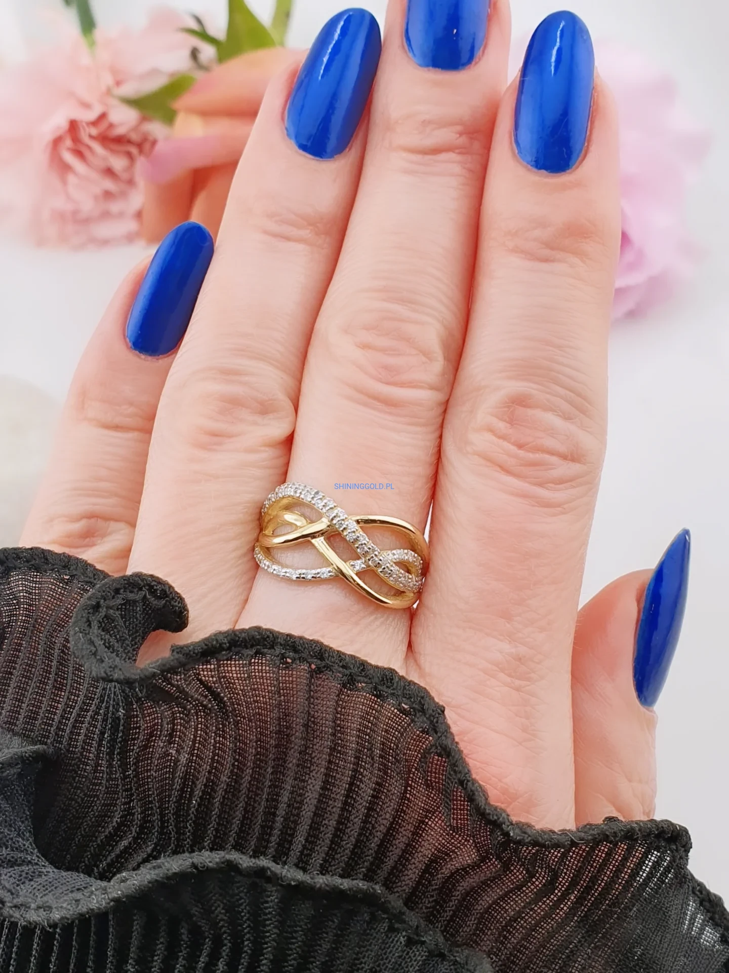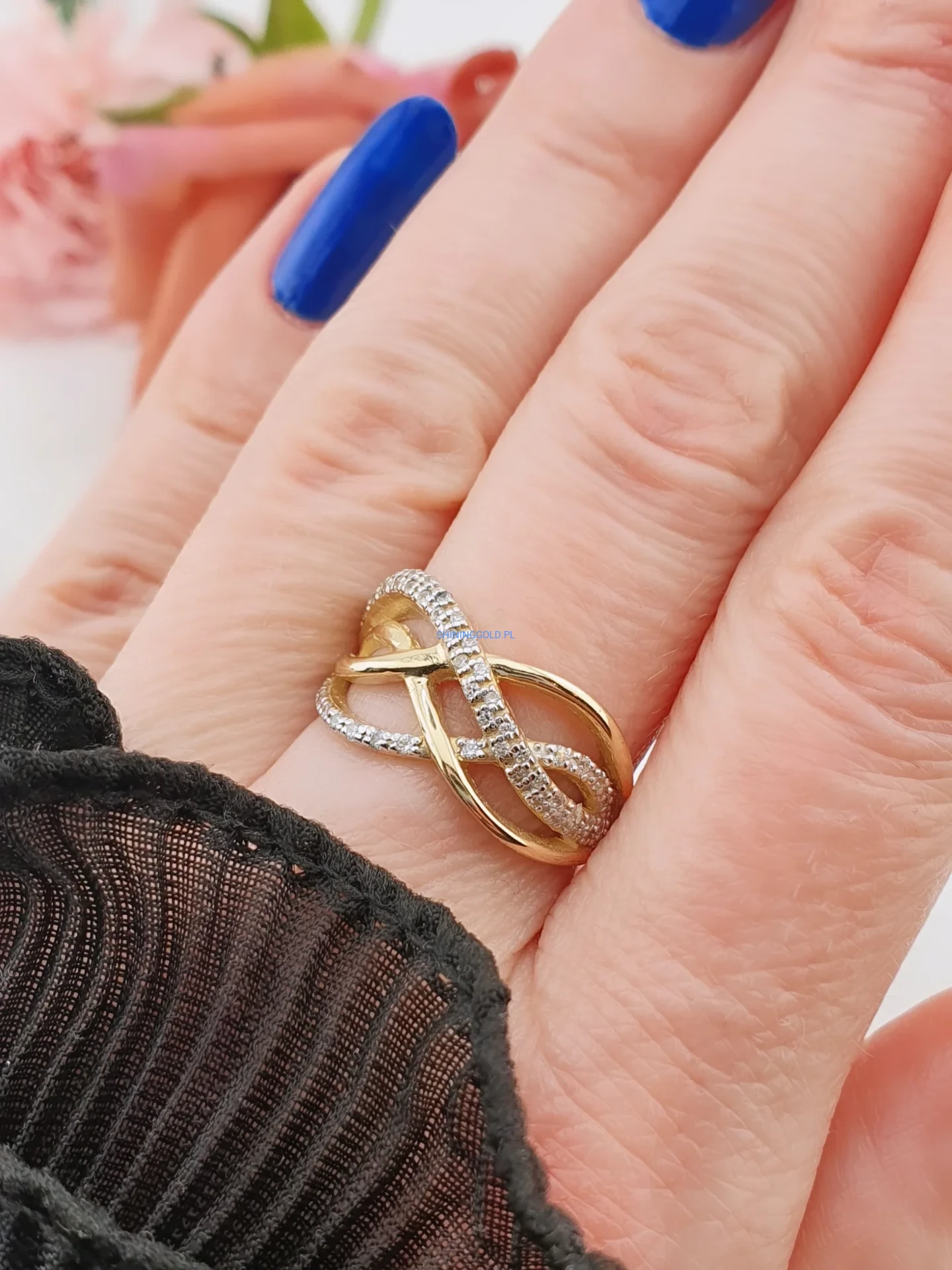 Elegancki pierścionek wykonany ze złota próby 585, zdobiony połyskującymi cyrkoniami. Motyw nieskończoności symbolizuje trwałość i wyjątkowe emocje, dzięki czemu biżuteria nabiera dodatkowego znaczenia.
