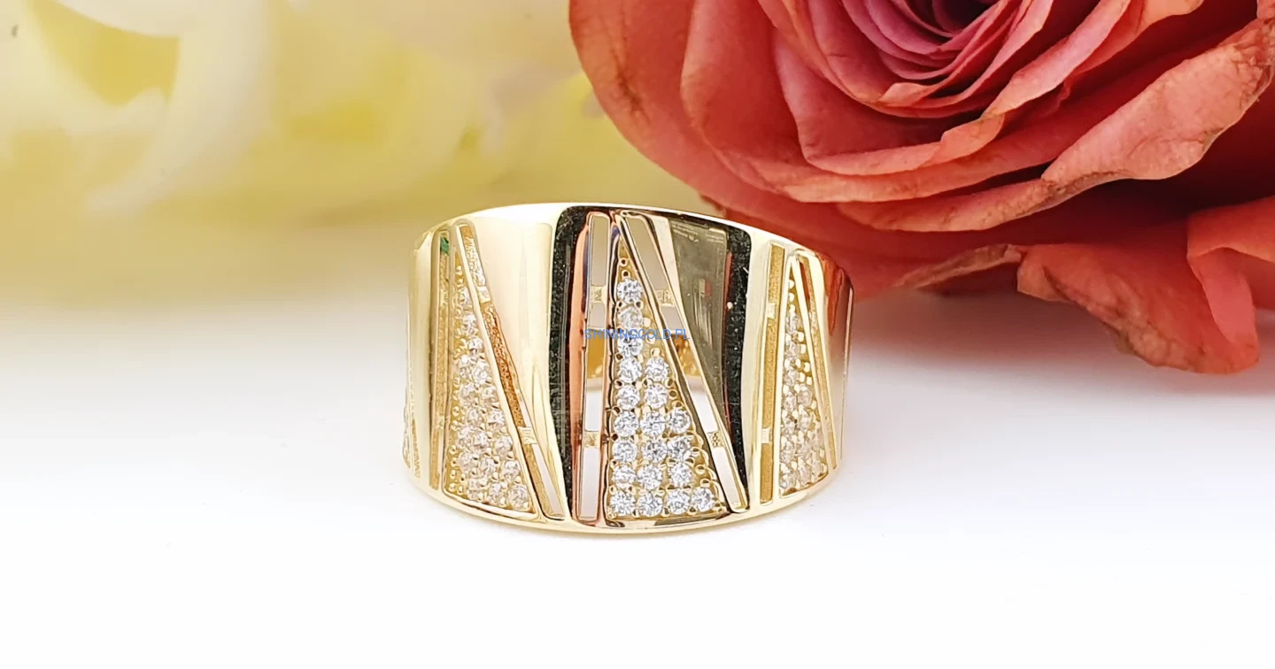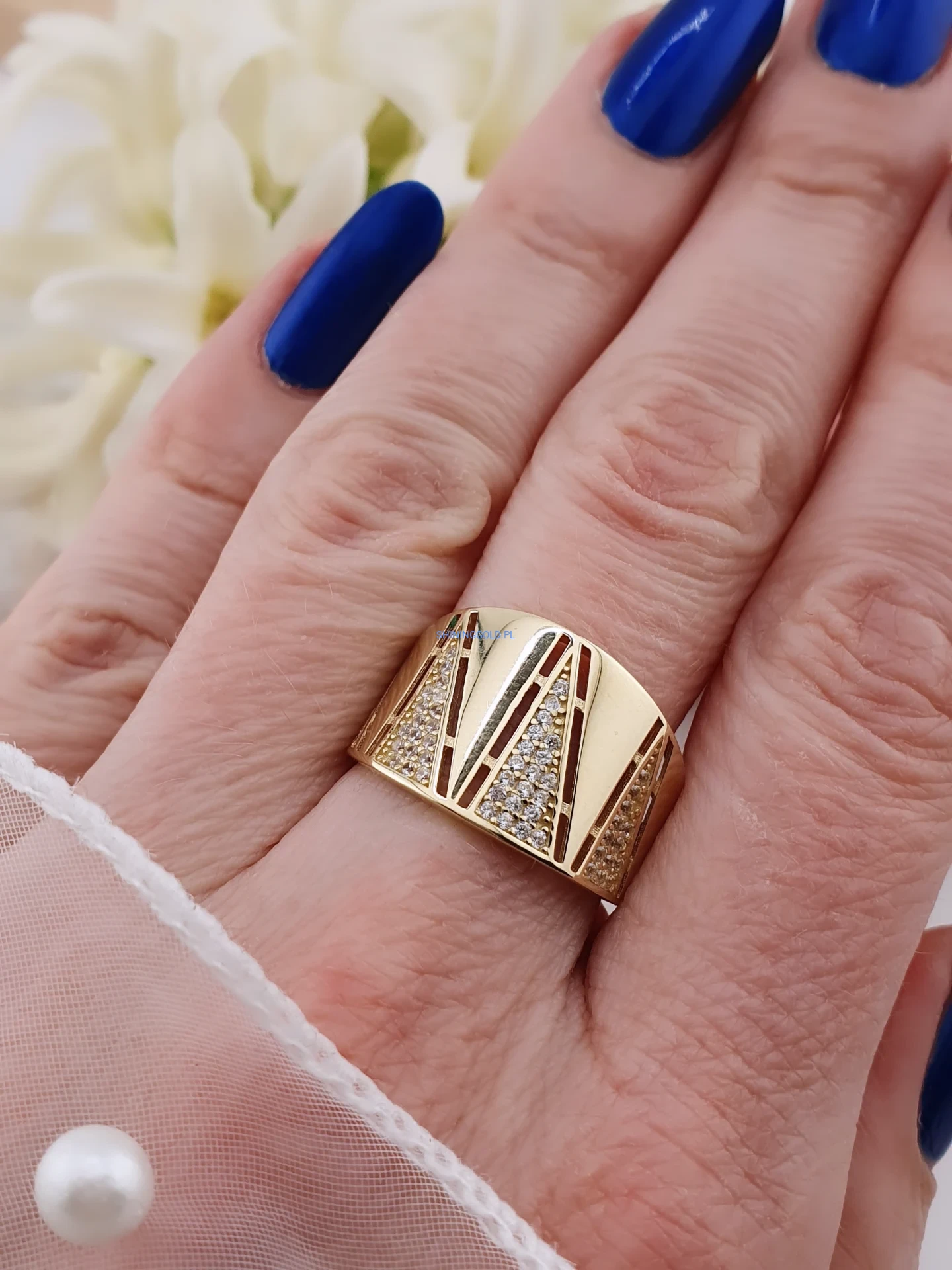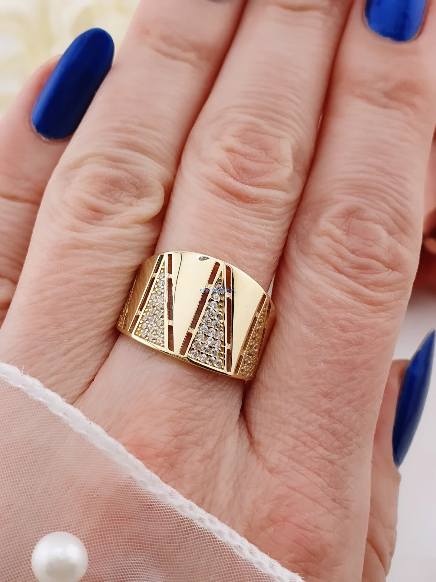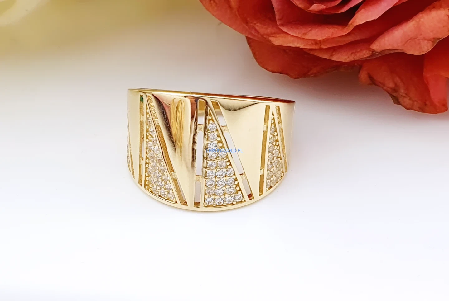 Złoty pierścionek z cyrkoniami – szeroki, geometryczny (060A)