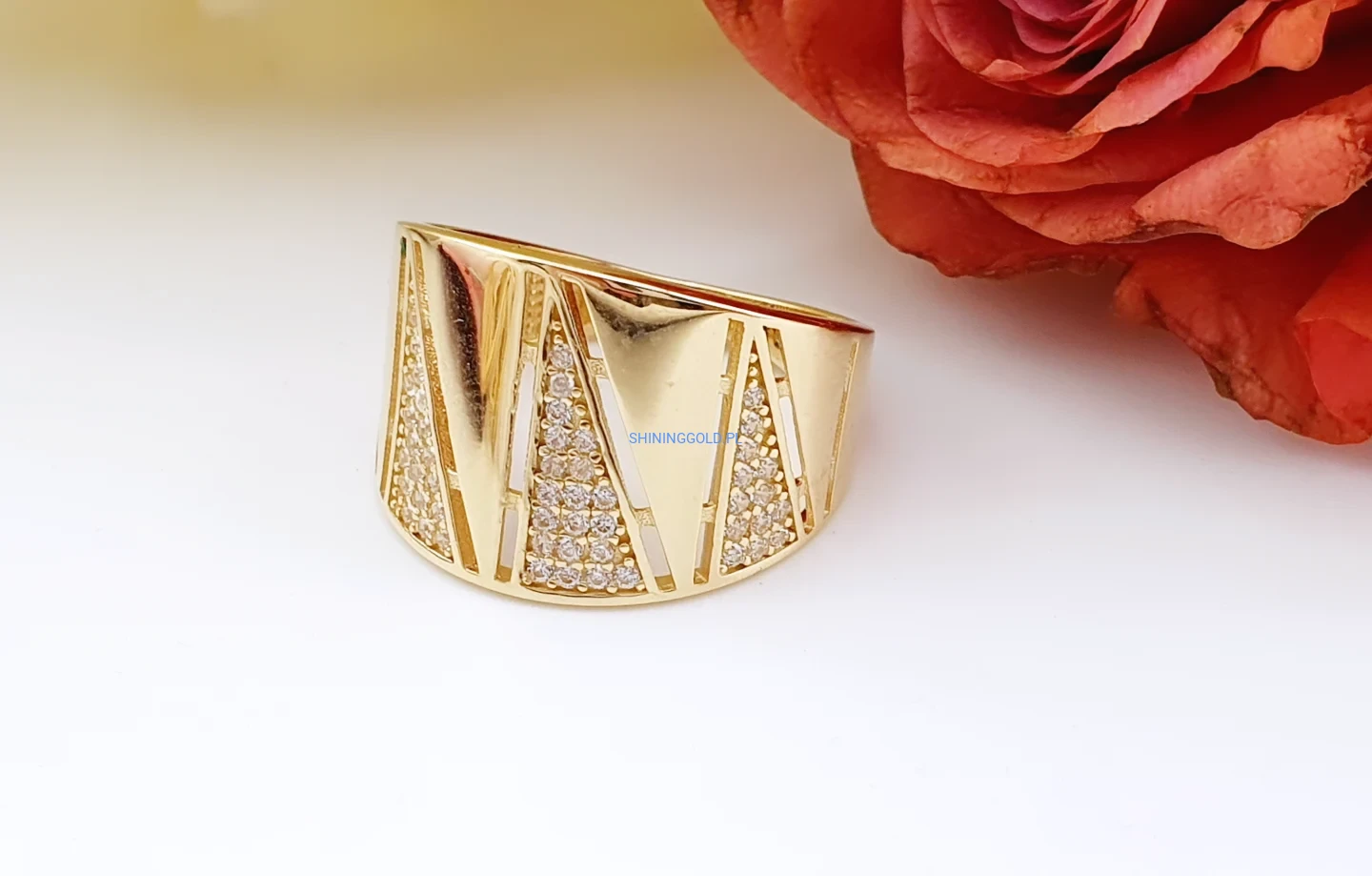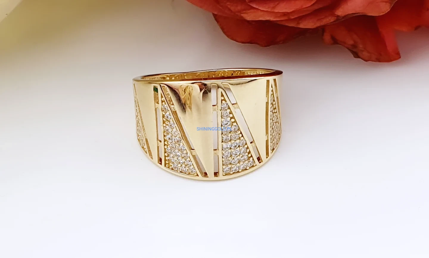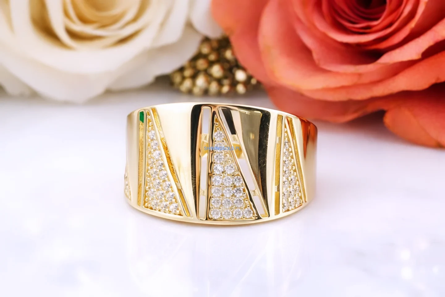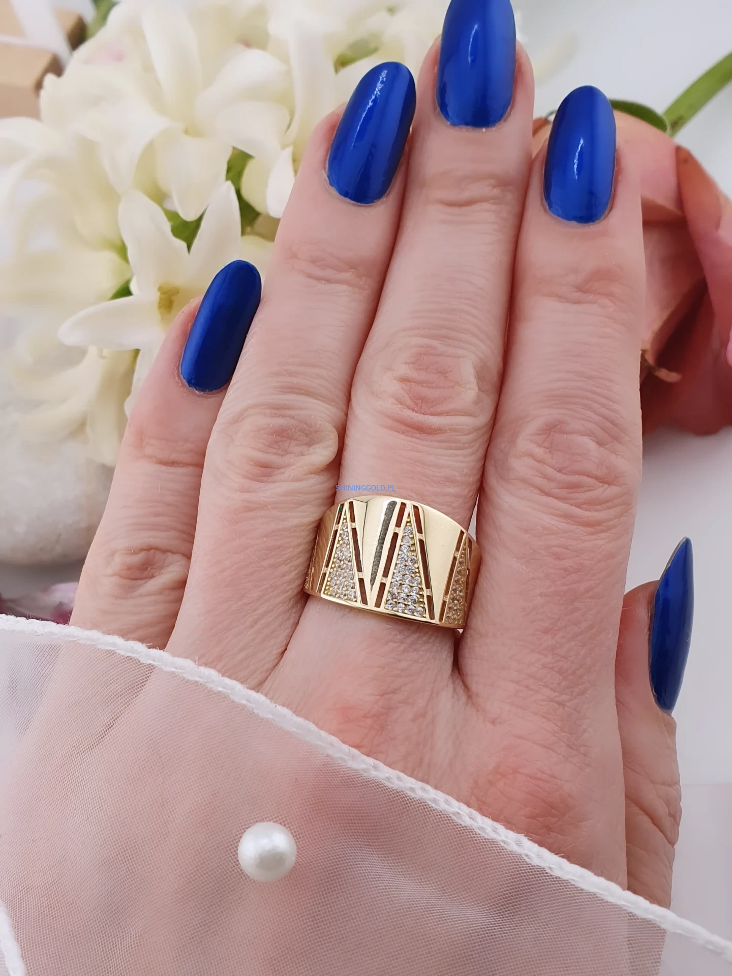 Złoty pierścionek z cyrkoniami – szeroki, geometryczny (060A)