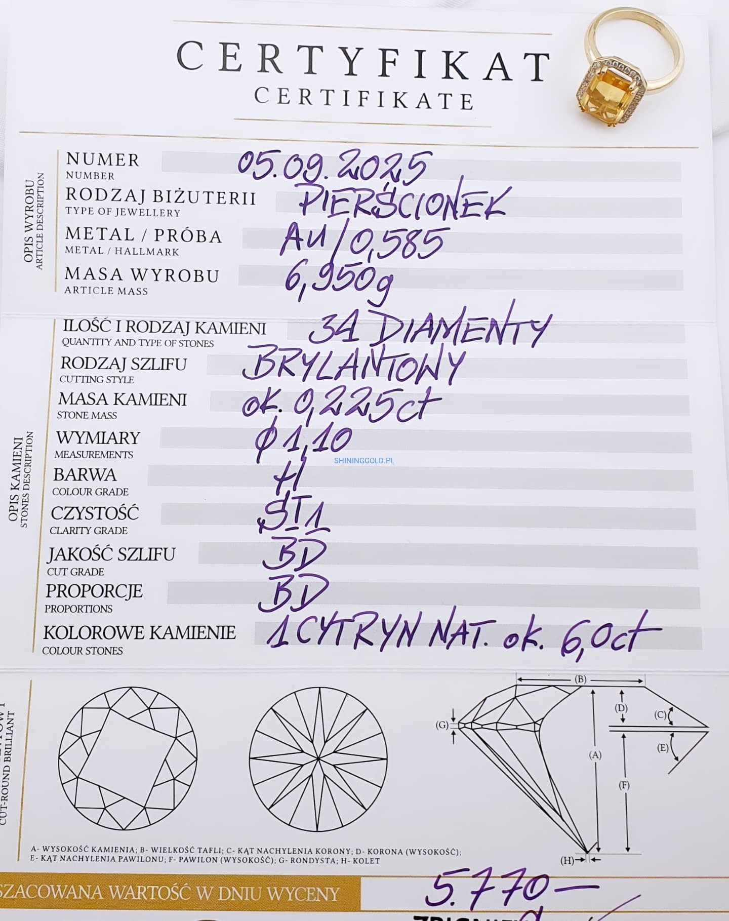 Złoty pierścionek z cytrynem i diamentami to biżuteria o wyjątkowym charakterze. Wykonany ze złota próby 585, zdobiony jest dużym, naturalnym cytrynem o masie 6,0 ct, którego słoneczny blask podkreślają 34 diamenty o łącznej masie 0,225 ct (czystość SI1, barwa H).