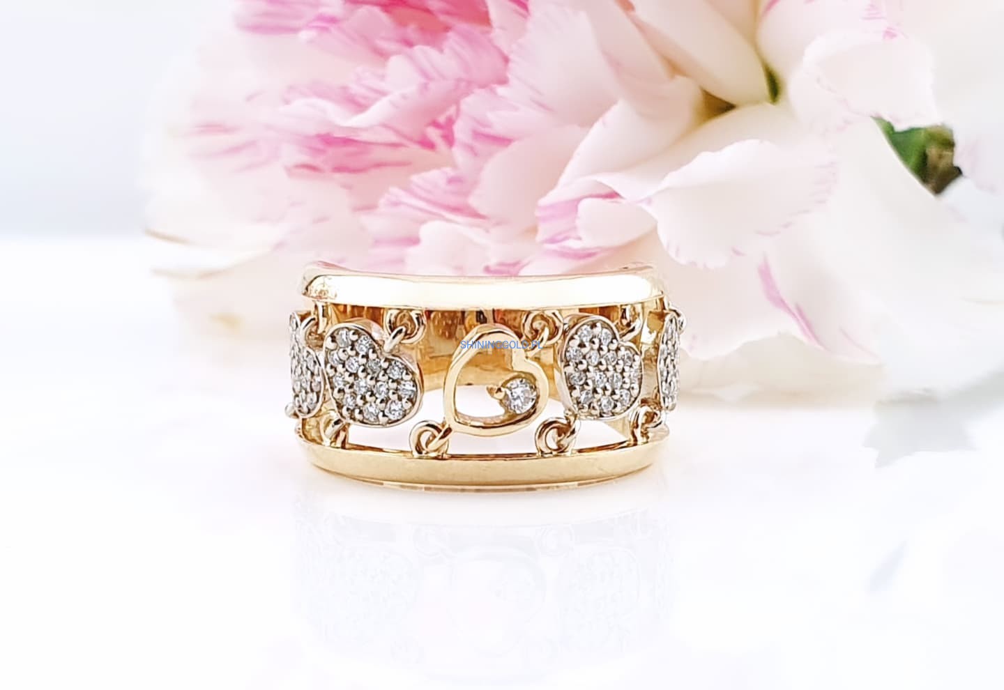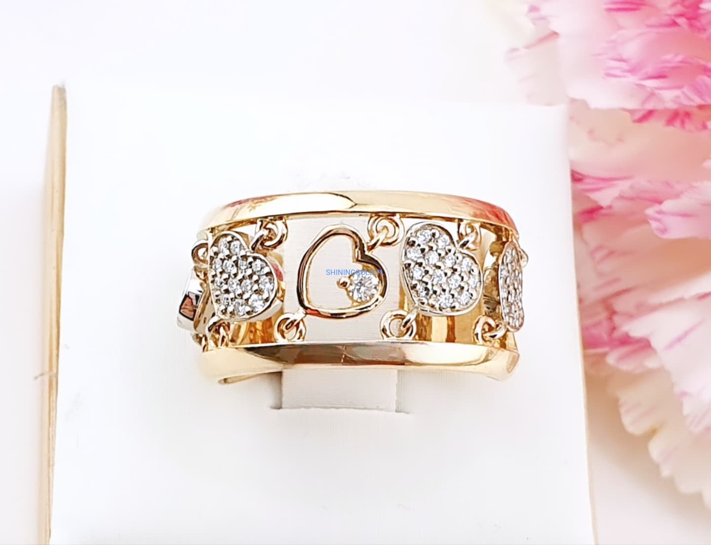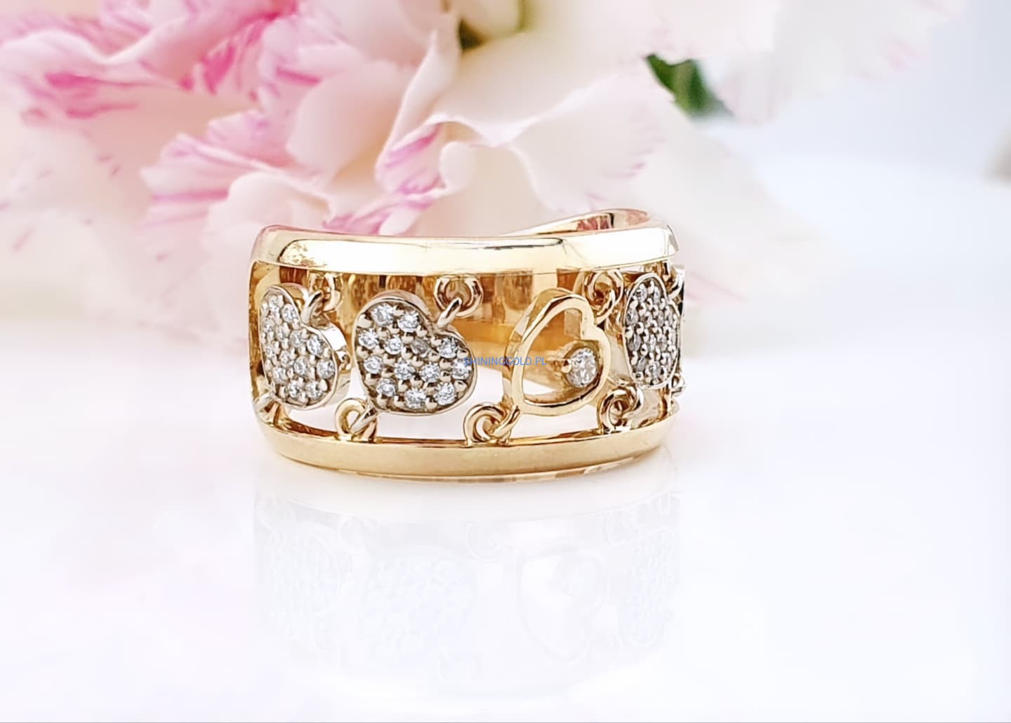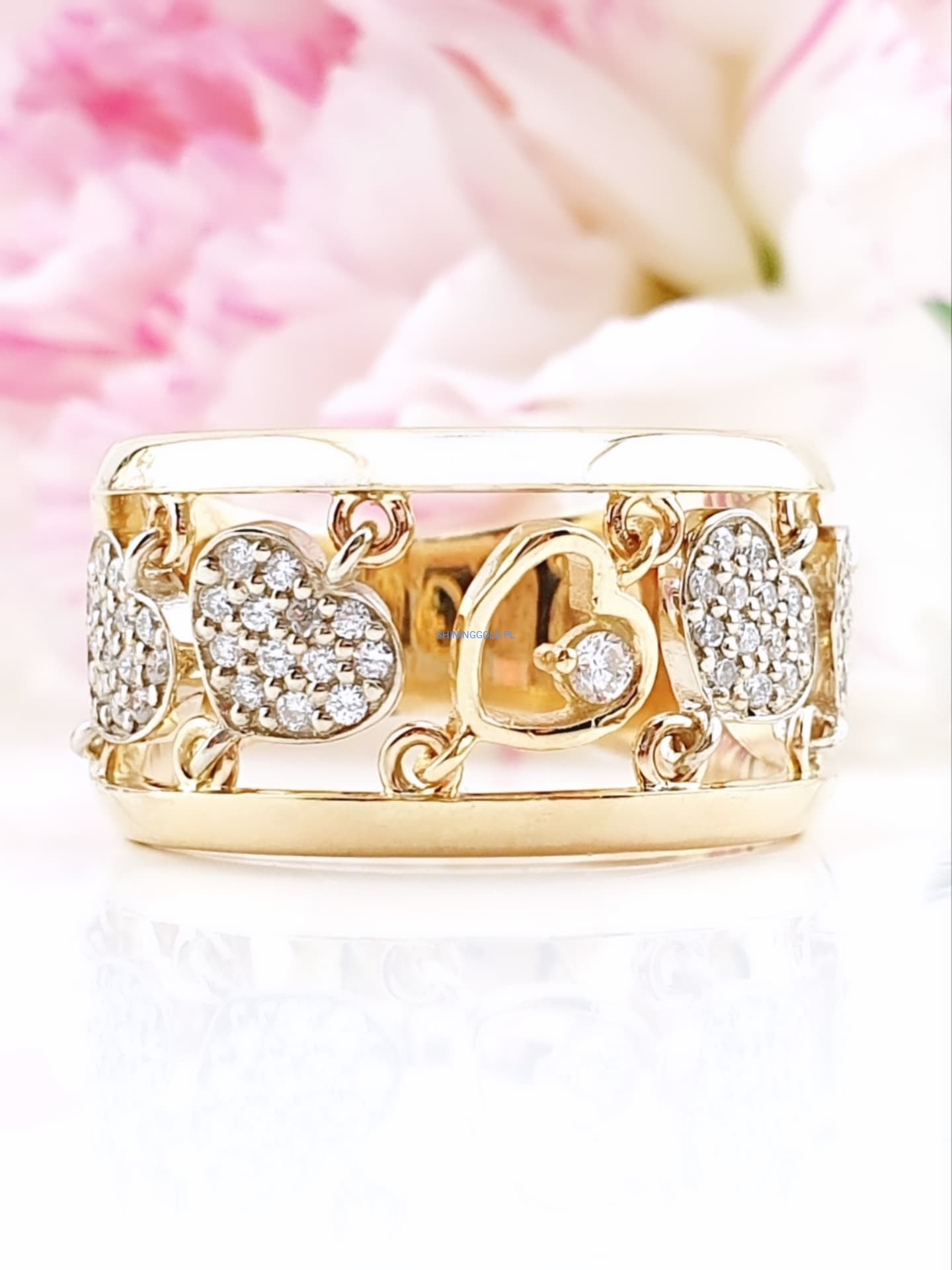 Złoty, nowy pierścionek z diamentami to wyjątkowa biżuteria, która zachwyca elegancją i blaskiem. Wykonany ze złota próby 585, ozdobiony został aż 53 diamentami o łącznej masie 0,338 ct. Kamienie o czystości SI1–2 i barwie H pięknie rozświetlają jubilerski wzór serc, nadając mu luksusowego charakteru.