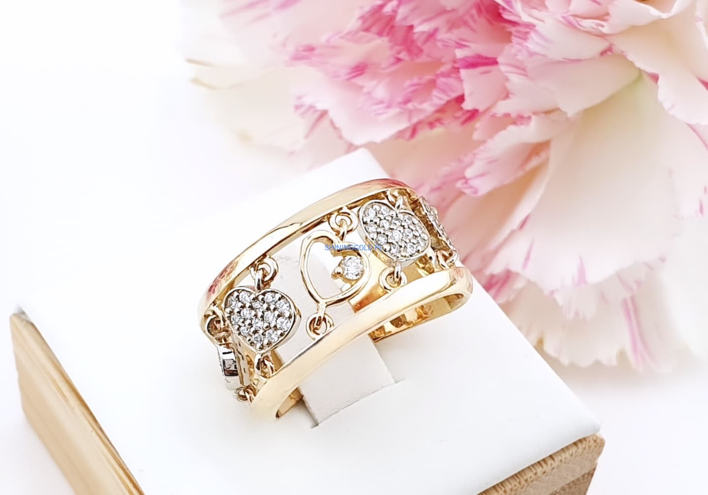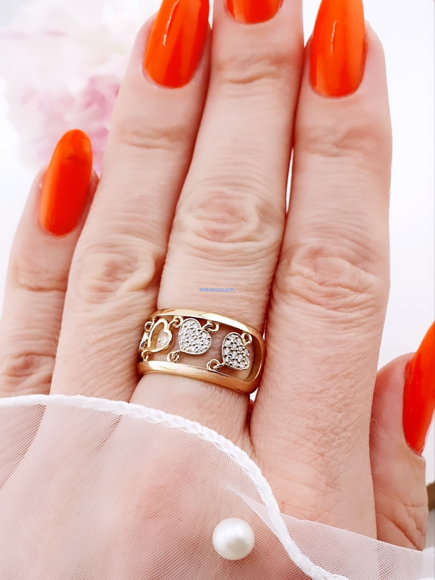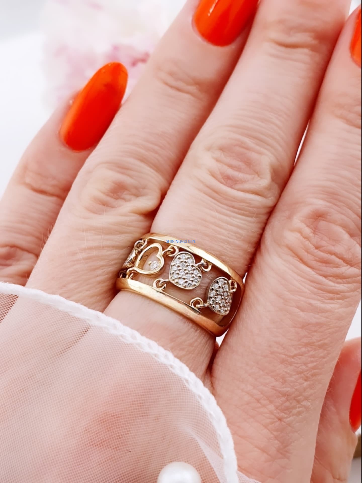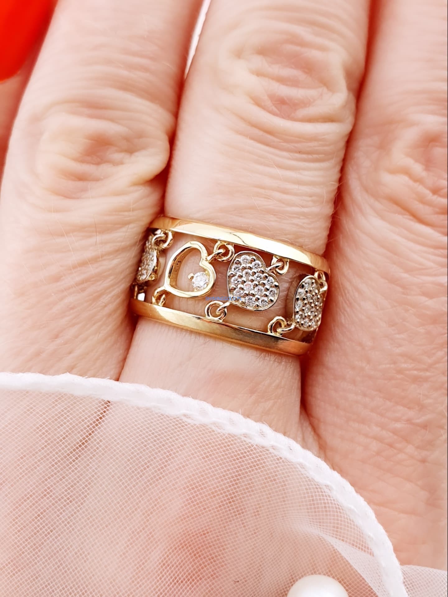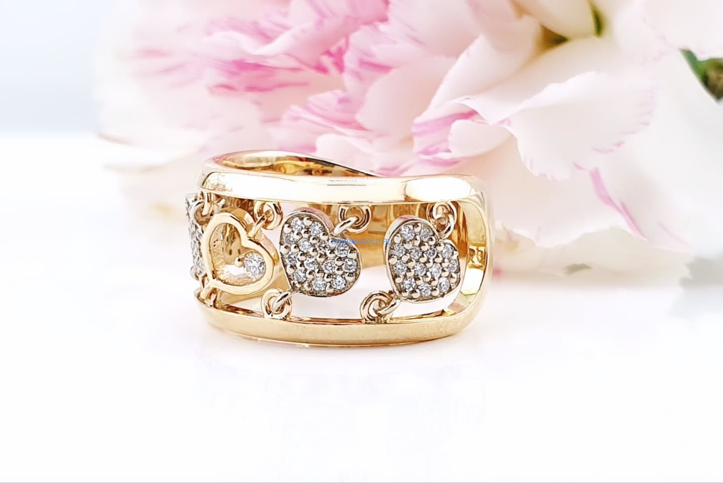 Złoty, nowy pierścionek z diamentami to wyjątkowa biżuteria, która zachwyca elegancją i blaskiem. Wykonany ze złota próby 585, ozdobiony został aż 53 diamentami o łącznej masie 0,338 ct. Kamienie o czystości SI1–2 i barwie H pięknie rozświetlają jubilerski wzór serc, nadając mu luksusowego charakteru.