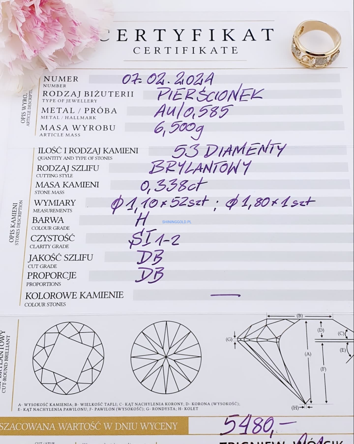Łączna masa diamentów: 0,338 ct