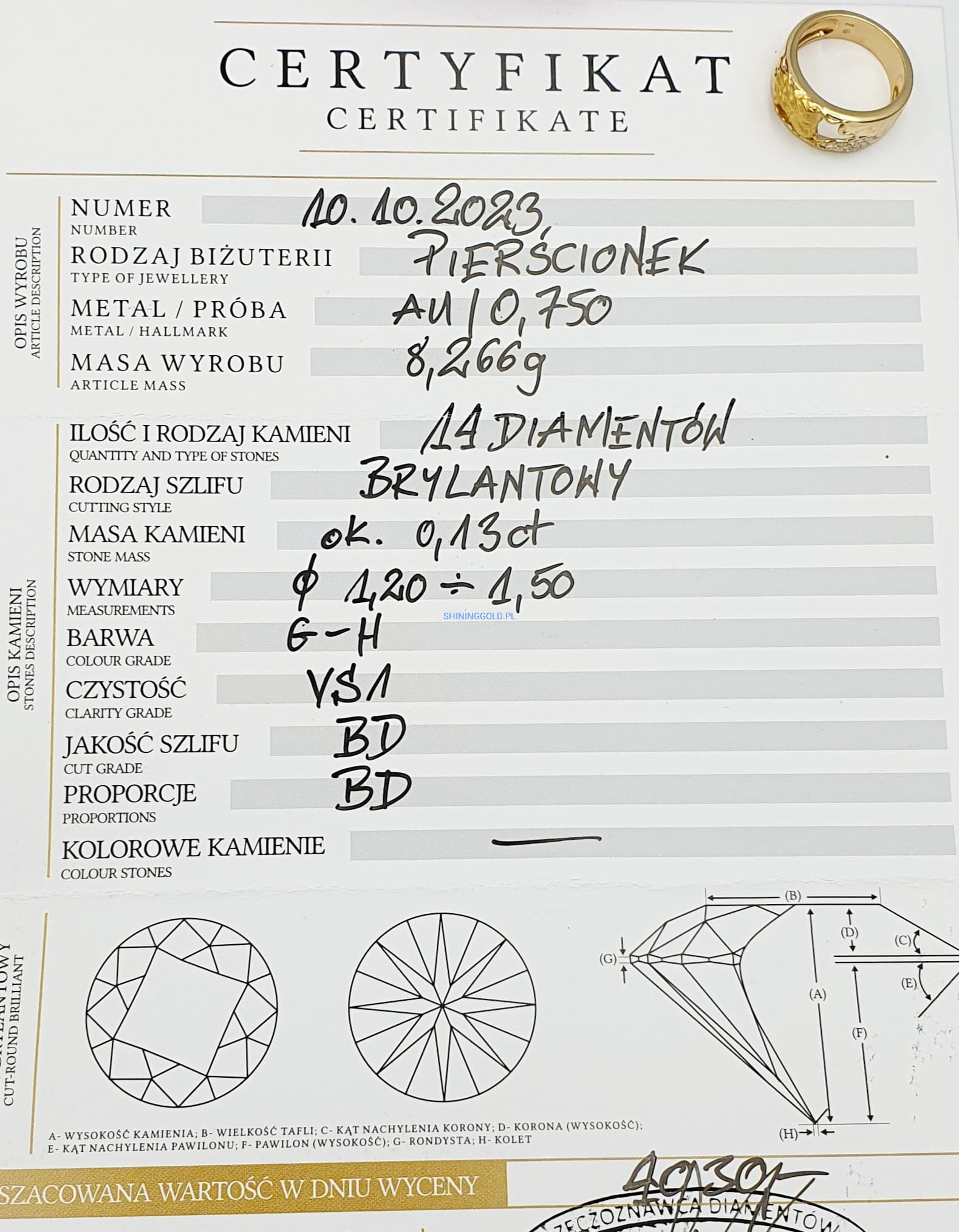 Złoty pierścionek z diamentami(1026.A)