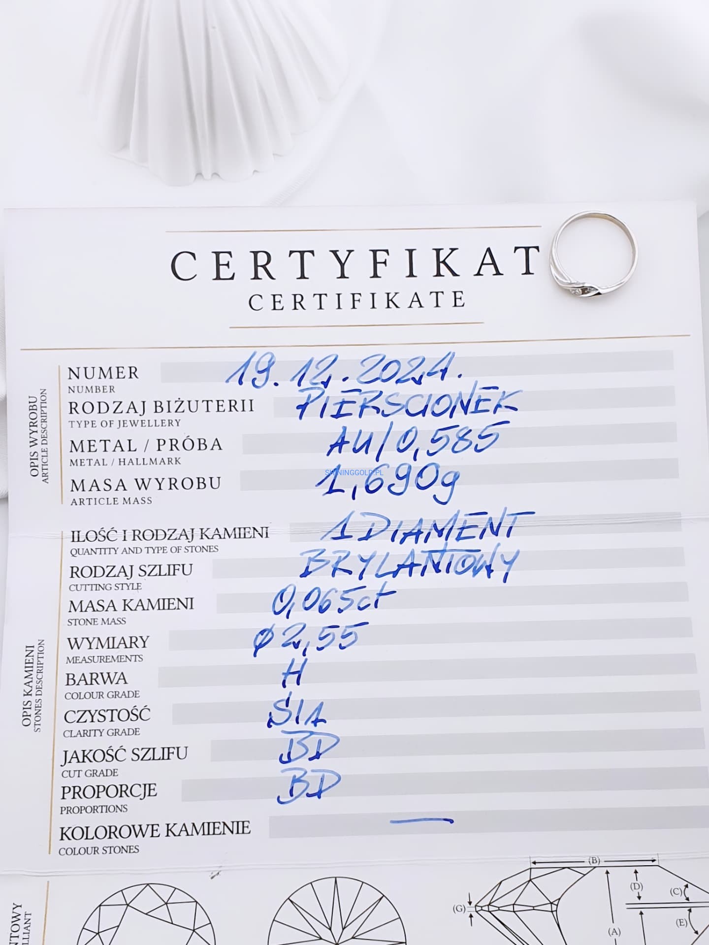 Delikatny złoty pierścionek z diamentem – subtelna biżuteria o wyjątkowym uroku. Wykonany ze złota próby 585, zdobiony diamentem o masie 0,065 ct (czystość SI1, barwa H), doskonale podkreśla elegancję i ponadczasowy styl.